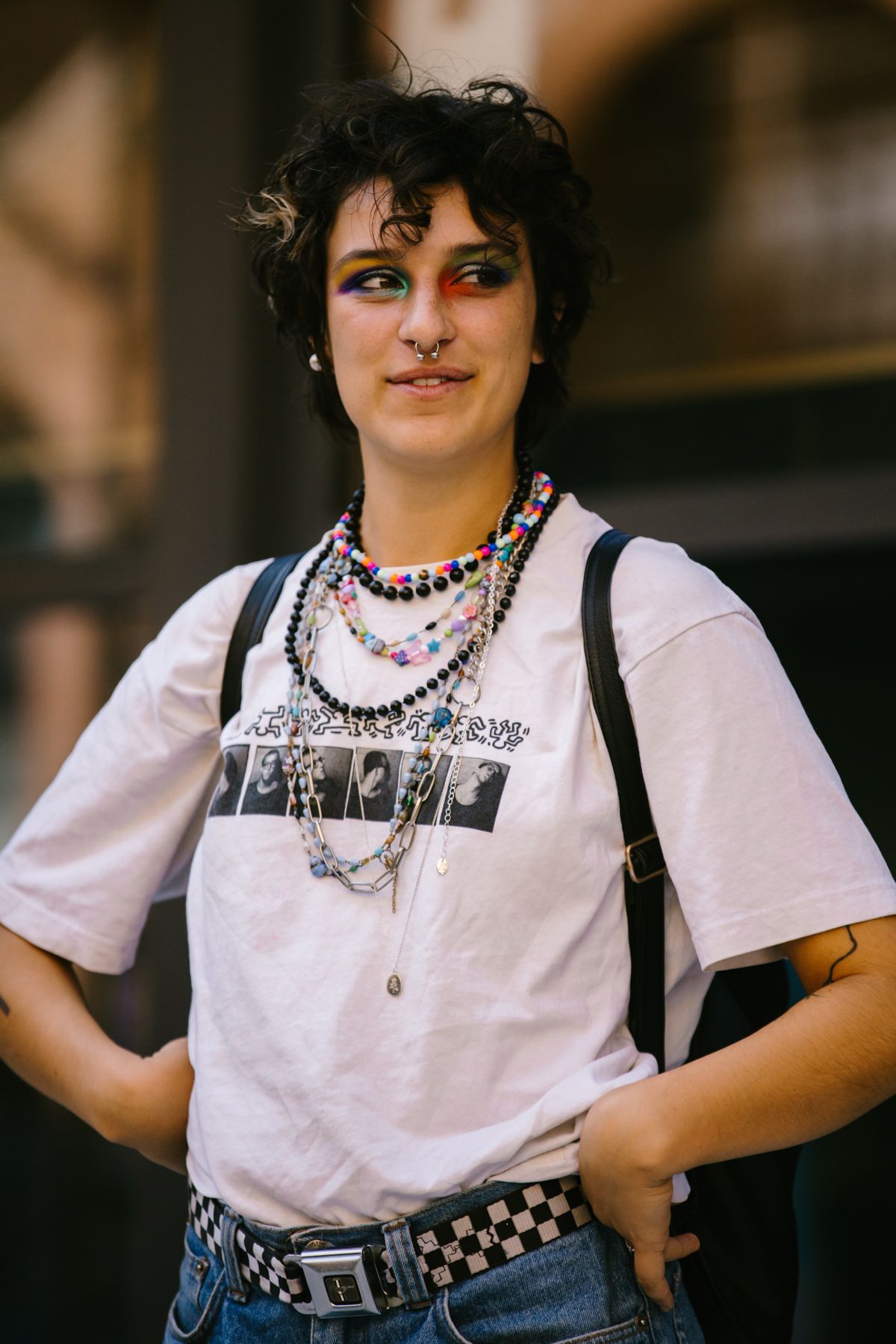 Sharp manicures are back, even sharper than they sported in the 2000s era. At Christian Cowan, they are transparent, with a pearl finish, and a silver French fringe. Luar chose them instead in a matte beige, with the pinky studded with crystals. Blue jeans and gold for The Blonds, which pairs them with sparkling crystals. Alice + Olivia opts instead for a razor-sharp rainbow manicure, all mismatched.