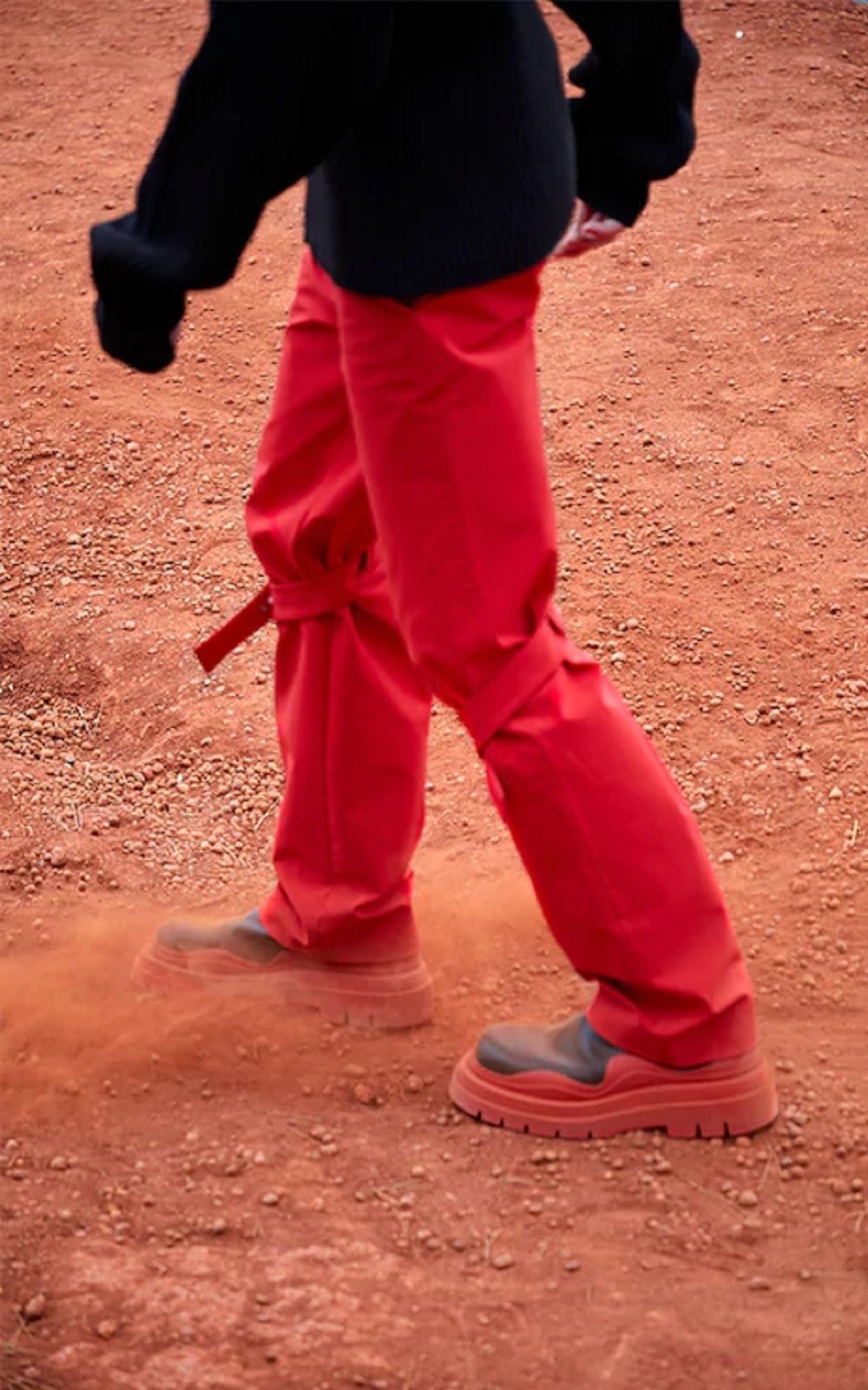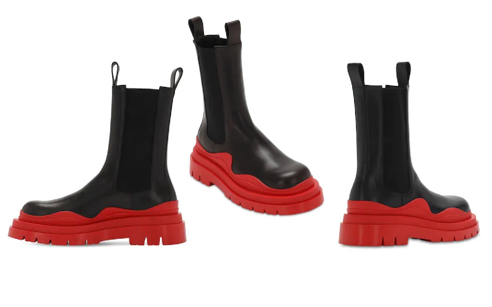 The same exclusive colour palette provides an even cooler look for the BV Tire boots which feature a dark brown leather upper and a bright red contrasting rubber tank sole.