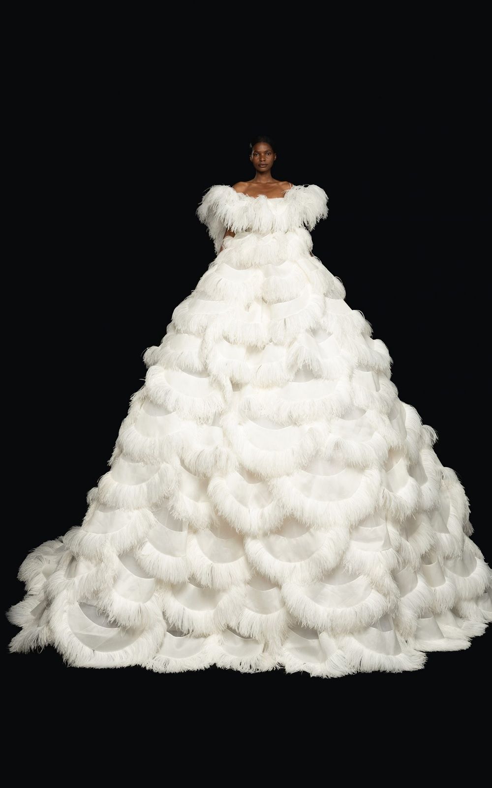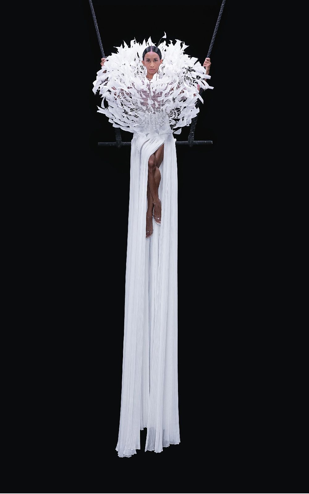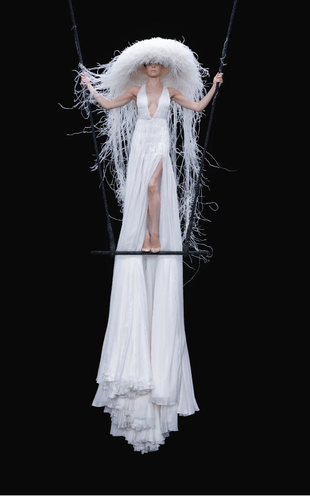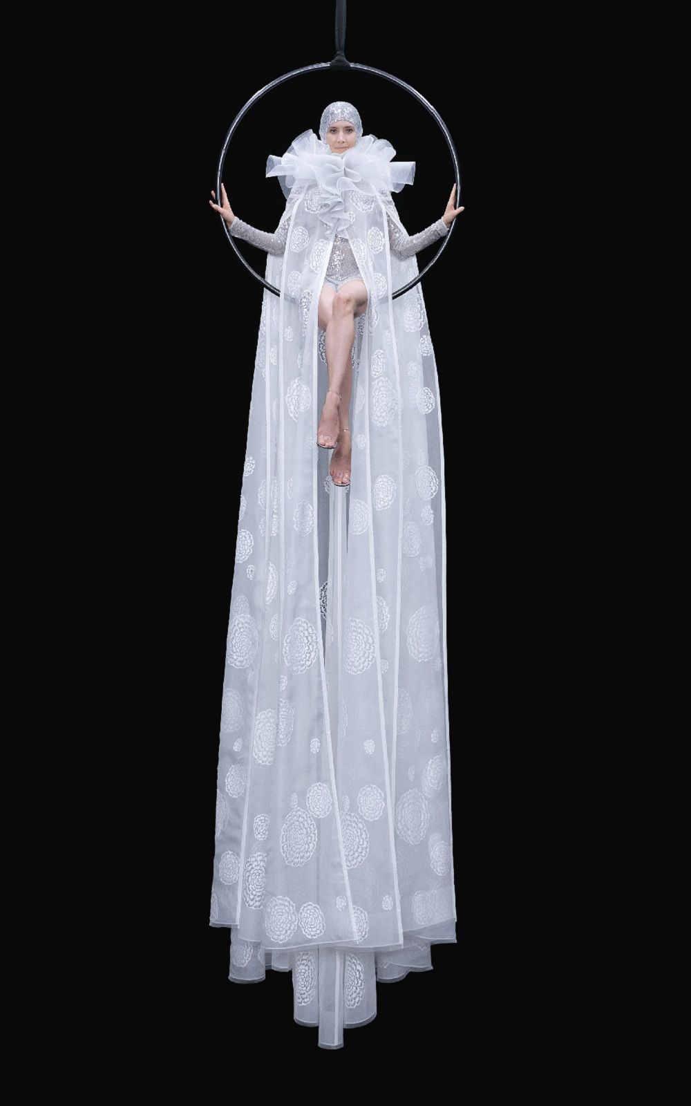 Among feathers, flowers, bows and colors, the models are suspended like acrobat fairies, hung like beautiful birds on swings and hula hoops, while the music of Fka Twigs gives voice to this dream. They wear true artworks: the bustier dress in taffeta and the one in chiffon and feathers; the puffy pleated dress; the tundra, organza and white tulle coat with ruffles; the fourreau dress in ivory organza with hood; the item in nude tulle covered with sequined fringes and iridescent Japanese thread. All very long, with meters of ruffles and fabric.