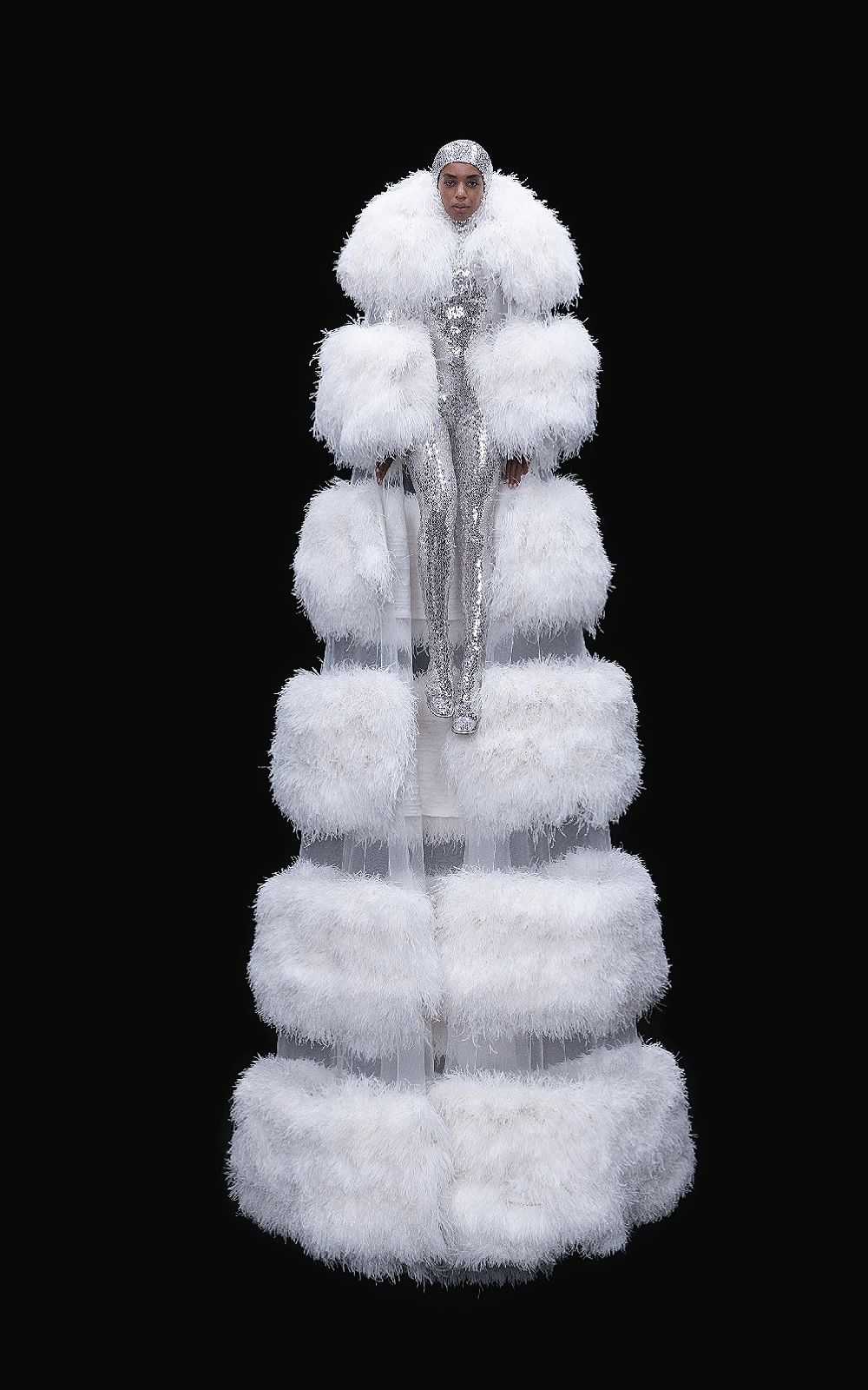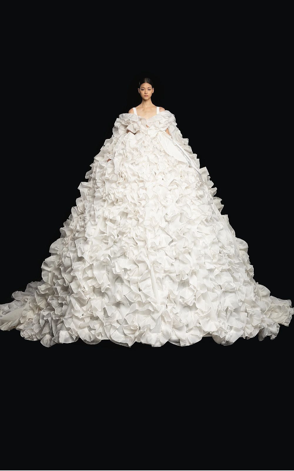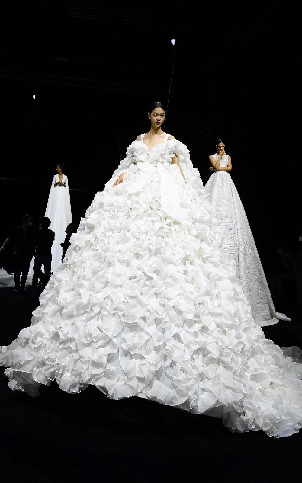 Among feathers, flowers, bows and colors, the models are suspended like acrobat fairies, hung like beautiful birds on swings and hula hoops, while the music of Fka Twigs gives voice to this dream. They wear true artworks: the bustier dress in taffeta and the one in chiffon and feathers; the puffy pleated dress; the tundra, organza and white tulle coat with ruffles; the fourreau dress in ivory organza with hood; the item in nude tulle covered with sequined fringes and iridescent Japanese thread. All very long, with meters of ruffles and fabric.