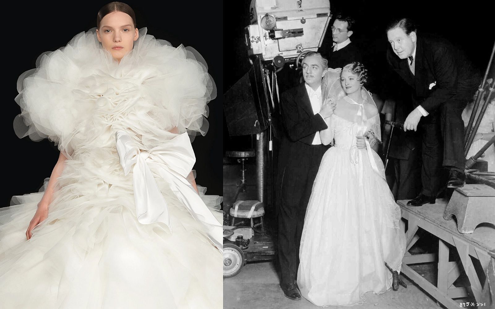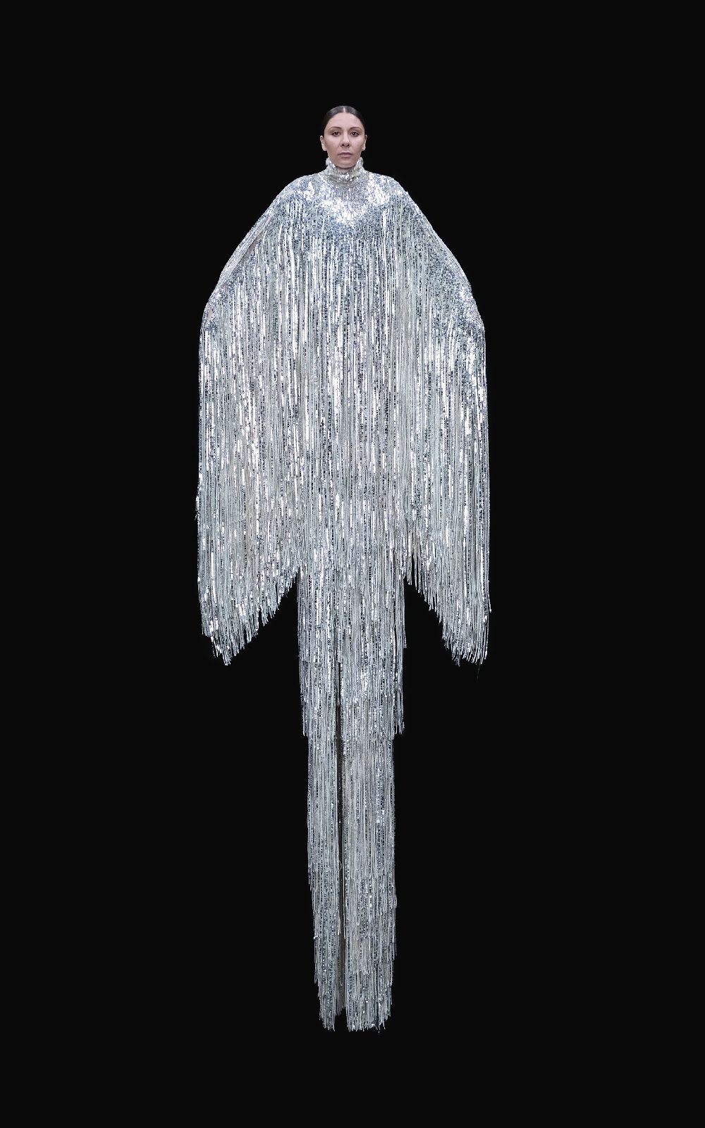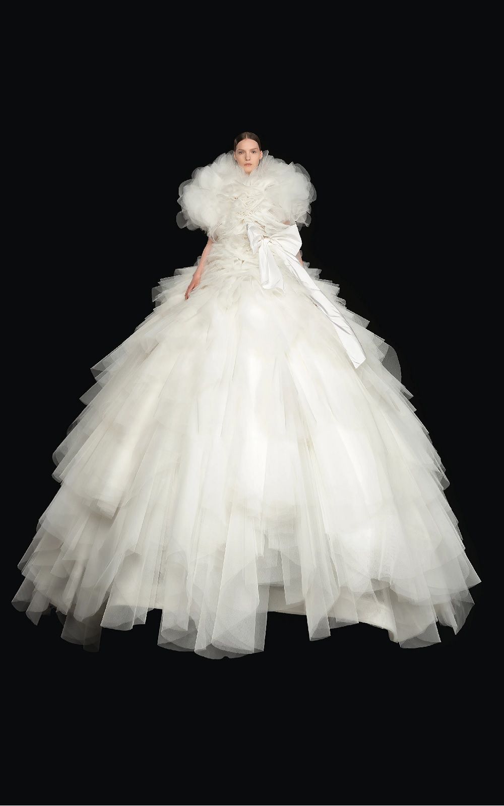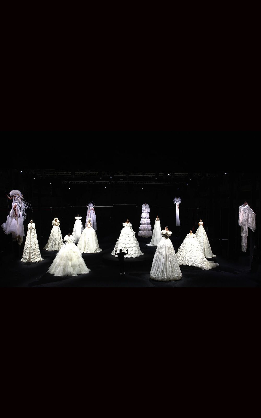 Among feathers, flowers, bows and colors, the models are suspended like acrobat fairies, hung like beautiful birds on swings and hula hoops, while the music of Fka Twigs gives voice to this dream. They wear true artworks: the bustier dress in taffeta and the one in chiffon and feathers; the puffy pleated dress; the tundra, organza and white tulle coat with ruffles; the fourreau dress in ivory organza with hood; the item in nude tulle covered with sequined fringes and iridescent Japanese thread. All very long, with meters of ruffles and fabric.