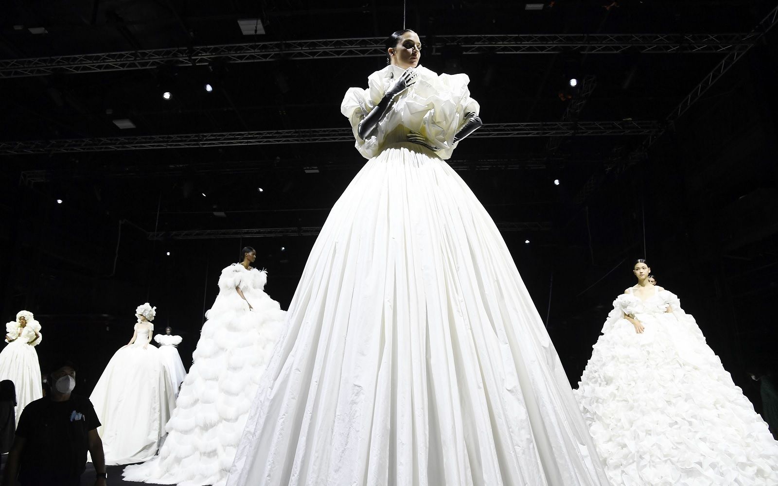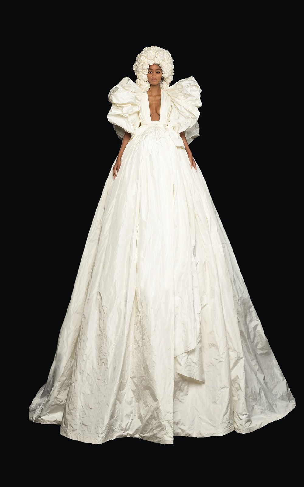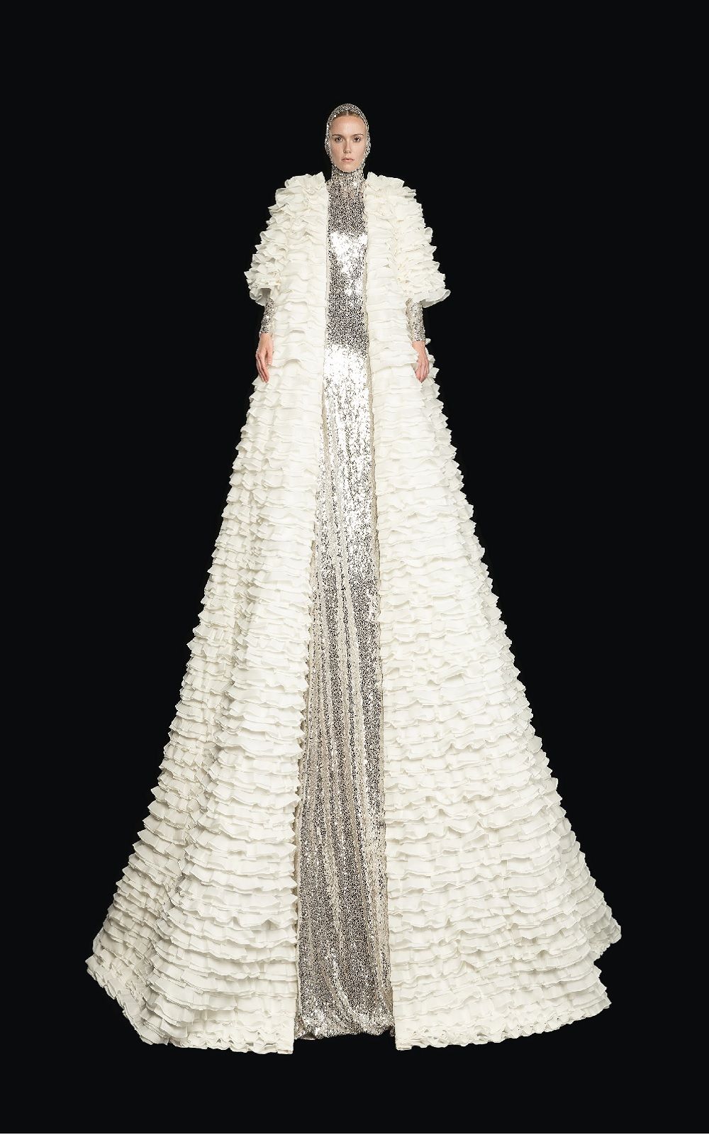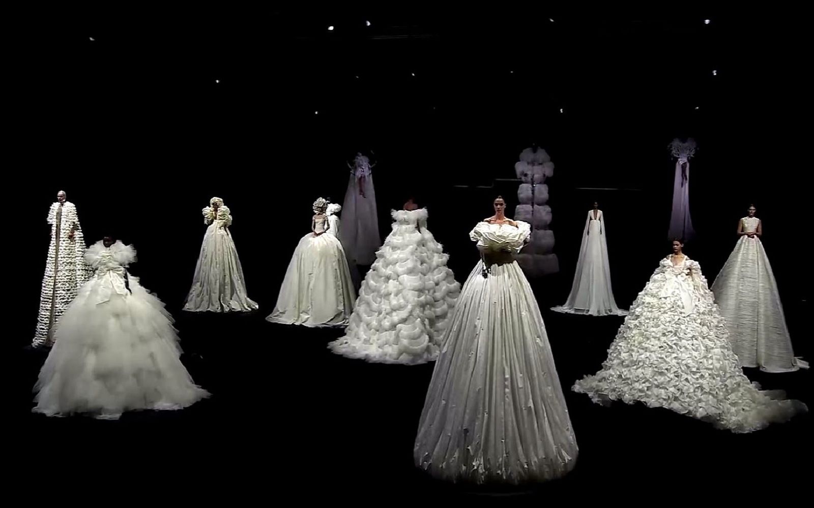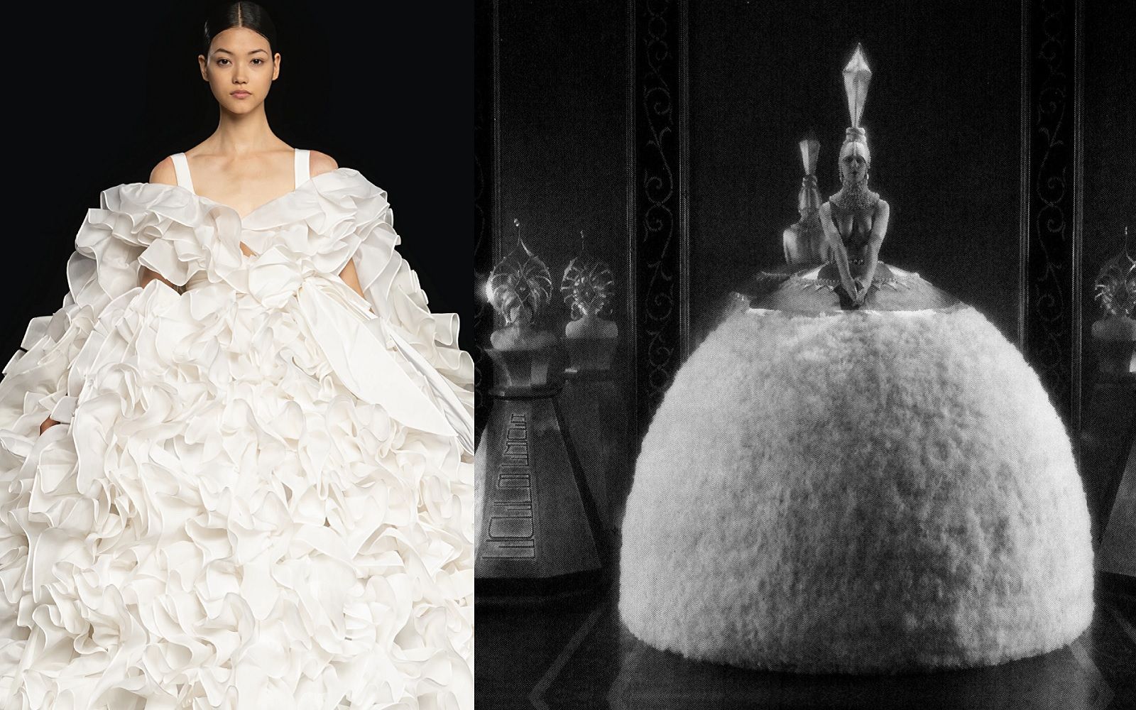 Two weeks after the first Paris Digital Fashion Week dedicated to haute couture, Valentino presents its Fall 2020-2021 Couture collection by painting a tableau vivant made of light and poetry in the Cinecittà studios. Pierpaolo Piccioli brings on stage 16 white dresses, with exaggerated silhouettes, vaporous sculptures of taffeta and glitter of the consistency of clouds that, as if by magic, emerge from the total darkness of the salt thanks to the plays of light projected by Nick Knight. As symbolic immaculate canvases on which he rebuilds the future of fashion, the English artist projects shapes, motifs and prints inspired by the four elements.