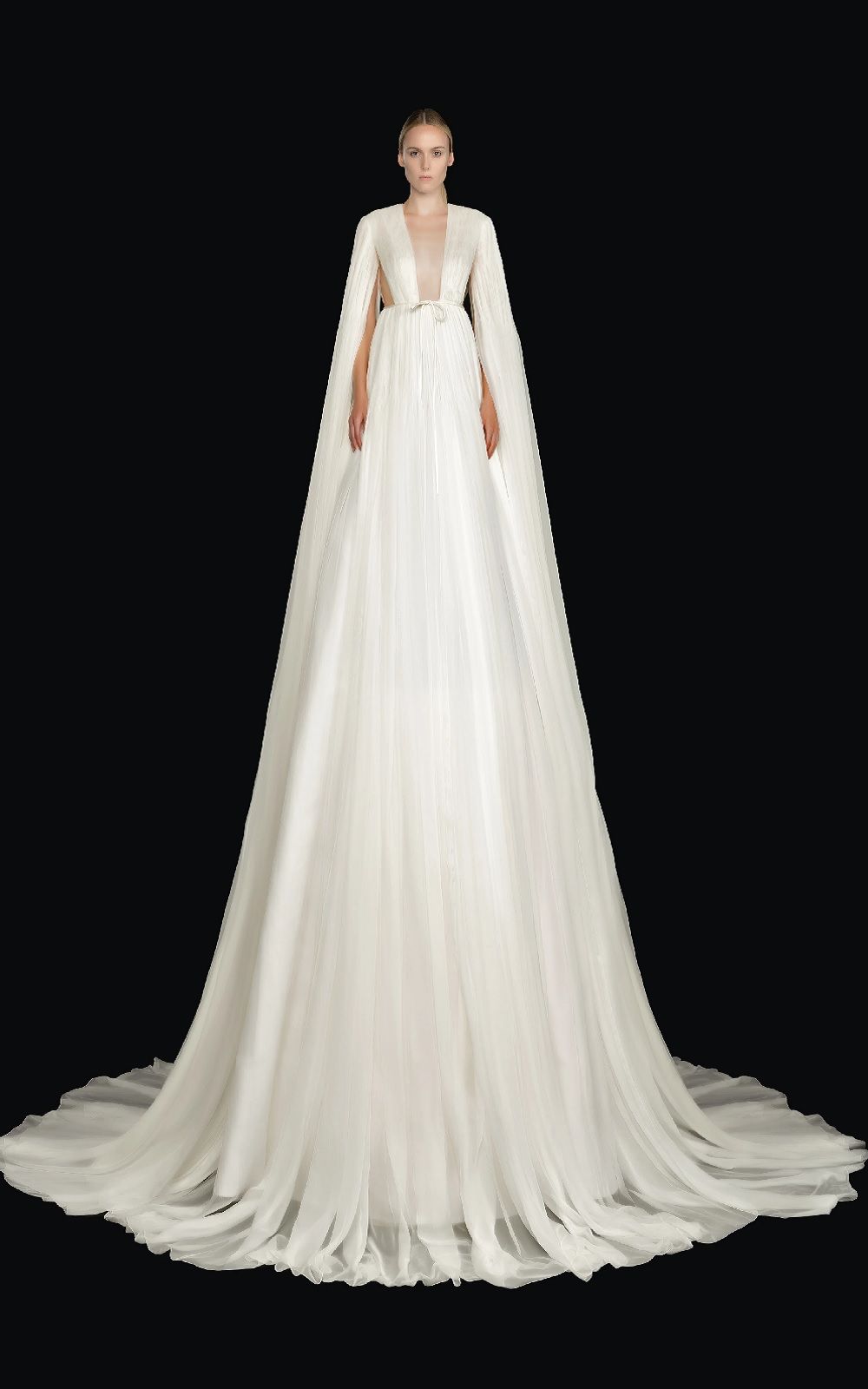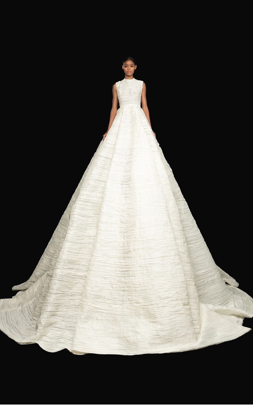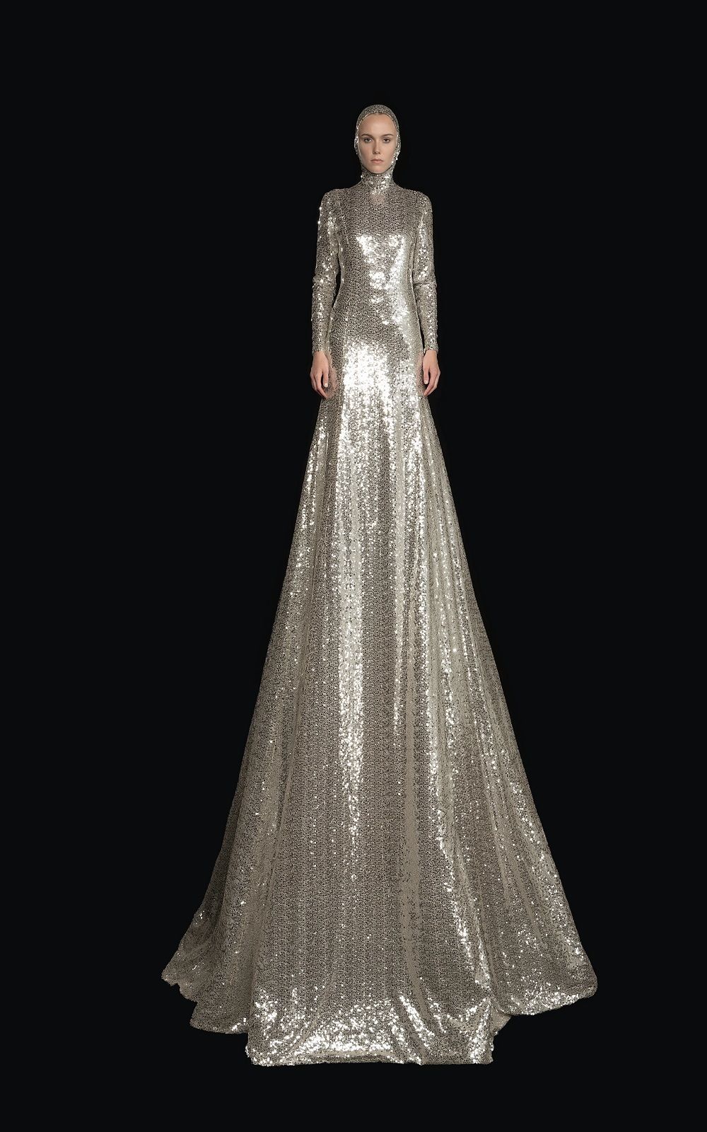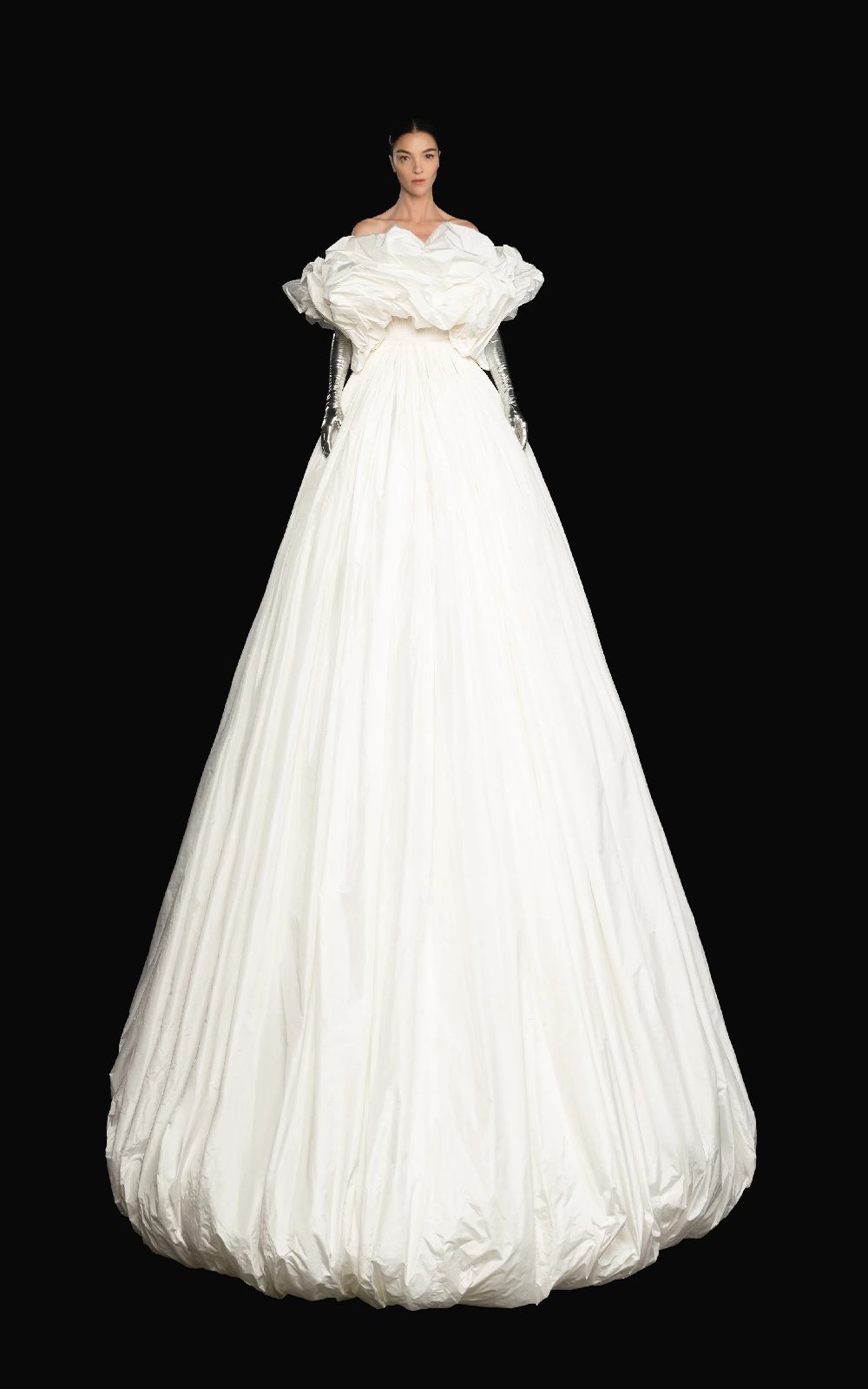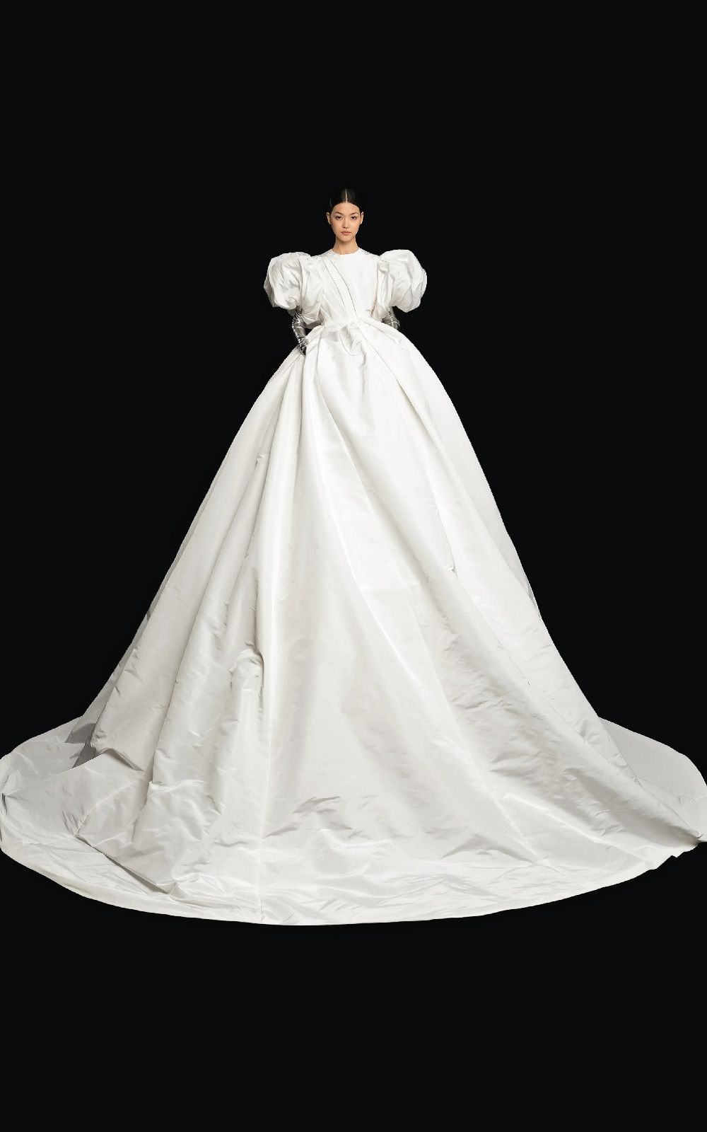 Two weeks after the first Paris Digital Fashion Week dedicated to haute couture, Valentino presents its Fall 2020-2021 Couture collection by painting a tableau vivant made of light and poetry in the Cinecittà studios. Pierpaolo Piccioli brings on stage 16 white dresses, with exaggerated silhouettes, vaporous sculptures of taffeta and glitter of the consistency of clouds that, as if by magic, emerge from the total darkness of the salt thanks to the plays of light projected by Nick Knight. As symbolic immaculate canvases on which he rebuilds the future of fashion, the English artist projects shapes, motifs and prints inspired by the four elements.