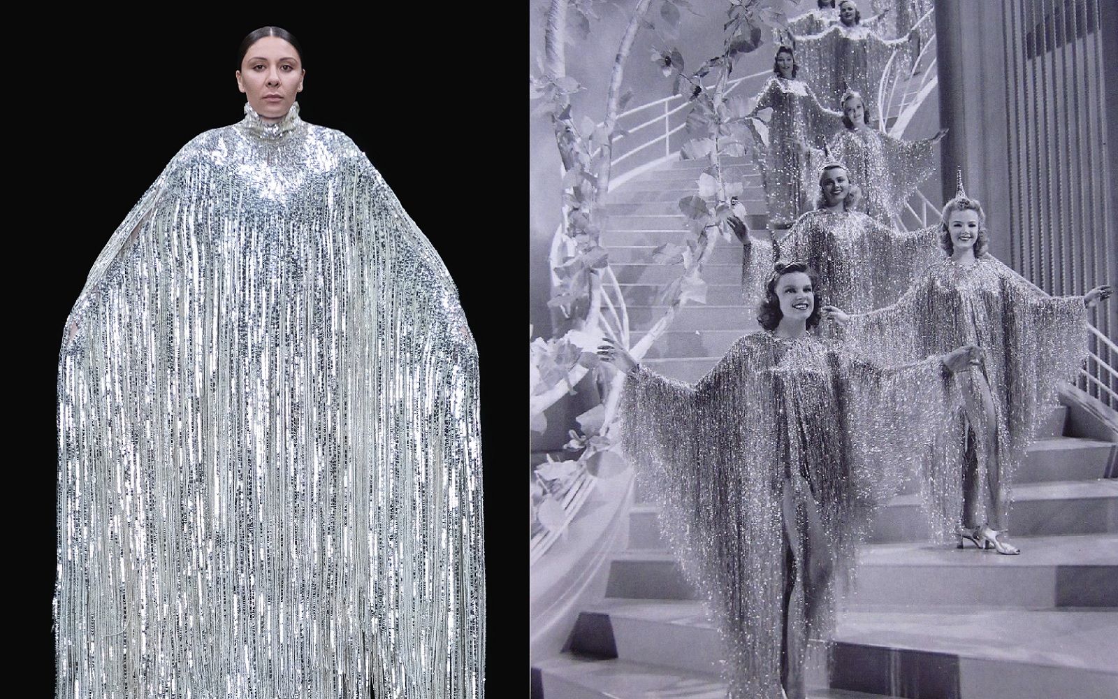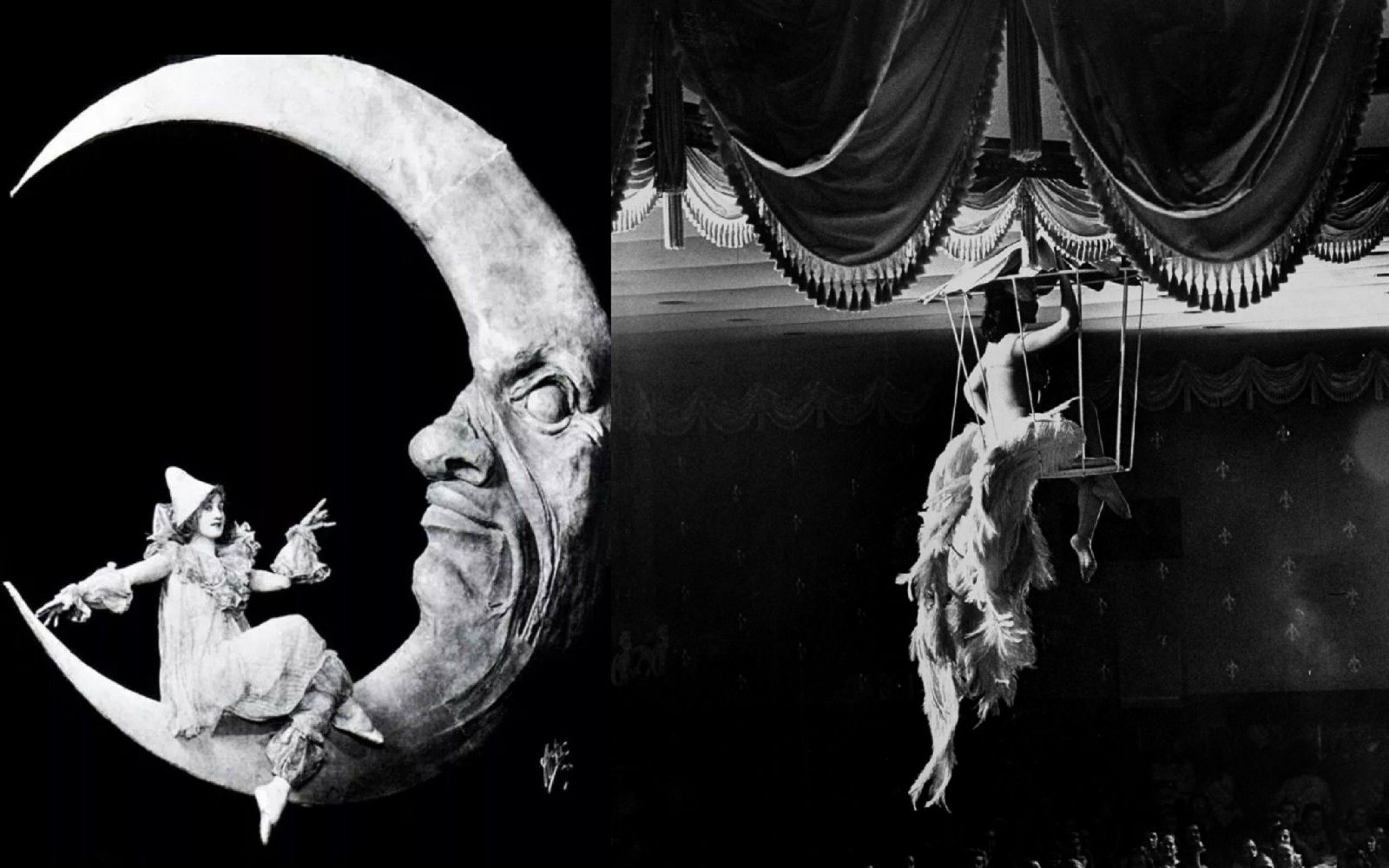 Mariacarla Boscono, Vittoria Ceretti and the other models suspended in the air like angels, ethereal acrobats wrapped in long white dresses that come to life illuminating with colors and shapes evoking the vintage images of Le Cirque de la Lune, of movies directed by Robert Z. Leonard like The Great Ziegfeld and Bright Lights, iconic dancers like Harriet Hoctor and Loie Fuller, the illustrations of Mucha and Toulouse-Lautrec but also the most dreamlike fragments of Federico Fellini's works.