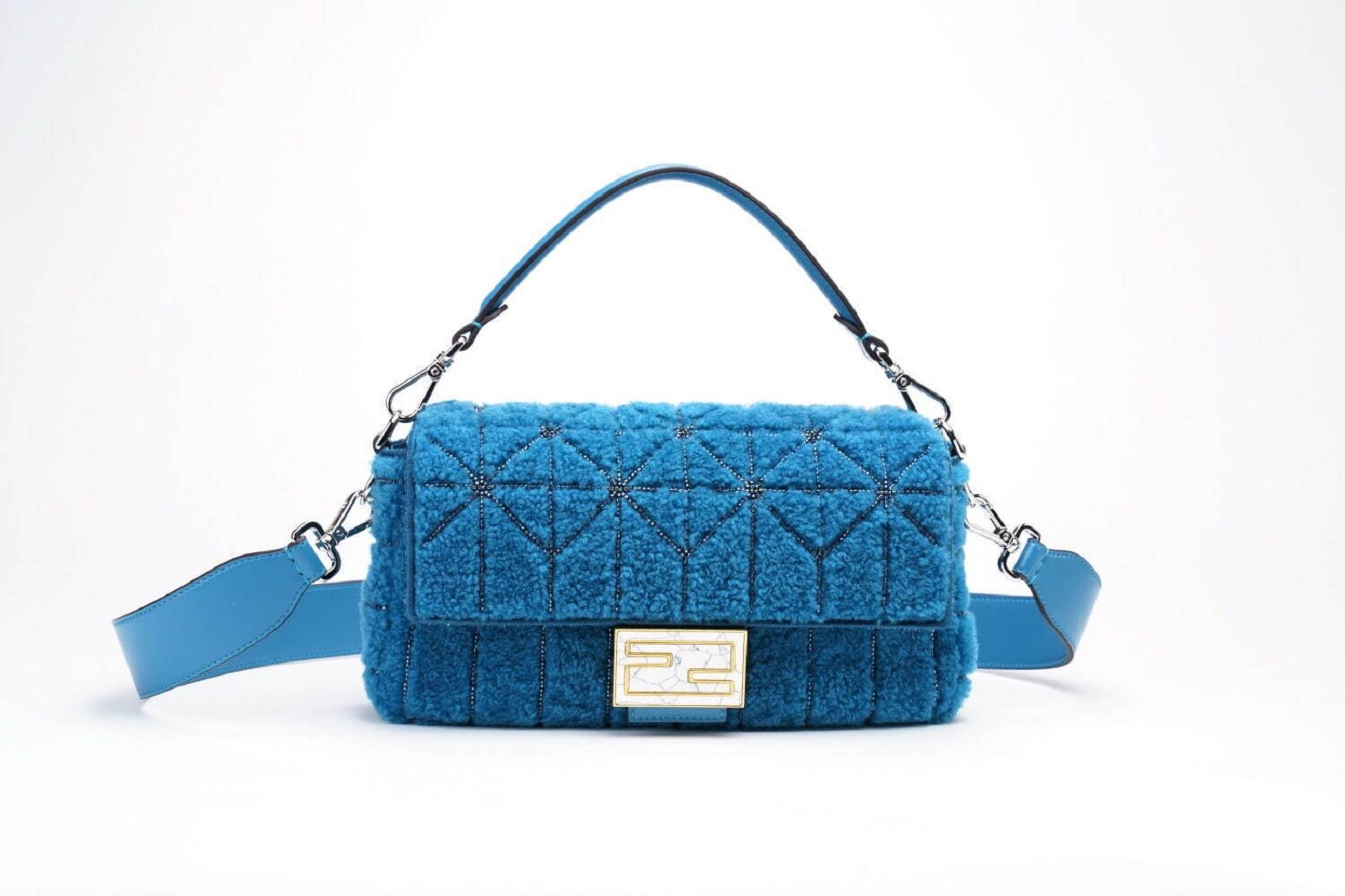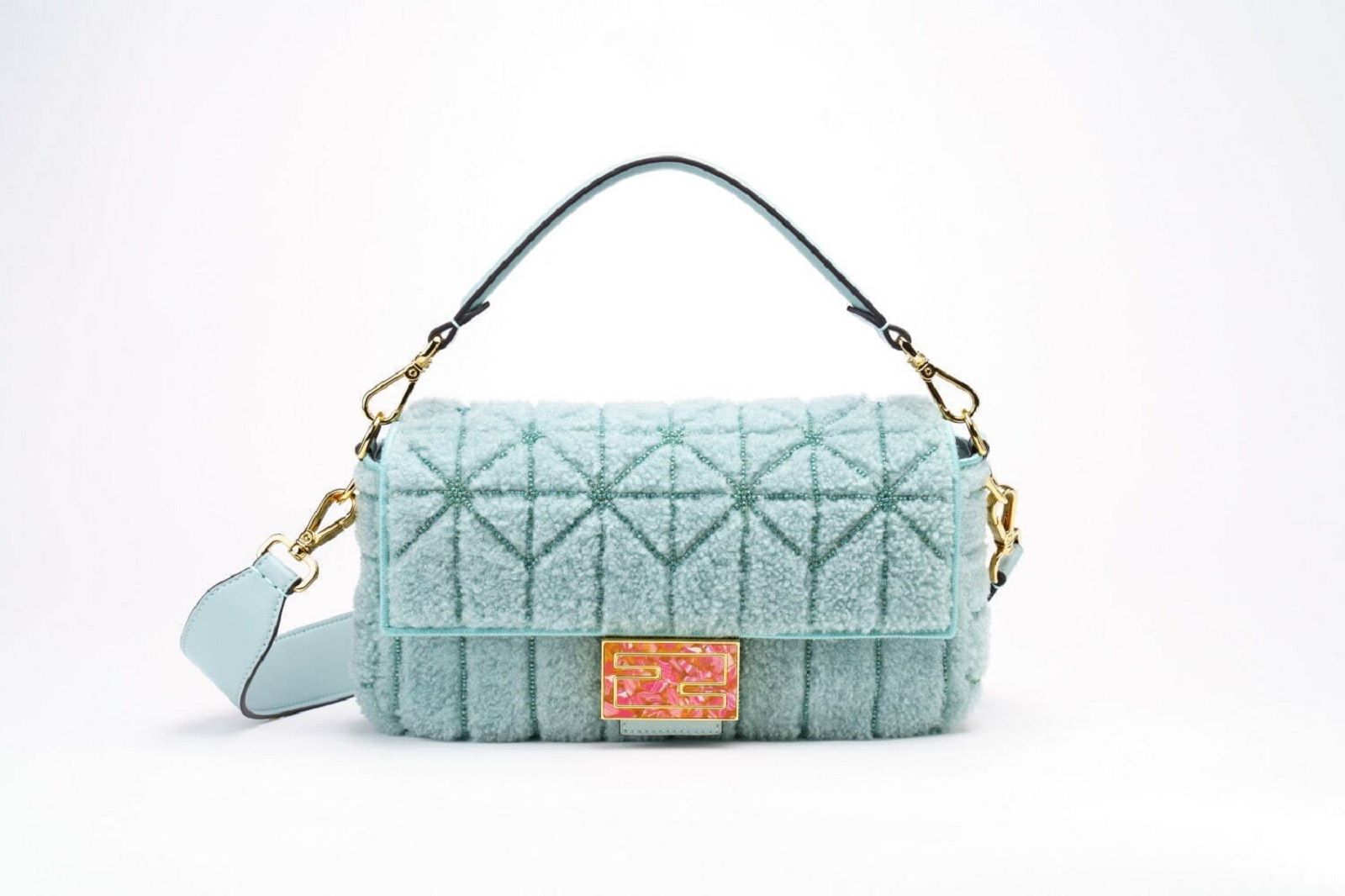 Baguette's main silhouette, on the other hand, can be chosen from three different versions. The first is made of shearling material featuring embroidery in small ton sur ton beads, which create a geometric and symmetrical matelassé pattern. The second one is made of quilted velvet with small crystals. Finally, the third model is decorated with all-over sequin embroidery.