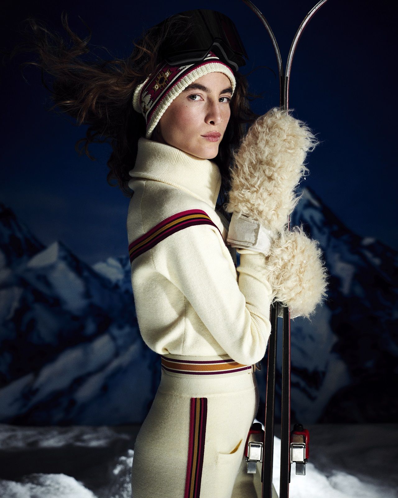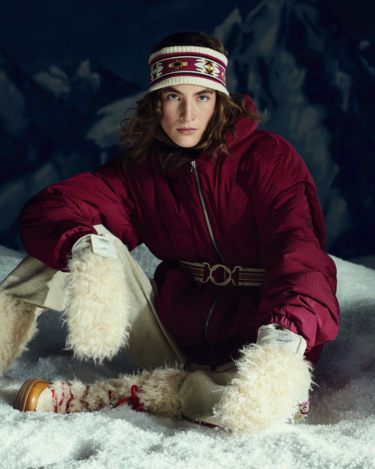 Presented with an editorial shot by photographer Ferry van der Nat and starring model Heather Kemesky, the capsule collection revisits the typical style of the world of skiing with a series of modern and contemporary looks. The result is 33 pieces designed to face the slopes with style and declined in a palette of beige, burgundy and yellow with metallic touches. Among the highlights of the collection there are down jackets, ski pants, warm gloves and hats, comfortable loungewear sets, a shearling vest and snow boots perfect for a relaxing evening in the cabin, spent dining and chatting with friends in front of a crackling fireplace.