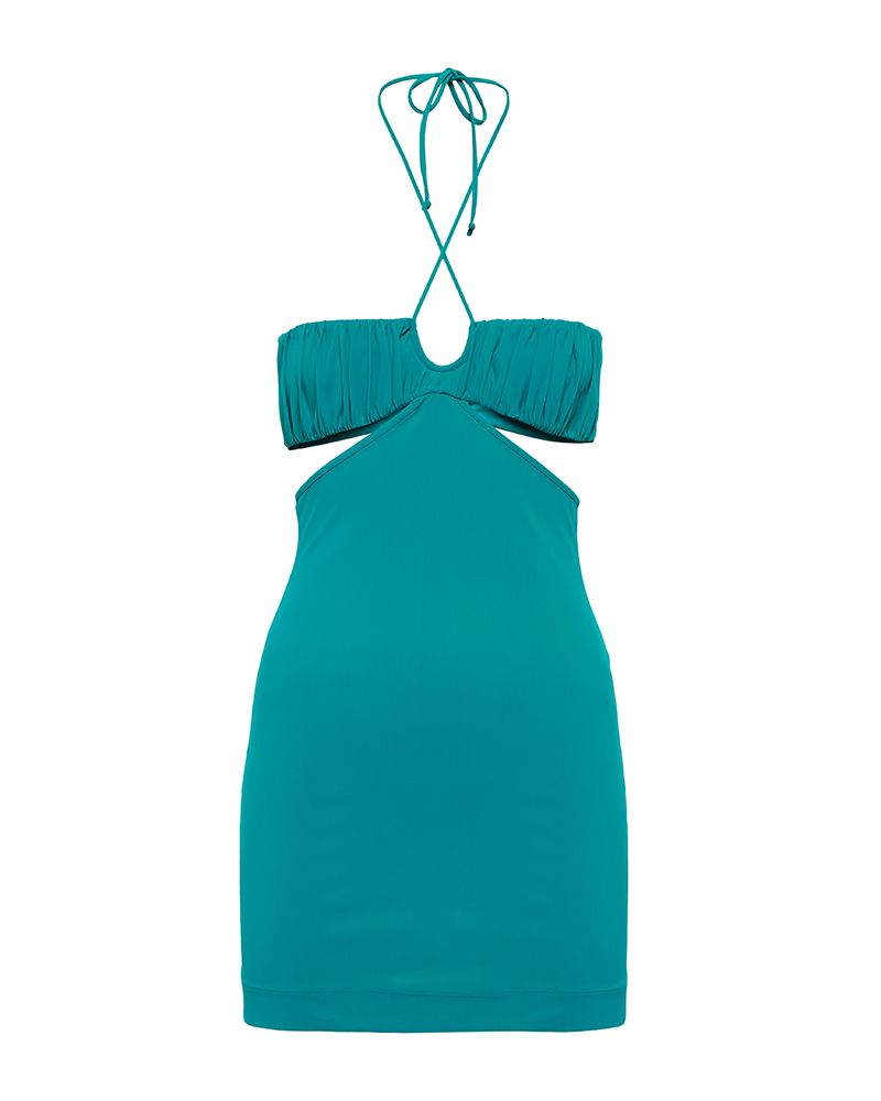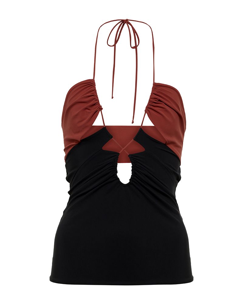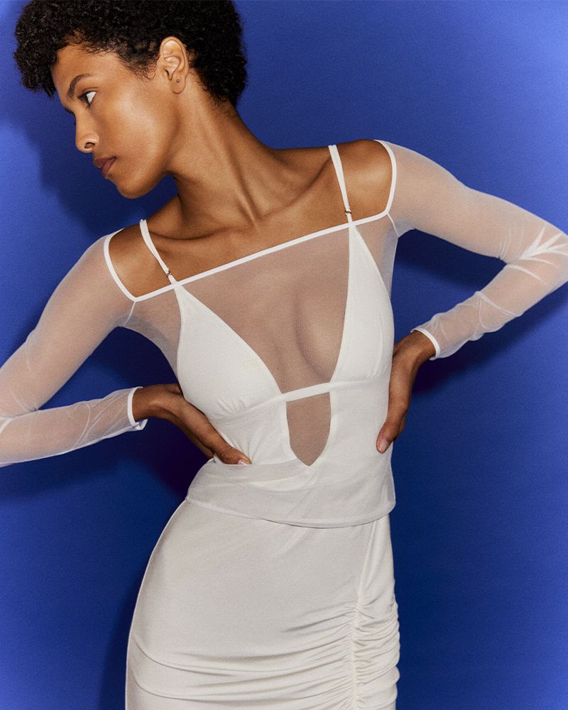 The brand's distinctive aesthetic is then declined in 60 ready-to-wear pieces that include the brand's must-haves such as classic body-hugging mini dresses with plunging necklines and asymmetries, mini wrap skirts, crop tops with American necklines in shades such as orange, turquoise, pink and earthy browns moving away from classic black.