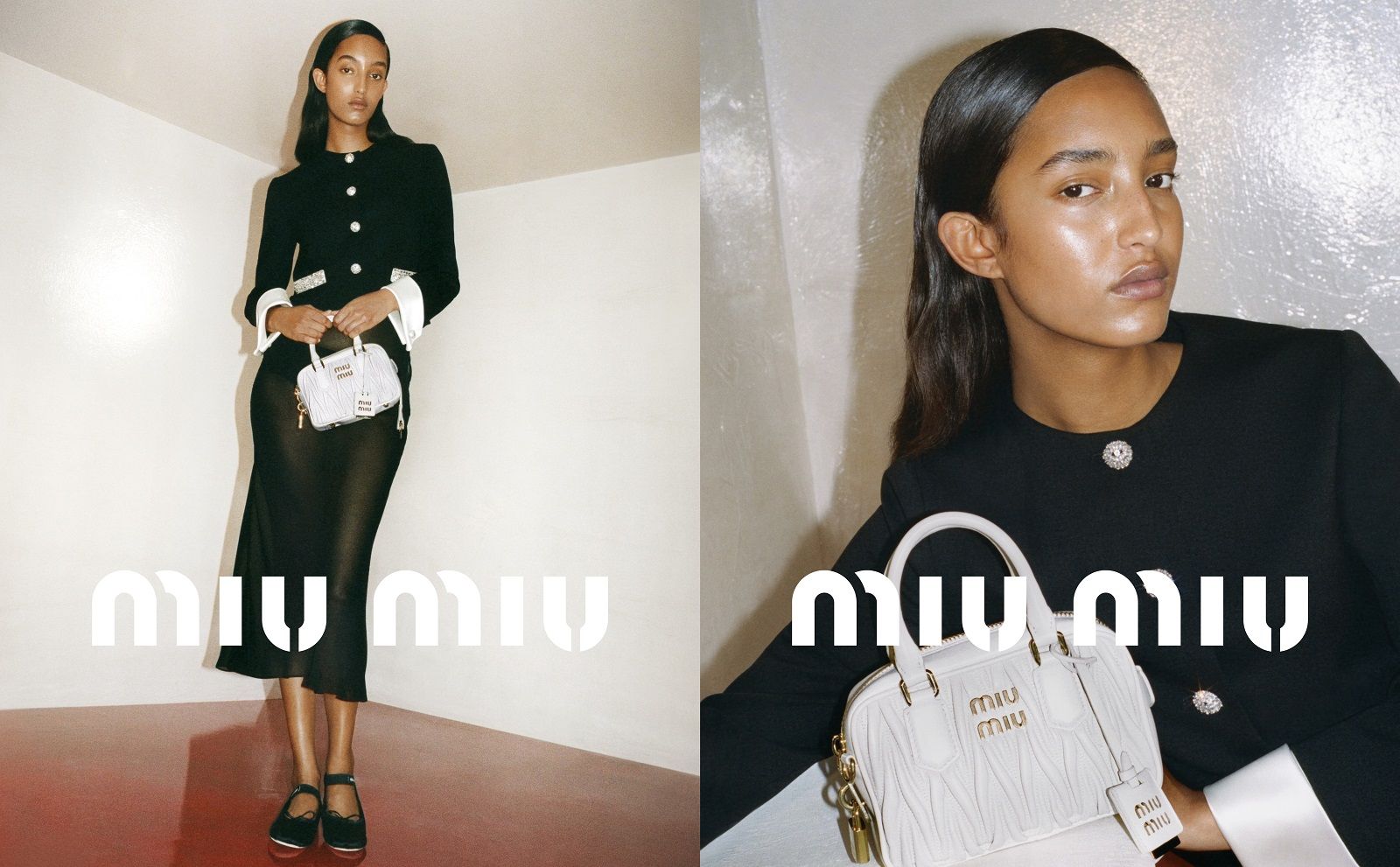 It's all a game of proportions and dualisms: oversize and miniature, functional and luxury, playful elegance and accessories, fully buttoned garments and unfastened and flowing fabrics, masculine and feminine coexist in the desires kept intimate and hidden by Miuccia Prada's brand, which continues to tell the story of the dualisms that make life in this historical period a multifaceted diamond and to explore the reinterpretation of the canons of different aesthetics part of the minimalist fashion tradition. The collection that plays with contrasting nuances is called Miu Miu Private Wishes and juxtaposes ballet flats, heeled sandals, and cube-heeled boots with iconic bags, such as the Bauletto or the new entry Wander, declined in different sizes and colors that start from ethereal shades of white and darken to the most intense black. The denim is ripped, the embellishments romantic, and the balance of the different seems to perfectly hold up Mrs. Prada's vision of modern femininity amidst the mixture of pearls, feathers, and glitter. The result is a luxurious and playful uniform designed to satisfy individual and delicately provocative fantasies, in which there is no shortage of reflective textures and classic matelassé materials, the symbol of the brand.