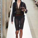 Miuccia did not just think about morning pilates, she also thought about our dates. The looks, worn after dark, are dominated by sheer pieces that reveal normally hidden parts. Dresses include plunging V-neck dresses, elegant-looking polka dot suits, flowing tops and three-dimensional floral silhouettes. This style emphasises sensuality and demonstrates an avant-garde, upside-down collection that shows what is normally hidden. Transparent chiffon that opens the windows to the garments, stockings on display, overlapping dresses.