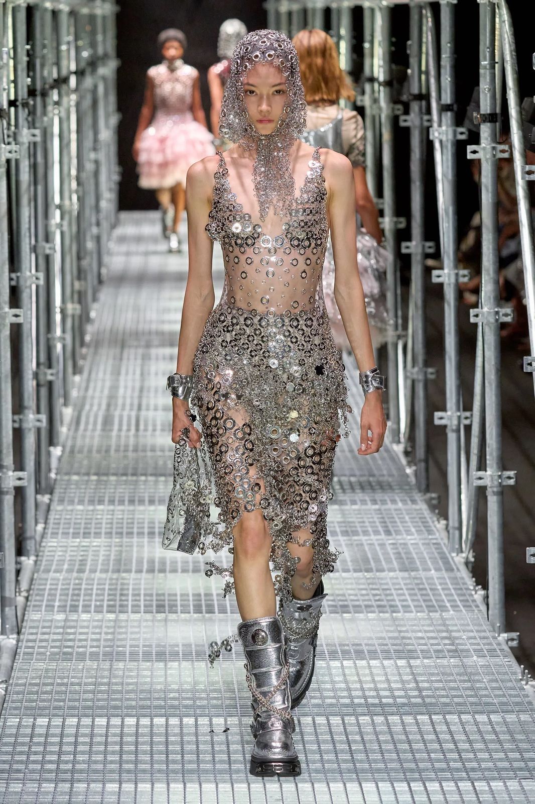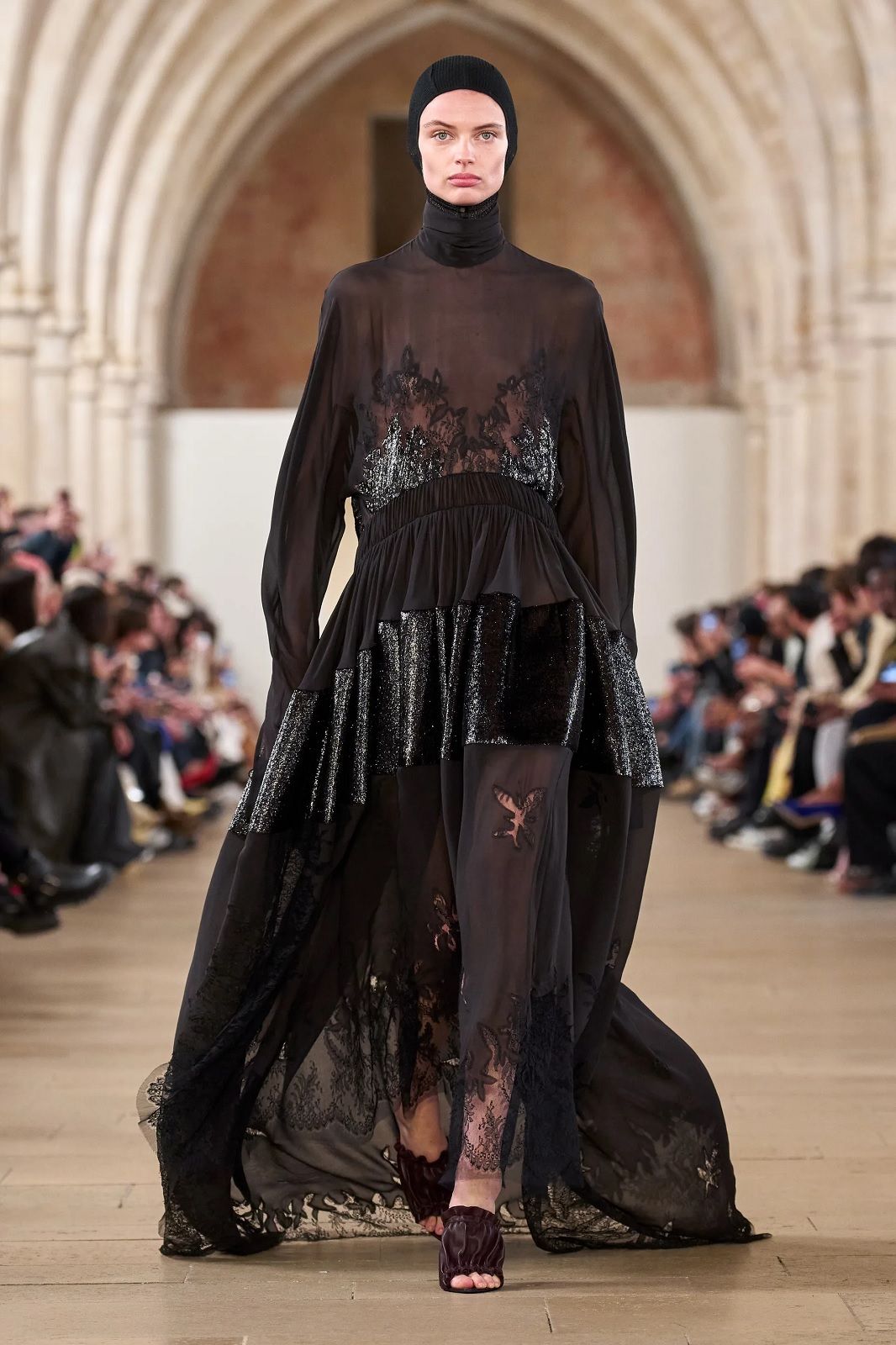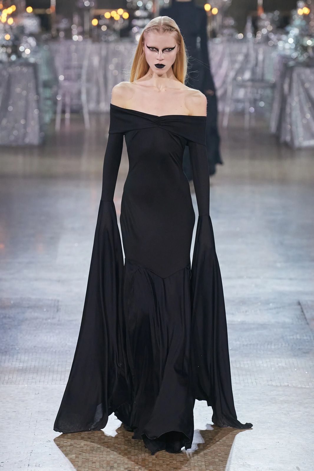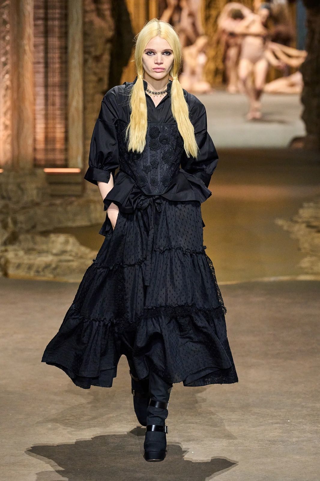 Designers, like other creatives, have often embraced the mediaeval aesthetic in their collections, dressing models as ladies, knights, minstrels, kings and queens, witches and fairies, mixing elements from history with others from folklore. A few examples? Dior's FW1998 haute couture, Alexander McQueen's FW10 and FW13, Chanel's Pre-Fall 2013, Dolce & Gabbana's FW14, Valentino's SS15 and Paco Rabanne's FW20. Capes, hoods, tights, tunics, armour, houppelande dresses, chainmail, bodices and corsets, revisited ad hoc, are returning in more and more brands. Blumarine was the latest to fall under the spell of the dark ages. For the autumn-winter 2023 collection, Nicola Brognano fused the fashion of 2000 with the myth of Joan of Arc, bringing contemporary heroines to life in tight-fitting, silver Lycra dresses and long, openwork knit tunics. At Rodarte, too, mediaeval allusions helped dress a coven of beautiful witches in long black dresses ready to cast a spell on anyone who got in their way; while the soft, layered jumpers seen at Miu Miu for SS23 looked like some kind of 2.0 reimagining of the night tunic from that era.