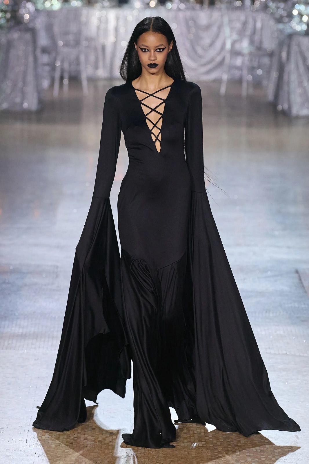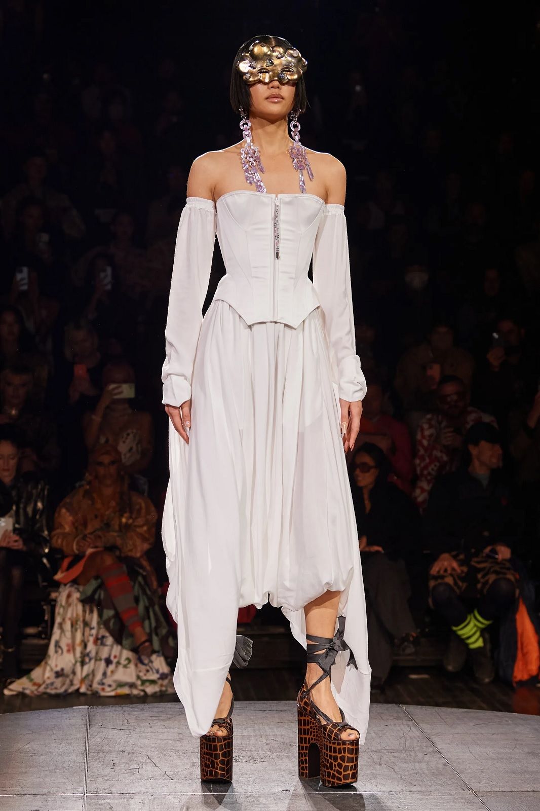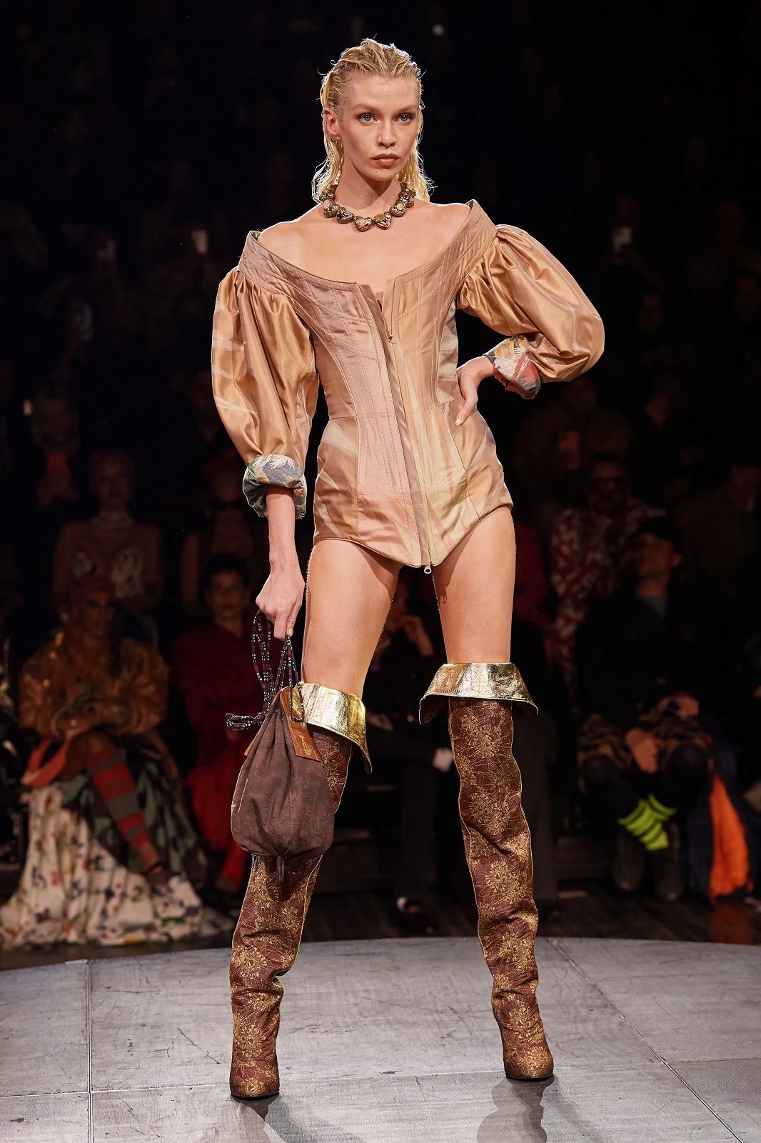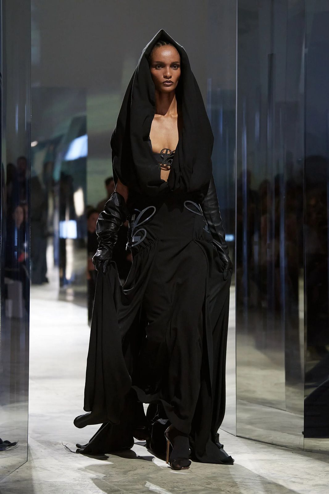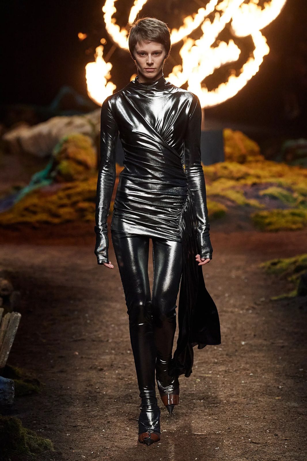 Designers, like other creatives, have often embraced the mediaeval aesthetic in their collections, dressing models as ladies, knights, minstrels, kings and queens, witches and fairies, mixing elements from history with others from folklore. A few examples? Dior's FW1998 haute couture, Alexander McQueen's FW10 and FW13, Chanel's Pre-Fall 2013, Dolce & Gabbana's FW14, Valentino's SS15 and Paco Rabanne's FW20. Capes, hoods, tights, tunics, armour, houppelande dresses, chainmail, bodices and corsets, revisited ad hoc, are returning in more and more brands. Blumarine was the latest to fall under the spell of the dark ages. For the autumn-winter 2023 collection, Nicola Brognano fused the fashion of 2000 with the myth of Joan of Arc, bringing contemporary heroines to life in tight-fitting, silver Lycra dresses and long, openwork knit tunics. At Rodarte, too, mediaeval allusions helped dress a coven of beautiful witches in long black dresses ready to cast a spell on anyone who got in their way; while the soft, layered jumpers seen at Miu Miu for SS23 looked like some kind of 2.0 reimagining of the night tunic from that era.