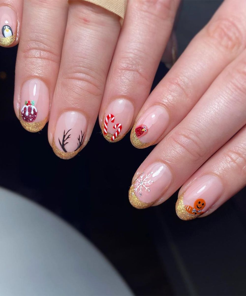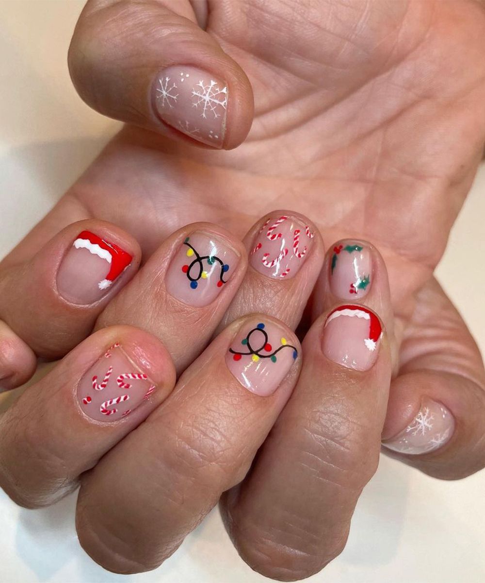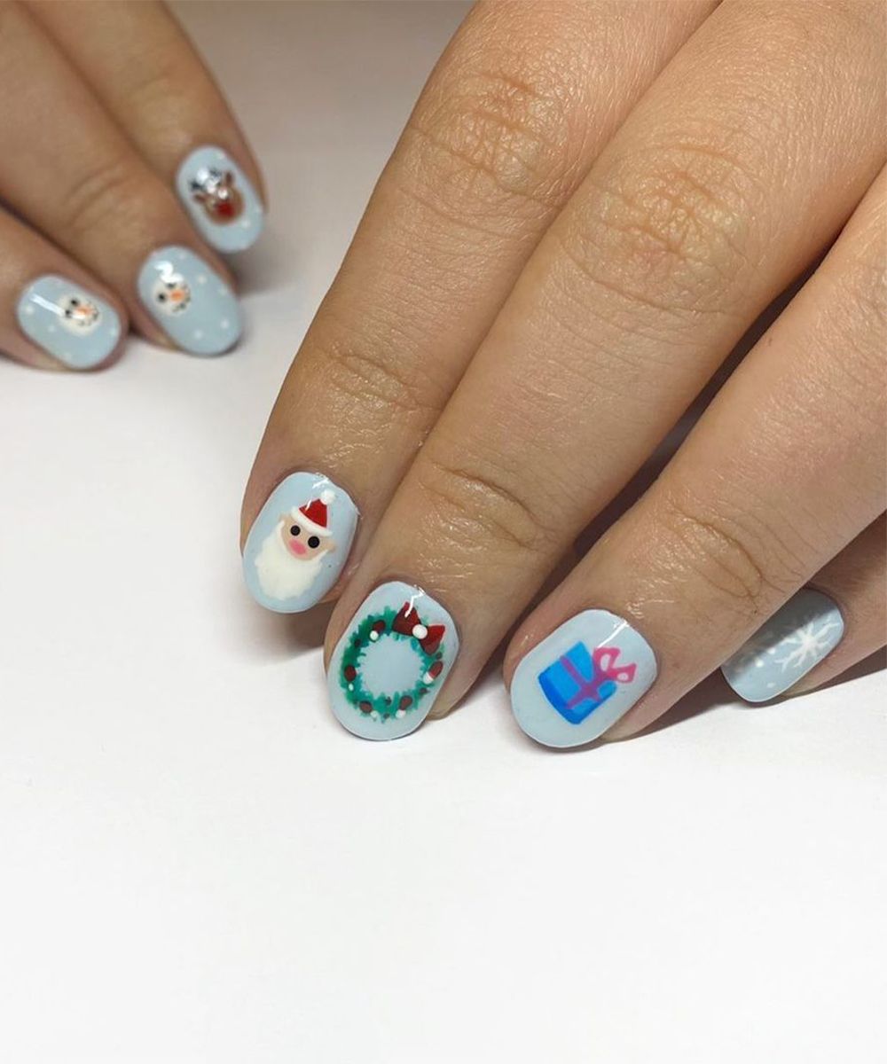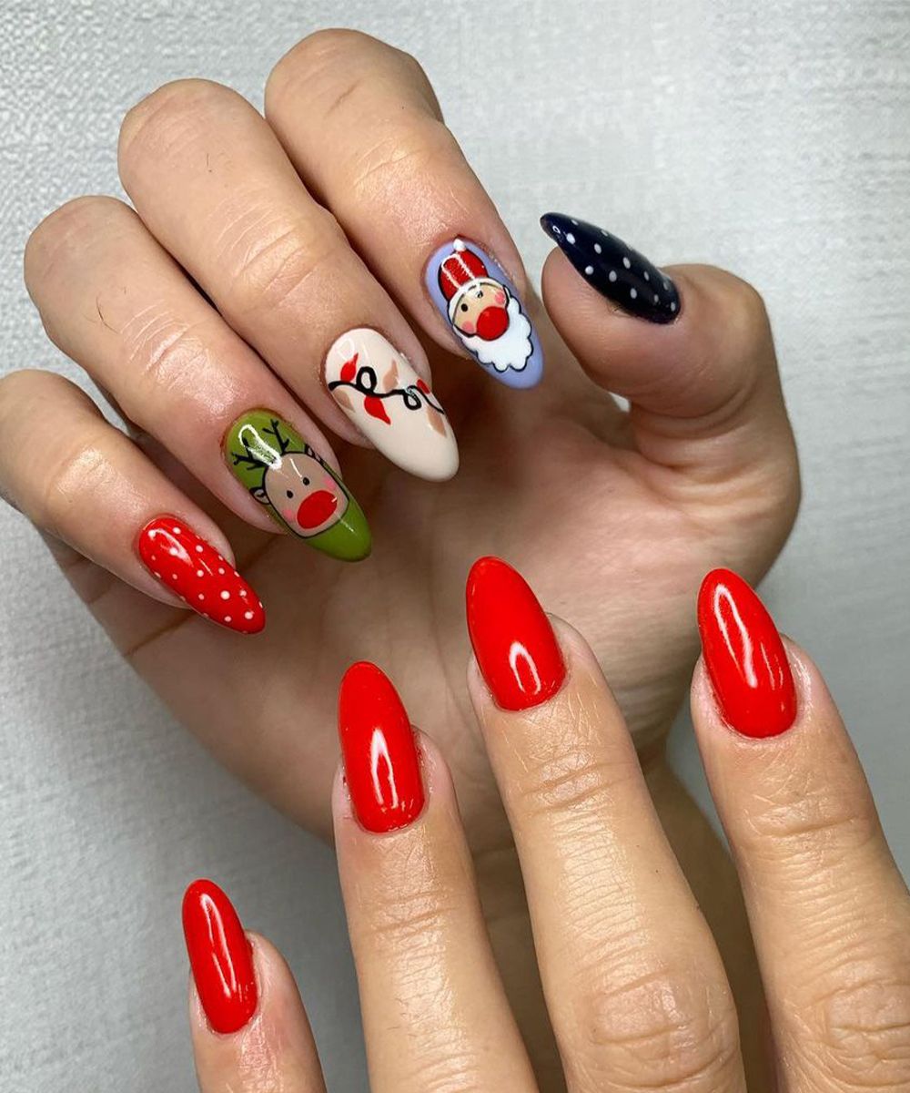 A mix & match of all the elements related to Christmas that come to your mind: reindeers, Santa Claus, snowmen, stars, tree balls, gingerbread cookies, in short, go ahead with the imagination! This is the nail art for those who unconditionally love this time of the year.