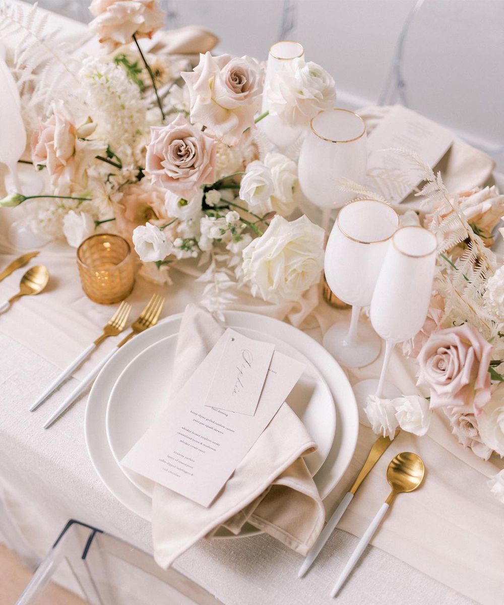 Bridgerton, Bridgerton and again Bridgerton. The Regency style just doesn't want to get out of the head of today's brides, so obsessed with the perfect mise en place of the Netflix TV series. Yes to the champagne shade, to flowers and also to some whims, like macarons, sweets and glasses of champagne used as a flower holder.