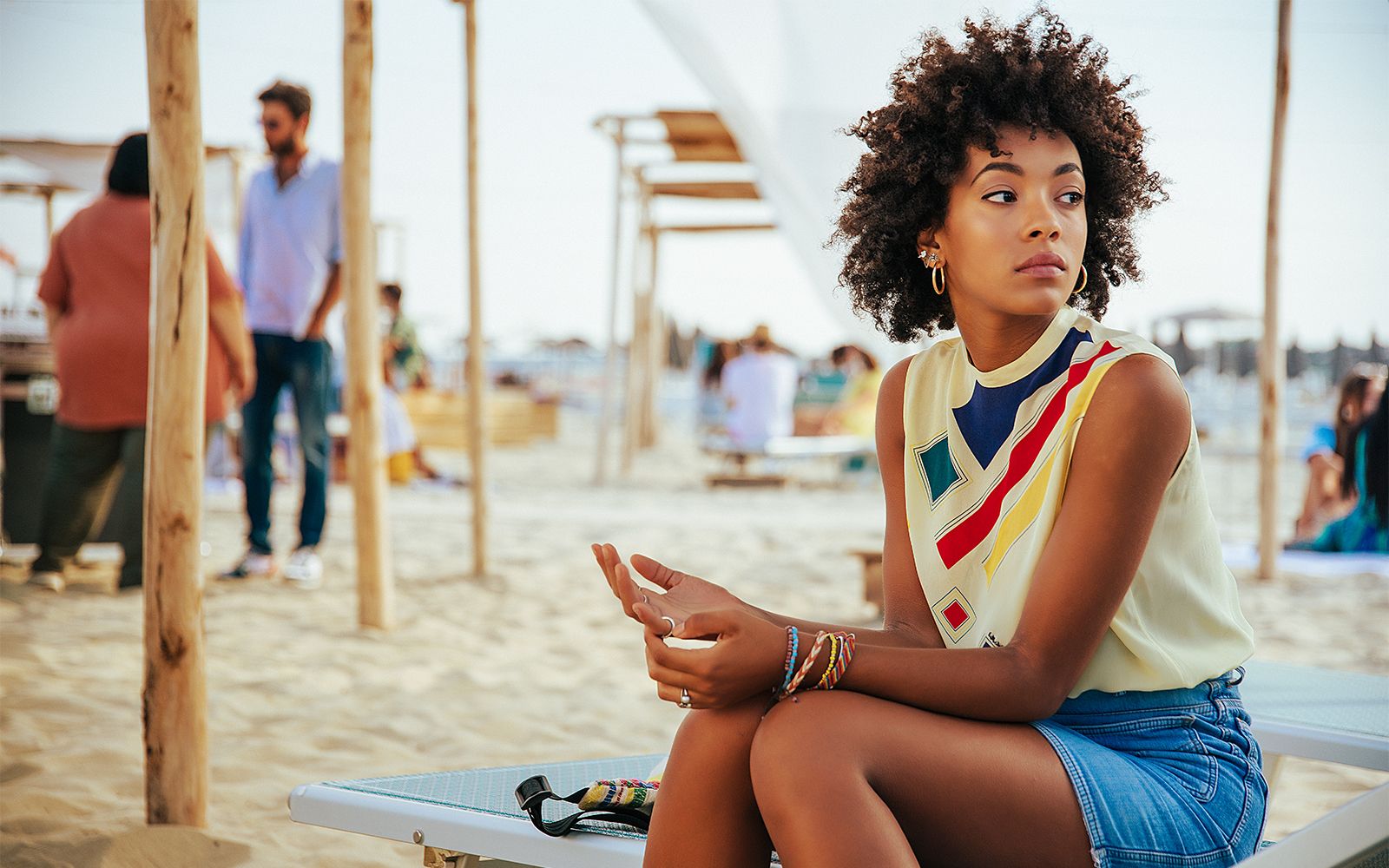 Summer, at least on Netflix, has already returned, and already makes you dream of where to go to bask in the sun all day without too many thoughts. "I am constantly experiencing that conflict of I want to tan but at the same time I want to protect my skin" - confides Amanda Campana (Sofia) - But I want to tan in eight and a half seconds, so I'm a continuous put on the cream fifty, put on the self-tanner on top, then put the cream back on again. For the rest, I just need good company at the beach".