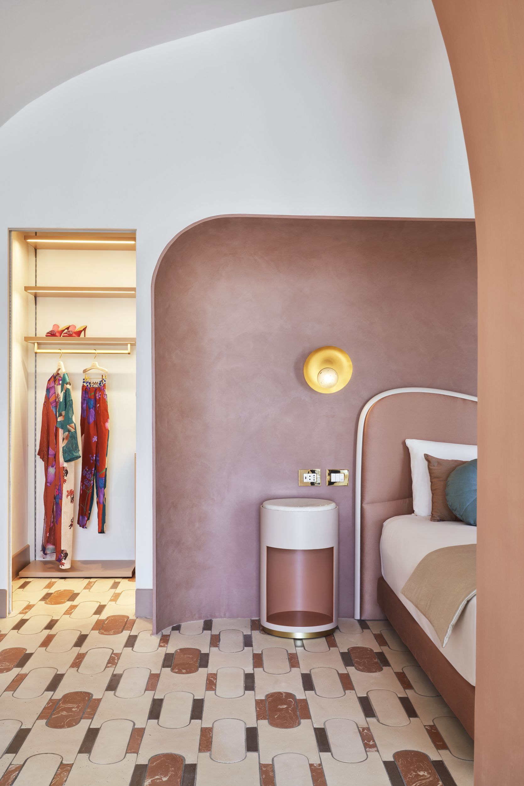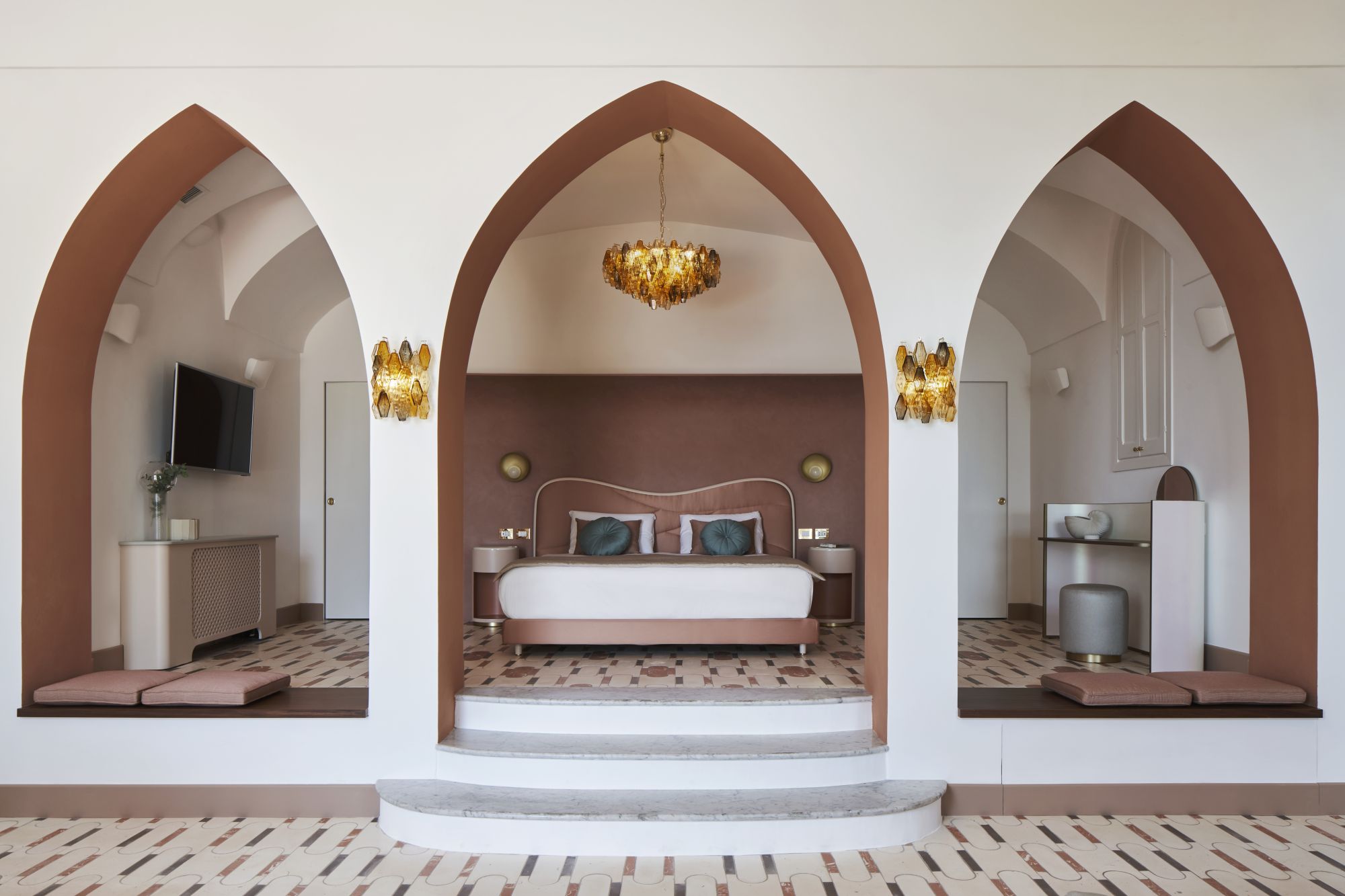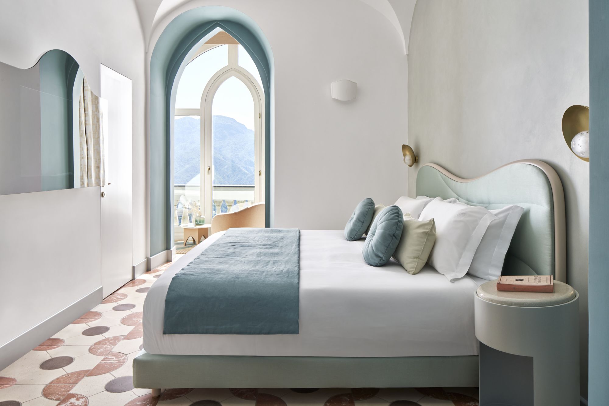 Palazzo Avino's 2023 season adds new chapters to the narrative. The first of these is the Infinito Suite, a vivid and articulate recovery project suspended in time, designed by architect Giuliano Dell'Uva. "I chose him and this direction because I was struck by his strong focus on local craftsmanship. The infinity suite is the only room on the fourth floor, the highest point of the building. It is a duplex with a beautiful roof terrace and a small private pool. The idea, which we also worked on from an artistic point of view, was to design the space so that guests feel as if they are in a work of art. Through the Alfonso Artiaco Gallery in Naples, we got in touch with David Tremlett, a British artist whose work is characterised by the use of colour. Last summer, David saw the space and imagined how one of his works could be transferred there. So he drew up a design, which was then brought into the space on about a thousand handmade terracotta tiles."