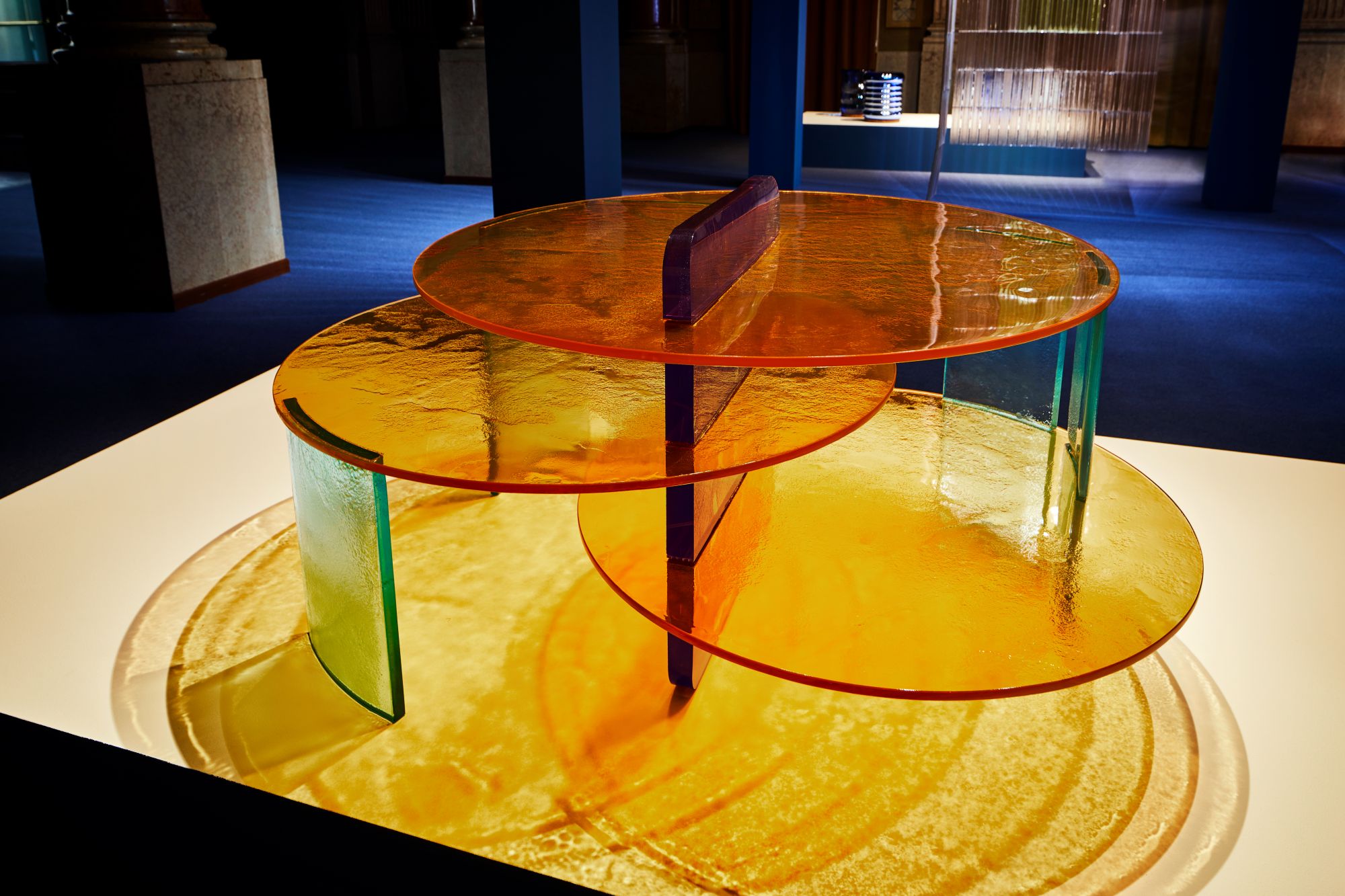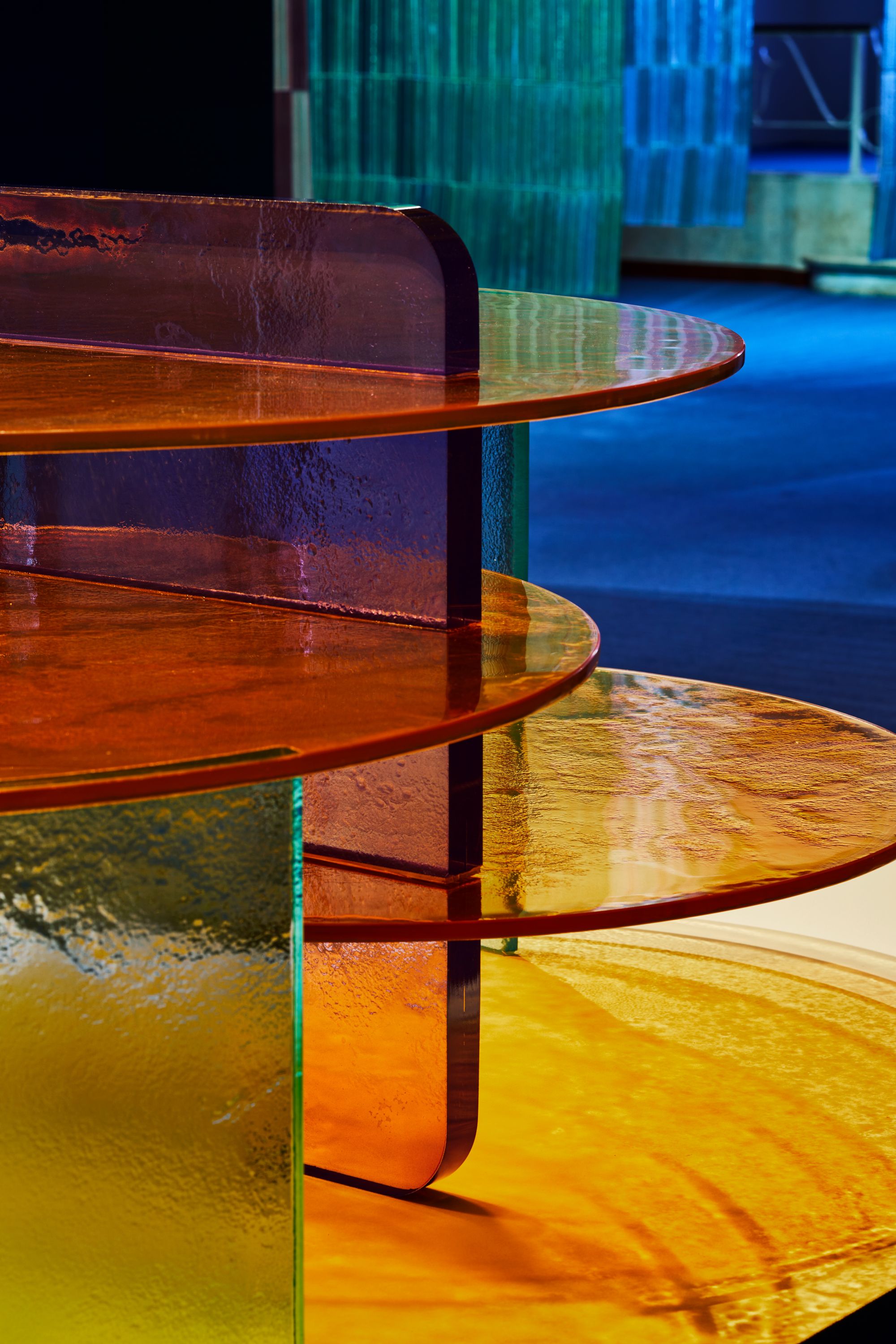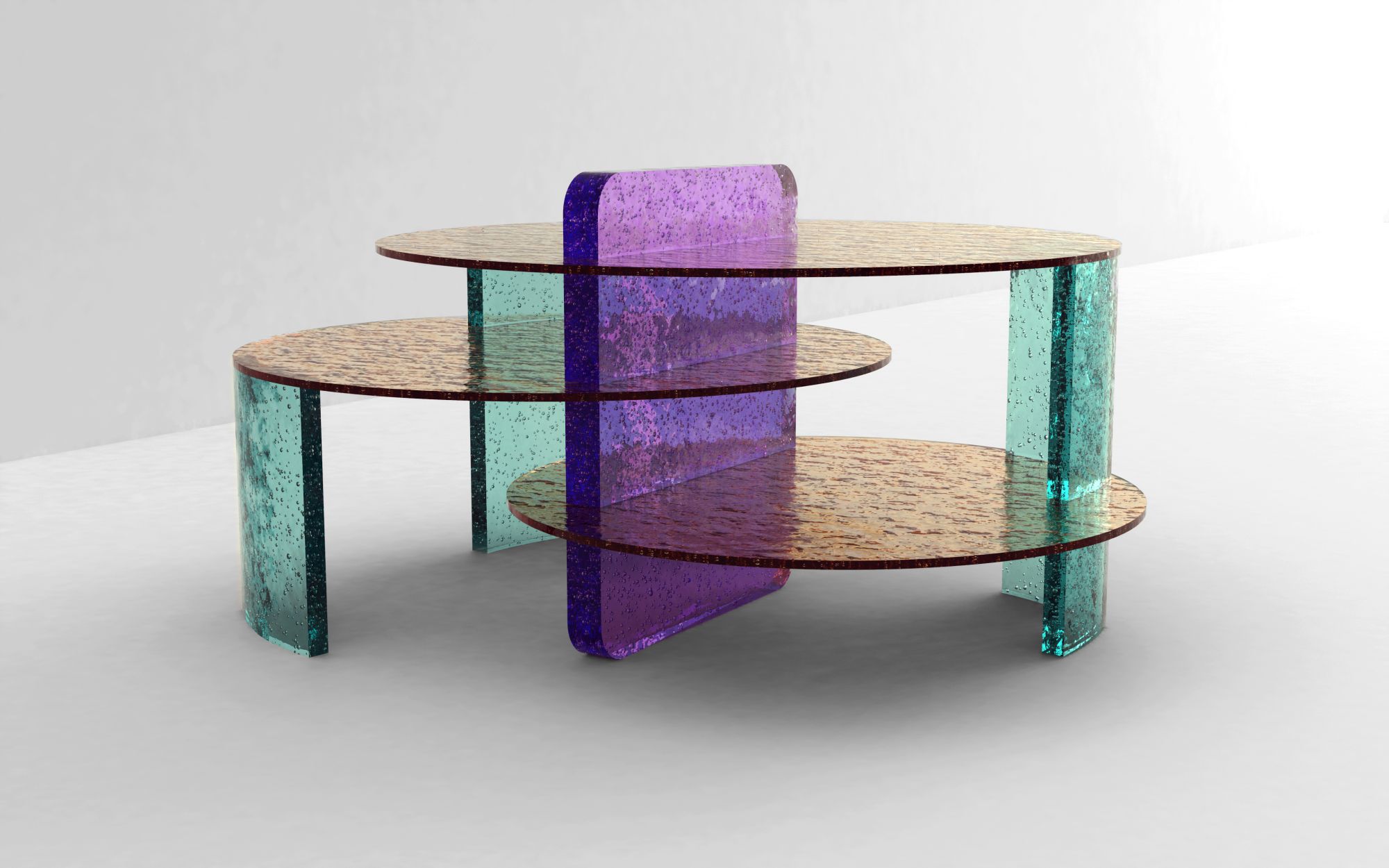Elena Salmistraro participates in Abracadabra with the coffee table Taliso. In this magical object, which illuminates the high room like a talisman, everything is explored by experimenting with the versatility of glass. The technical development and boundless creativity of the design are defined by the overlapping and interlocking of fused glass plates, cylinders and tops. Taliso is inspired by architectural principles where weights are balanced and carefully structured to control the organic movement of glass textures. A primitive, raw, primal, compositional play, but at the same time contemporary, delicate and technically complex "I was called by WonderGlass, but we already had a material in hand, we said, "Let us start with fused glass" So more than inspiration, in this case we started with the material. I went for it, although it was something new for me. I had worked with blown glass before, but not yet with fused glass. And so the Taliso coffee table was born."