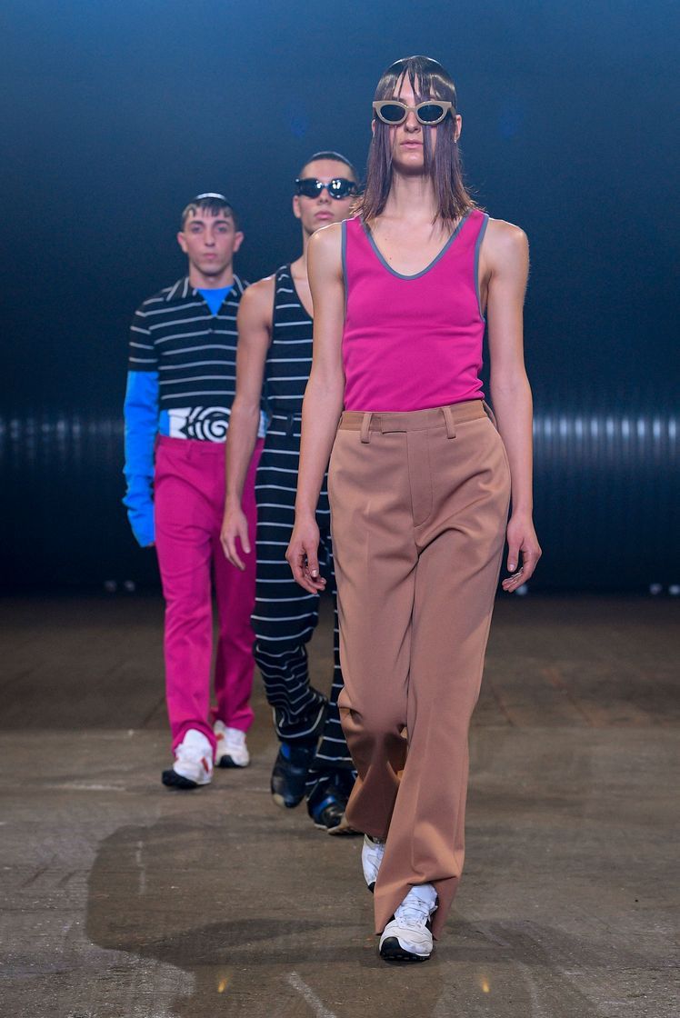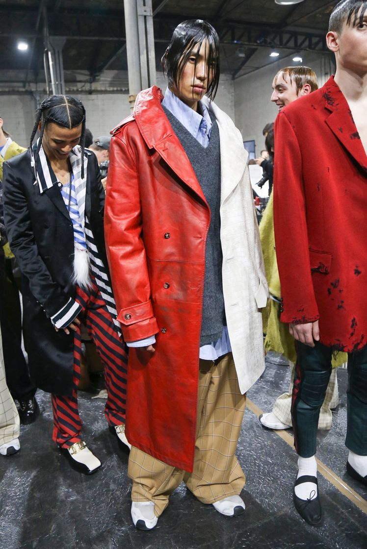 Per i beauty look di Magliano il focus è sull'hairstyle dei modelli: capelli lunghissimi e morbidi, con onde sulle lunghezze che scendono sulla spalla destra grazie alla riga laterale. Ispirazione anni '90 nella texture dai toni avorio sul viso di alcuni modelli, che richiama l'idea di uomo "artista".