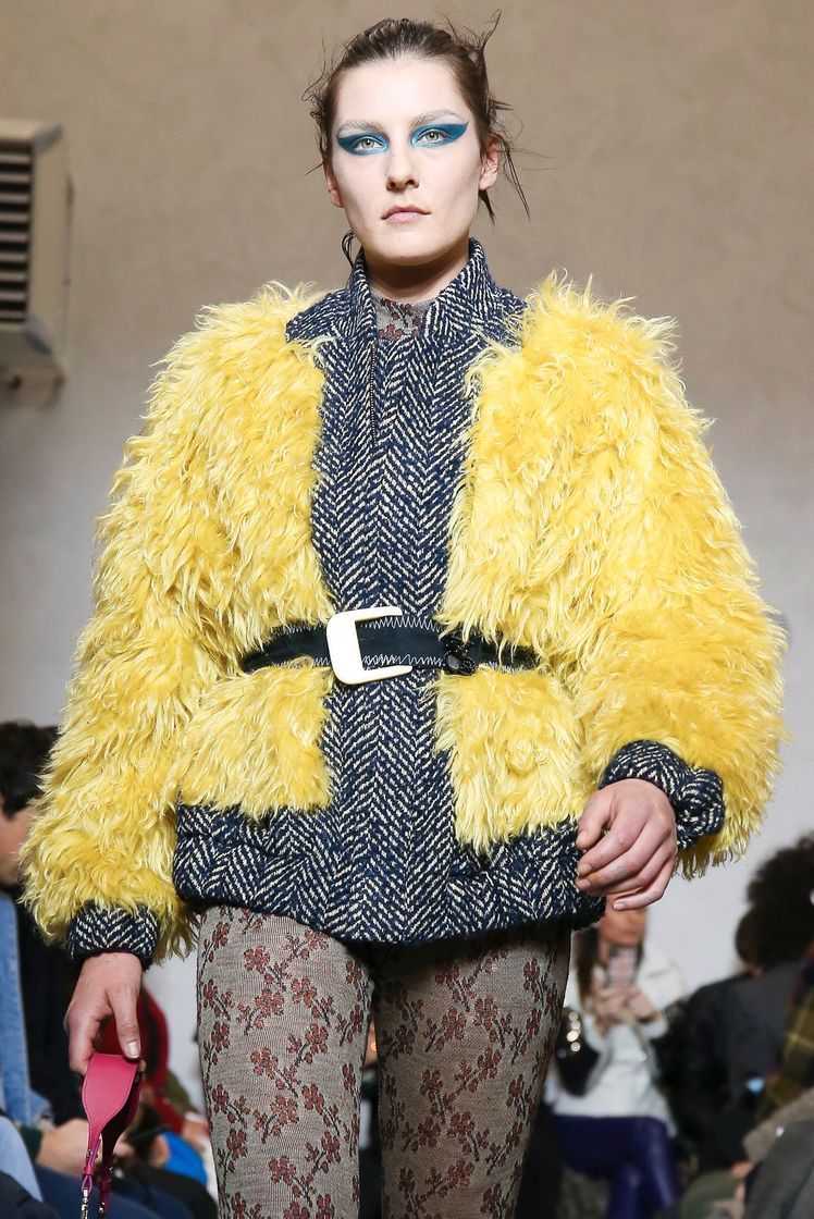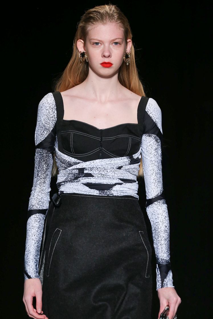Il viso è nascosto da un hairstyle eccentrico: i lunghi capelli effetto wet scendono sul viso e sotto gli occhiali da sole, quasi a nascondere l'identità e il volto della modella per concentrare tutta l'attenzione sui capi.