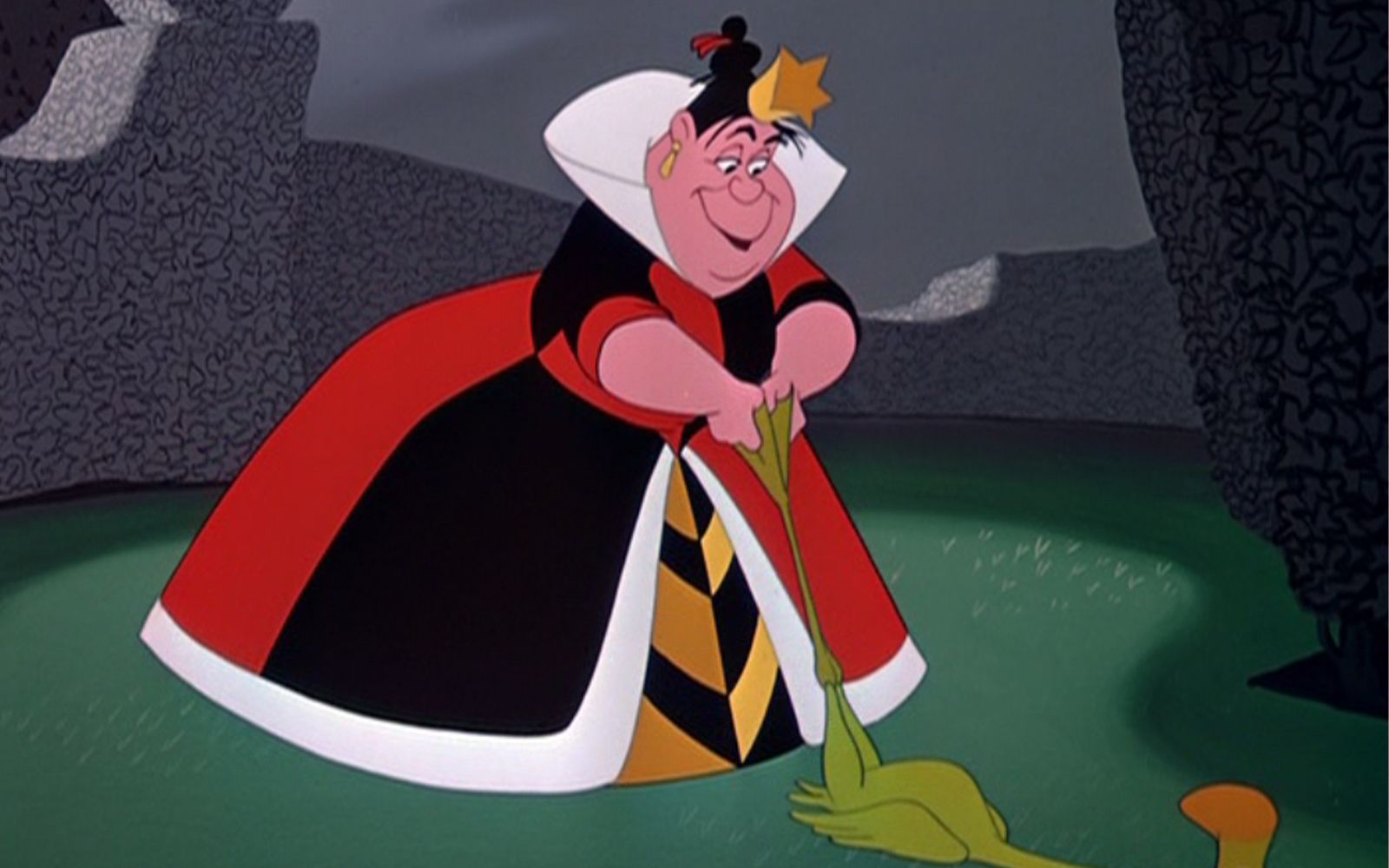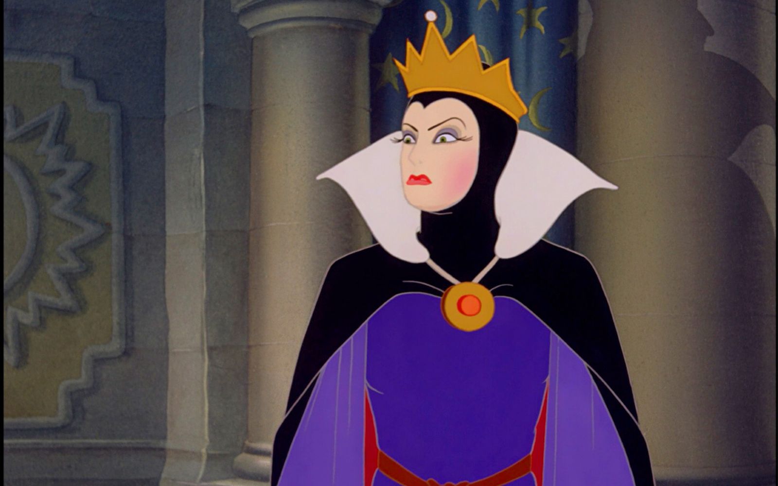 Viola e nero, con tocchi dorati, è il suo karma. Mai dimenticare la corona a punta, una cintura strettissima in vita e un colletto alto. Per essere la più bella del reame cede al blush, tanto blush rossastro, sulle gote.