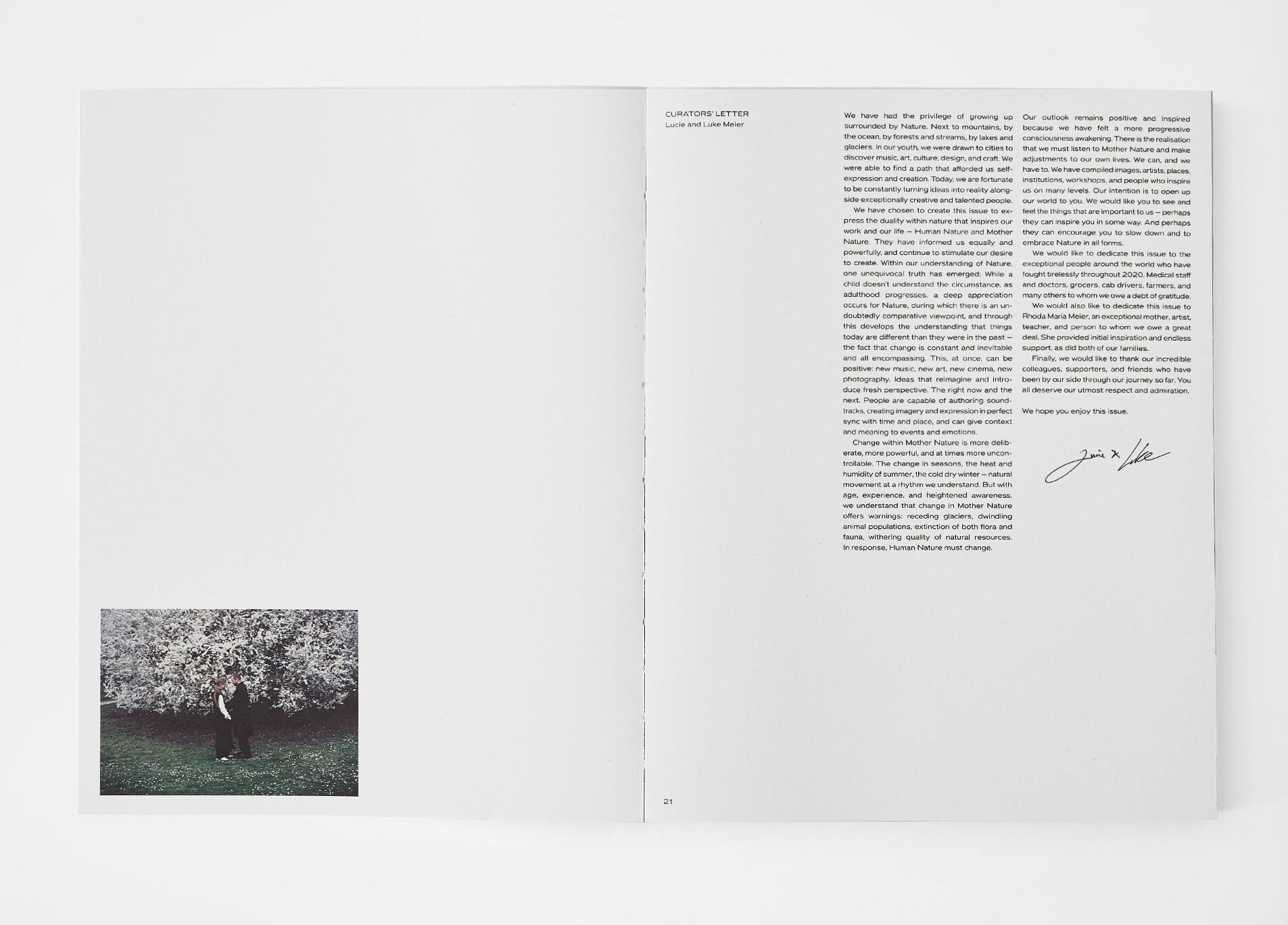 Pochi altri fashion magazine vantano la stessa reputazione di A Magazine Curated By (@amagazinecuratedby), la rivista di moda che in ogni numero esplora l'universo di uno stilista e gli lascia carta bianca. L'obiettivo è semplice: dare spazio alla creatività di un designer, un gruppo o casa di moda internazionale, quindi invitarlo a sviluppare contenuti personalizzati e a servirsi delle sue pagine per esprimere i propri valori estetici e culturali. Dopo aver ospitato nomi del calibro di Pierpaolo Piccioli e Margiela, il numero 21 è stato curated by Lucie e Luke Meier, i co-direttori creativi di Jil Sander, che attraverso fotografia, pittura e illustrazione, interviste, musica, poesia hanno portato anche sul magazine l'invito alla riflessione e al dialogo su un tema da sempre caro a tutto il loro lavoro: il contrasto tra la natura umana e la più grande, immensa, magnifica Madre Natura.