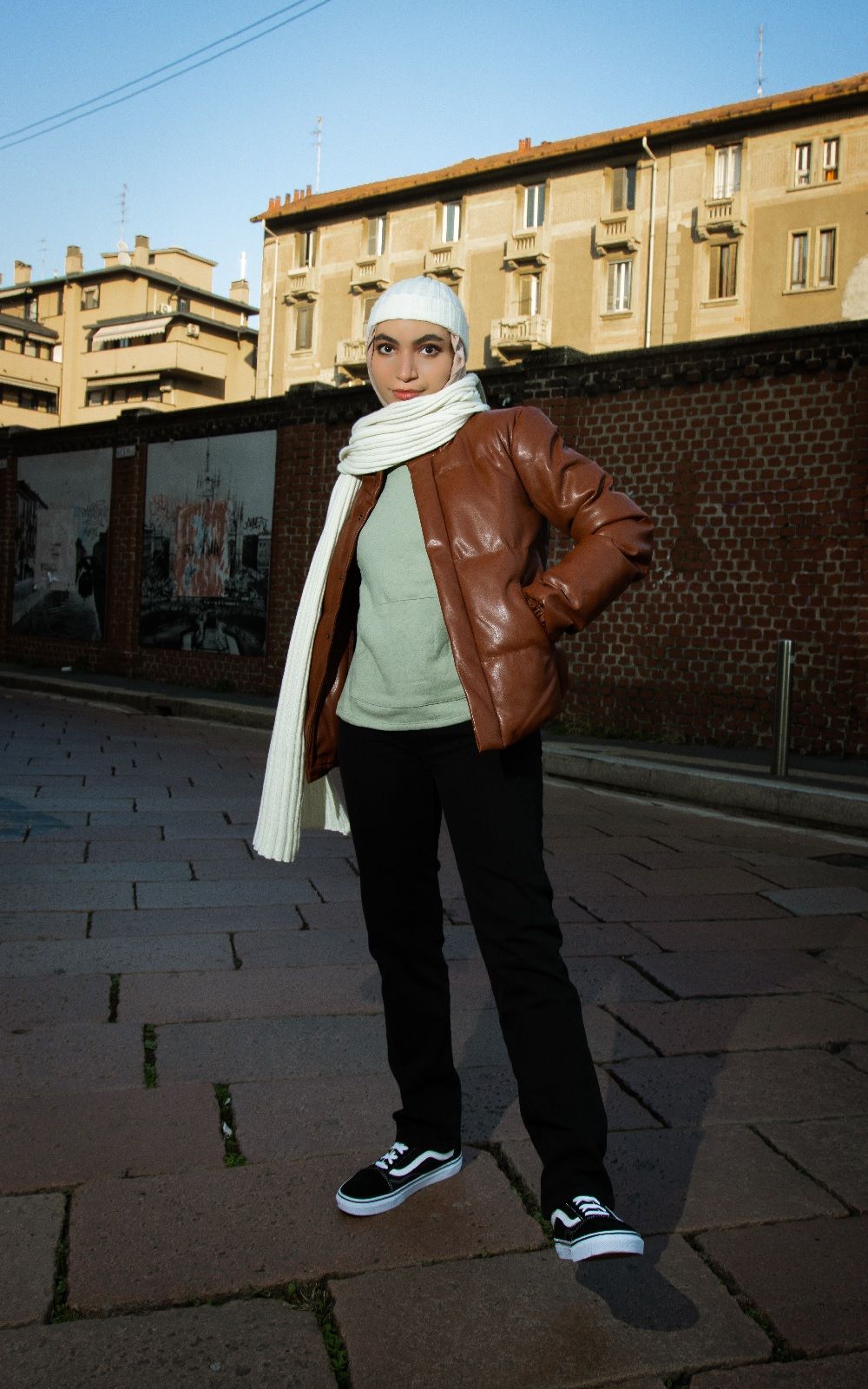 Aya Mohamed, conosciuta anche come Milan Pyramid, è una giovane studentessa di scienze politiche con la passione per la moda che alterna capi easy ad altri con un twist più sofisticato, perfetti sia per un’uscita con le amiche sia per una lezione all’università. Nel suo primo outfit indossa un cappotto nero di United Colors of Benetton sopra un maglione bianco a collo alto di Meraki, un paio di pantaloni dello stesso colore di Pepe Jeans e stivali Geox. Nel secondo, invece, opta per un paio di jeans neri Levi’s, una felpa verde menta di Aurique e un piumino di find., mentre ai piedi indossa un paio di Vans.
