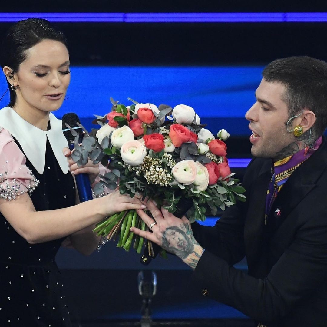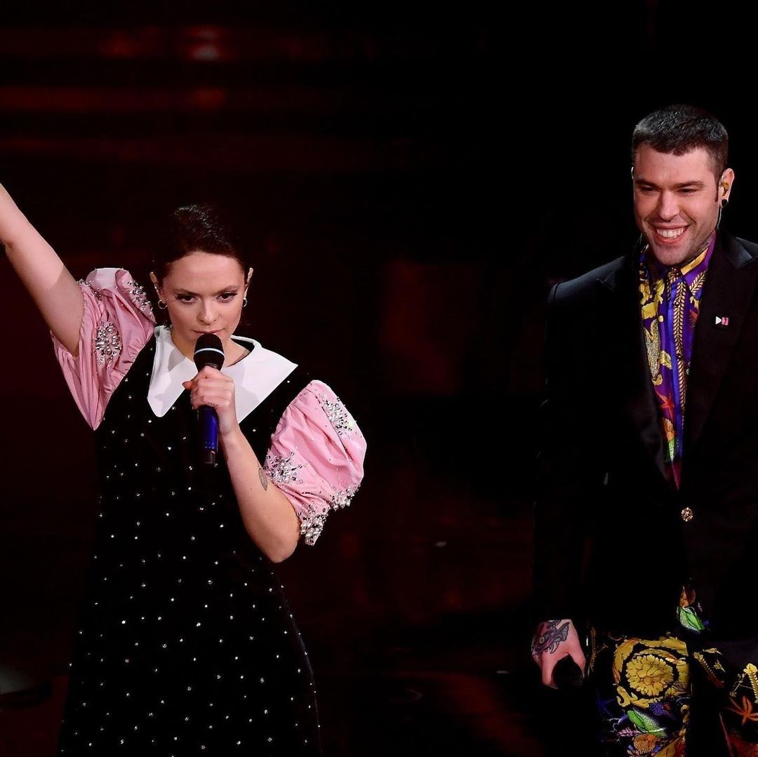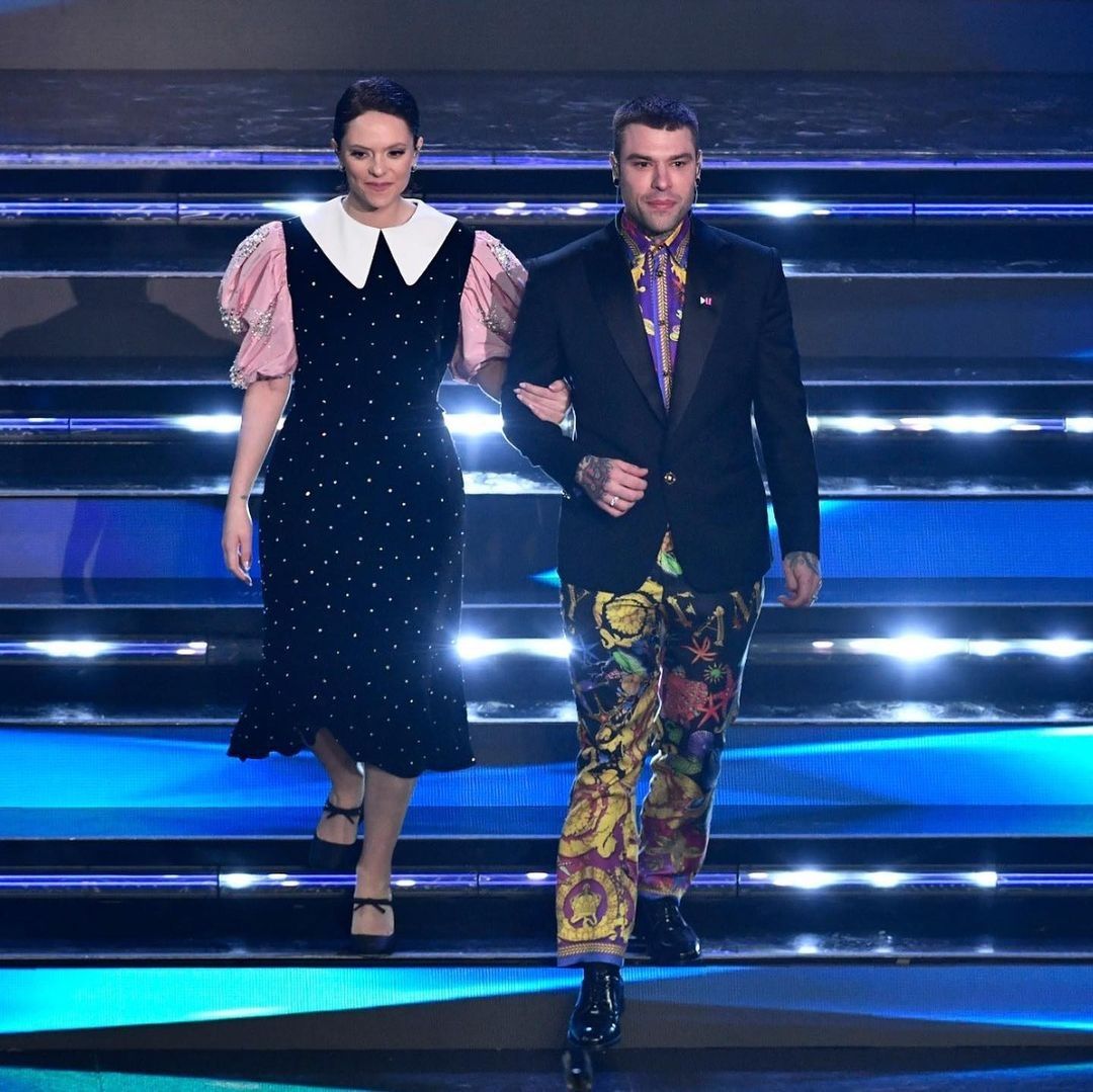 Look: Lei, un po’ Olivia di Braccio di Ferro, un po’ Mercoledì Addams, è davvero deliziosa nel suo abito Miu Miu in velluto nero, con maniche a palloncino rosa pallido impreziosite da Swarovski e maxi colletto bianco da educanda. I capelli sono tirati indietro, effetto wet, mentre sotto gli occhi spuntano dei cristalli che richiamano le decorazioni dell’abito. Fedez, ancora una volta, cerca di smorzare l’effetto pop delle stampe Versace con un blazer nero. Belli entrambi, forse nell'insieme poco coordinati.