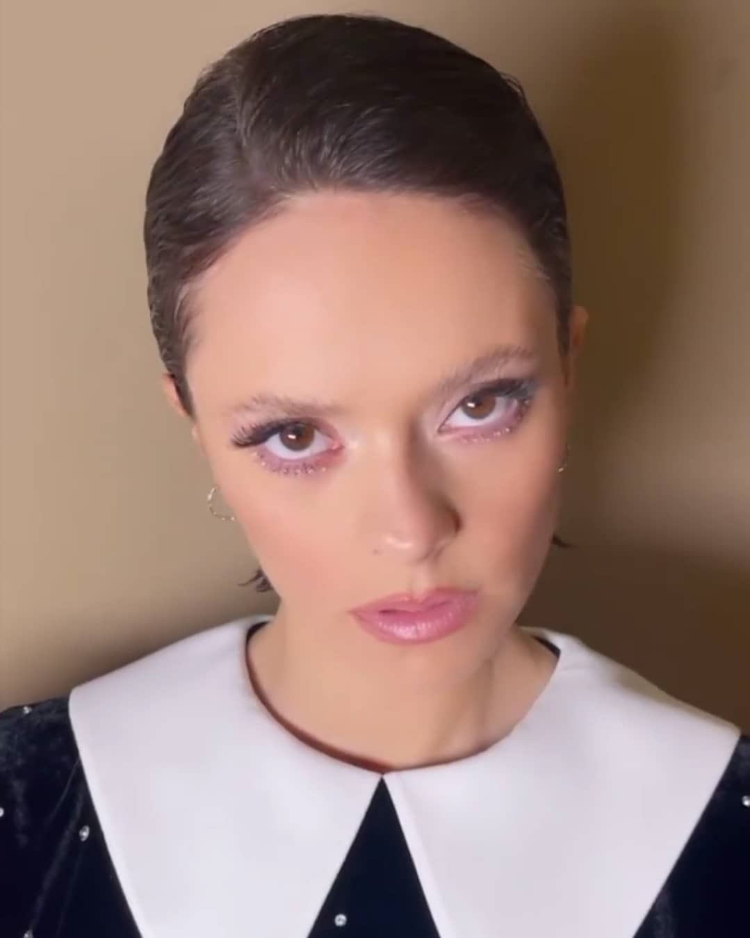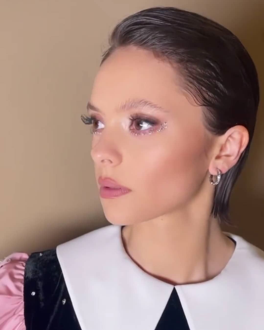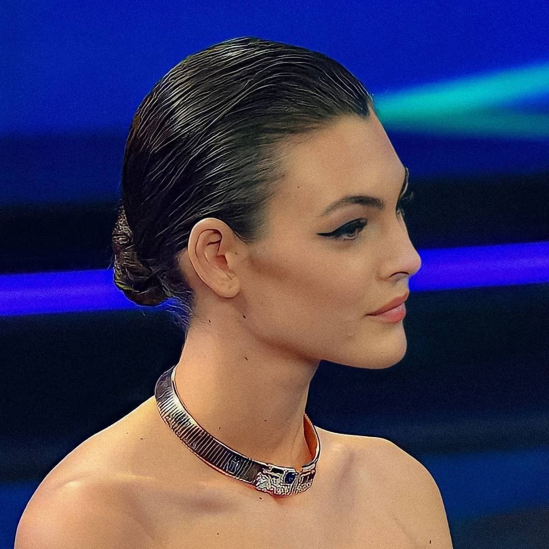 Look: Lei, un po’ Olivia di Braccio di Ferro, un po’ Mercoledì Addams, è davvero deliziosa nel suo abito Miu Miu in velluto nero, con maniche a palloncino rosa pallido impreziosite da Swarovski e maxi colletto bianco da educanda. I capelli sono tirati indietro, effetto wet, mentre sotto gli occhi spuntano dei cristalli che richiamano le decorazioni dell’abito. Fedez, ancora una volta, cerca di smorzare l’effetto pop delle stampe Versace con un blazer nero. Belli entrambi, forse nell'insieme poco coordinati.