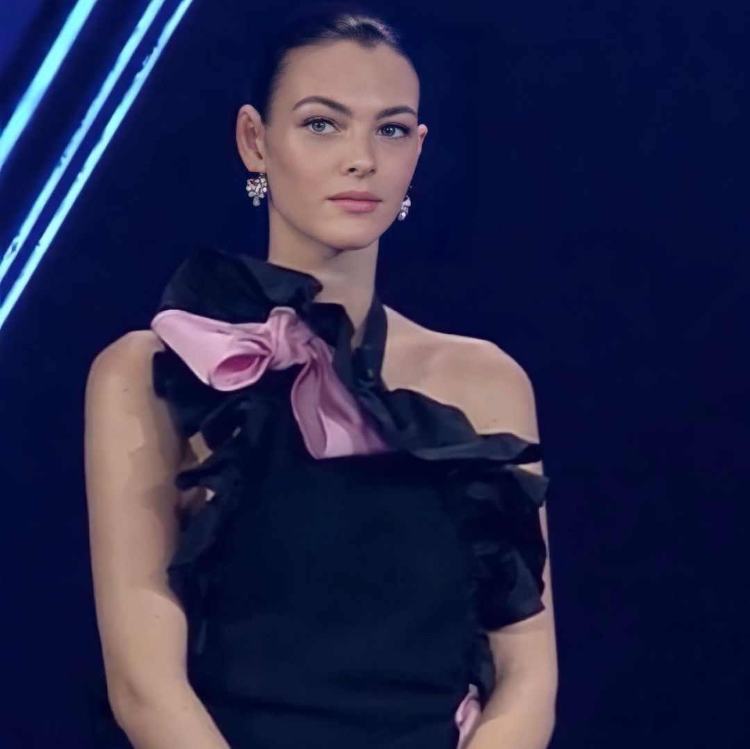 Look: Lei sceglie un match total black sempre vincente composto da top bustier e pantalone a vita alta, illuminati solo da una cinturina a catena che sottolinea il giro vita e fa tanto primi anni 2000. Come nella prima sera lascia i capelli lunghi liberi ad incorniciare il viso e il make-up no make-up. Lui opta per un anonimo completo blu notte. Un po’ noiosi.