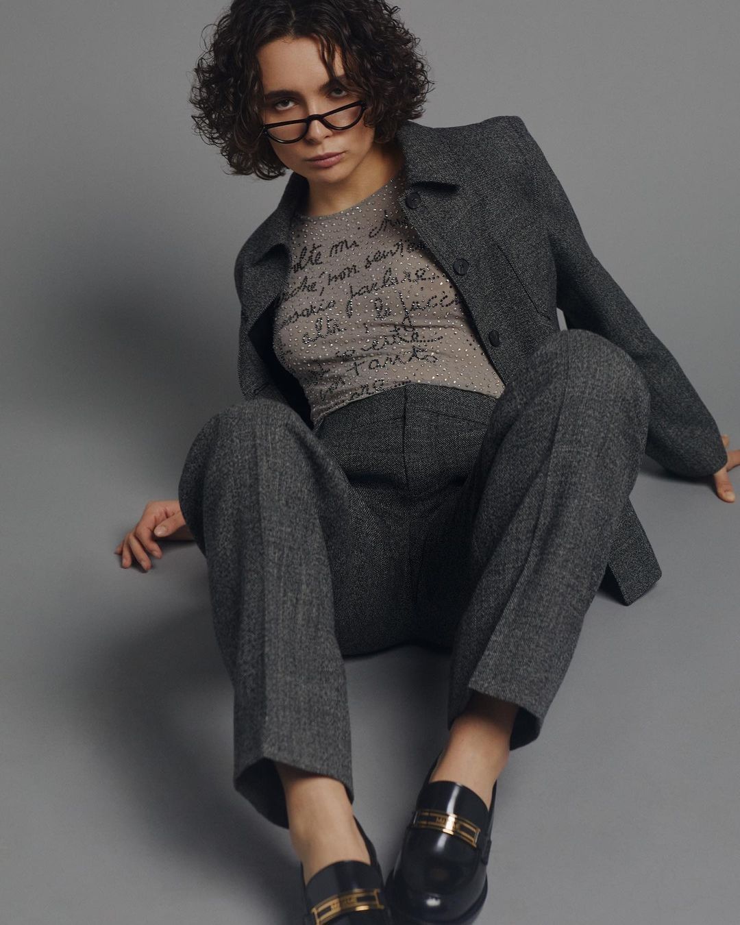 Look: Madame, in suit grigio e occhiali, si trasforma in maestrina per cantare Prisencolinensinainciusol di Celentano. Lei ci piace tanto, la performance è energia pura, e il look Dior, volutamente dimesso, la rende semplice e chic.