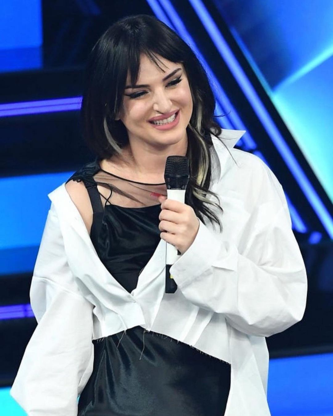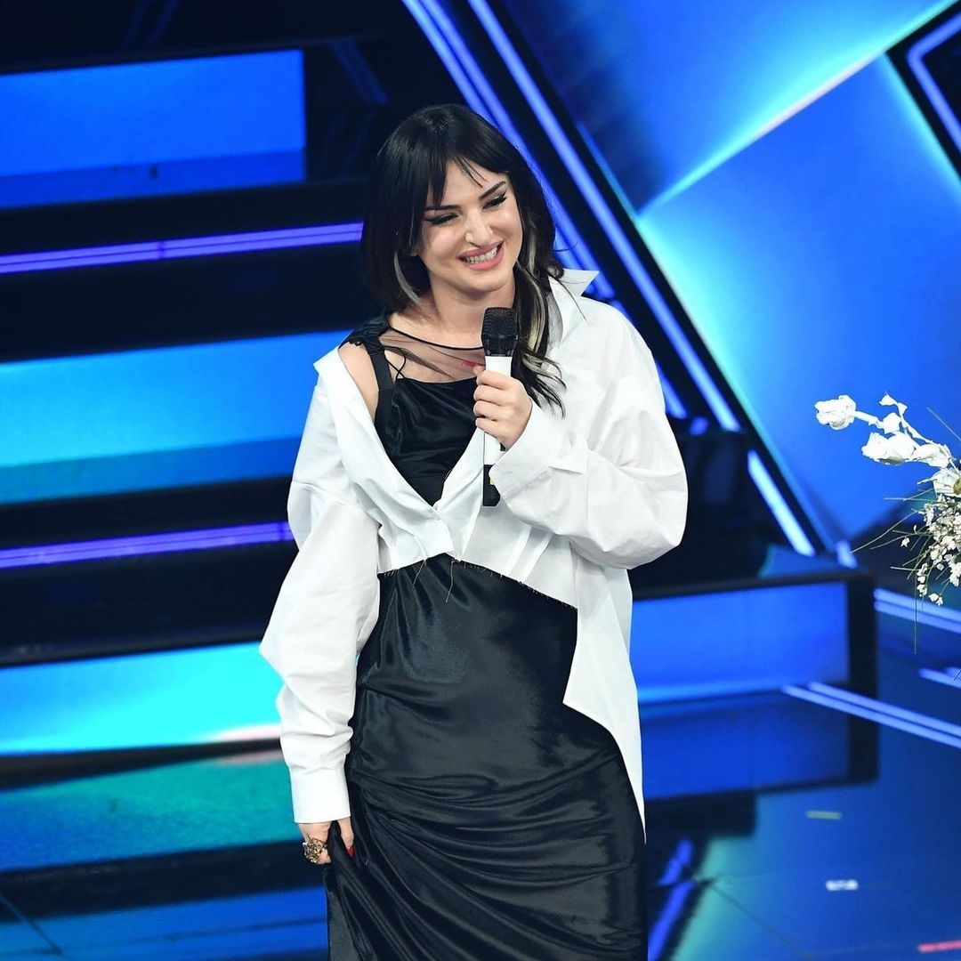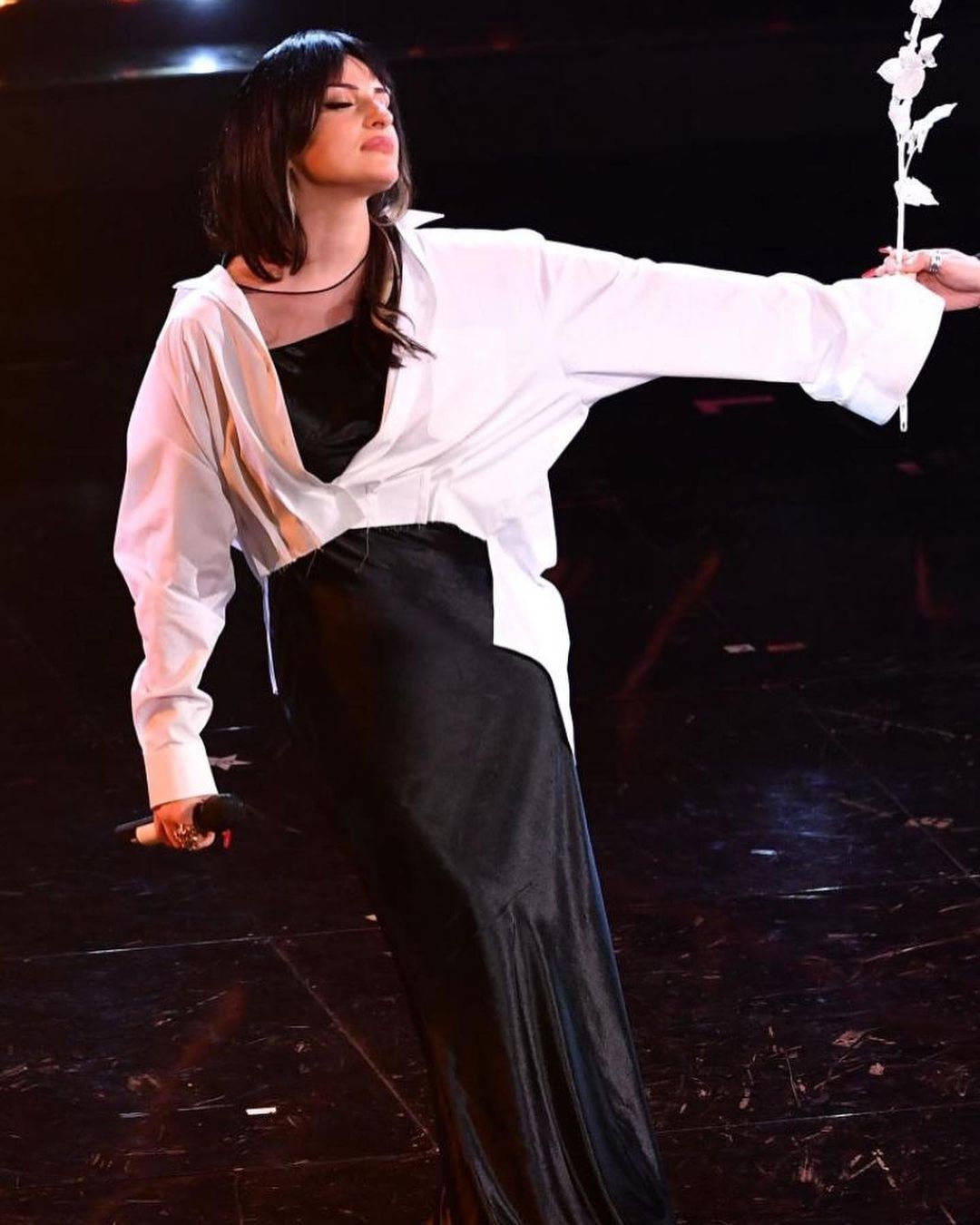 Look: Una performance visiva che cita Marina Abramović e Ulay con l'arco teso e la freccia che punta dritta al cuore. Concept raffinato e colto che, purtroppo, almeno dal lato dello stile risulta lontana dall’originale. Michele si presenta sul palco con un completo impreziosito da dettagli trasparenti. Arisa, invece, indossa una camicia bianca sopra un vestito in velluto nero, fluido e cascante che si ramifica sul suolo con strascico. I gioielli sono di Cartier. Un modo originale e cool di indossare uno slip dress nero.