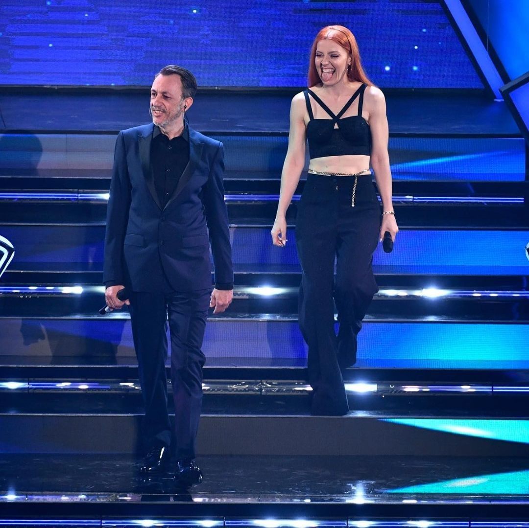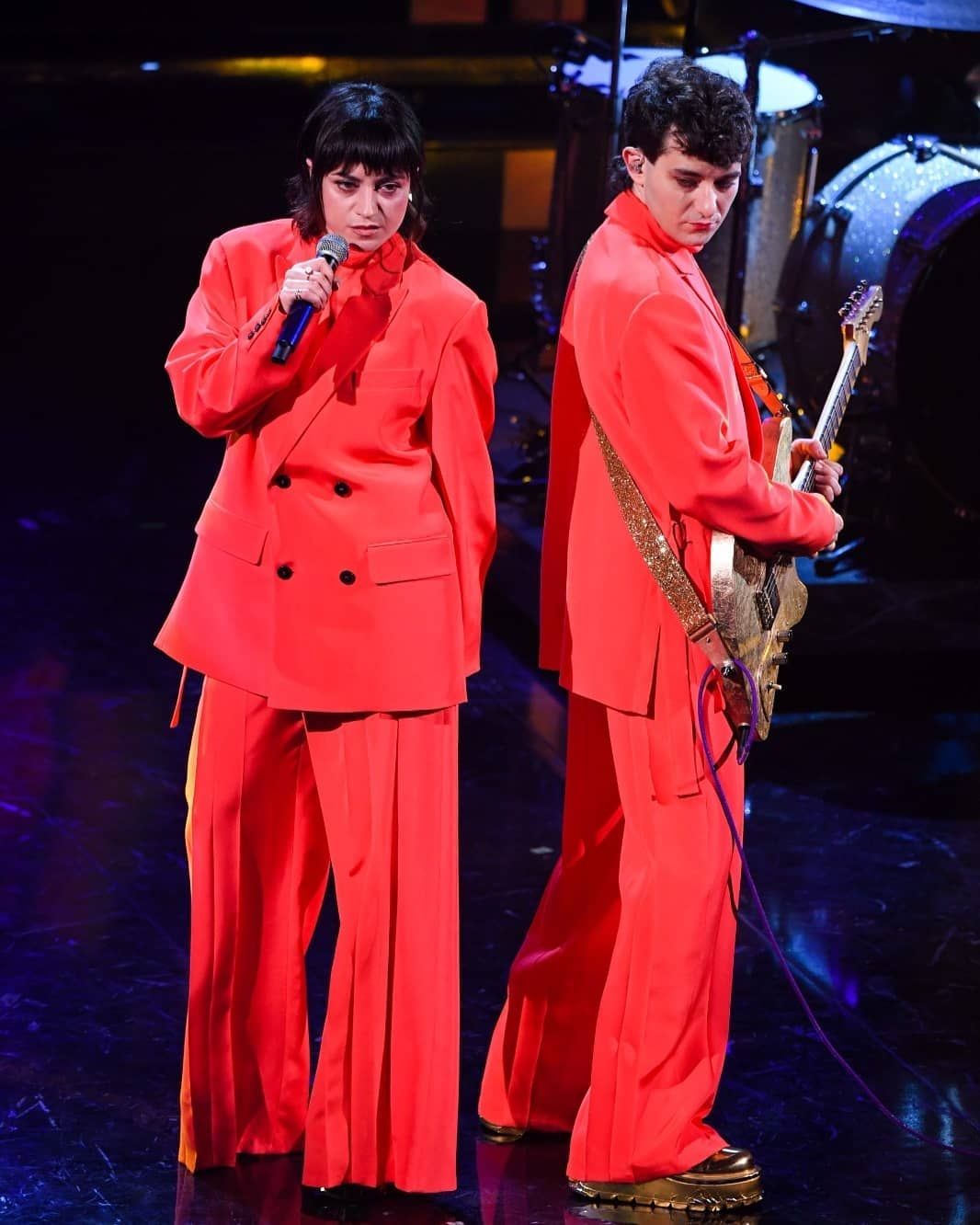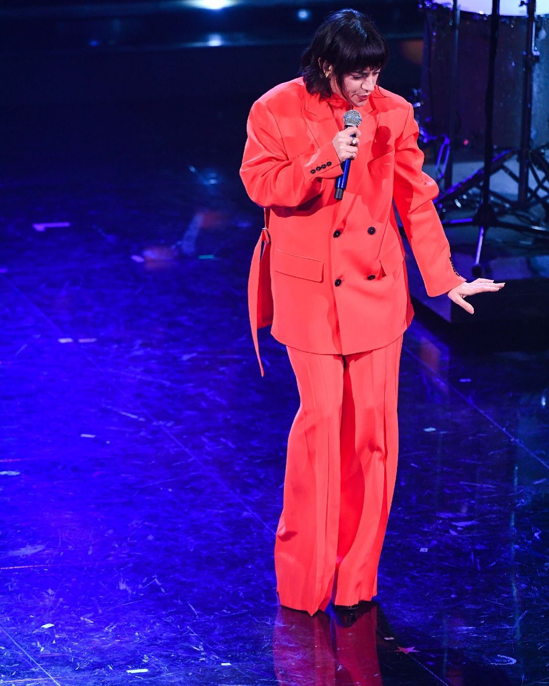 Look: Entrambi in power suit rosso fuoco di Valentino. Come nella prima esibizione total pink, sono coordinati e in sintonia. La sferzata d’energia la dà Donatella Rettore con una performance nostalgica e divertente (il suo outfit... preferiamo non commentarlo).