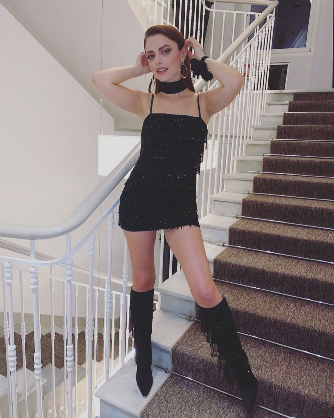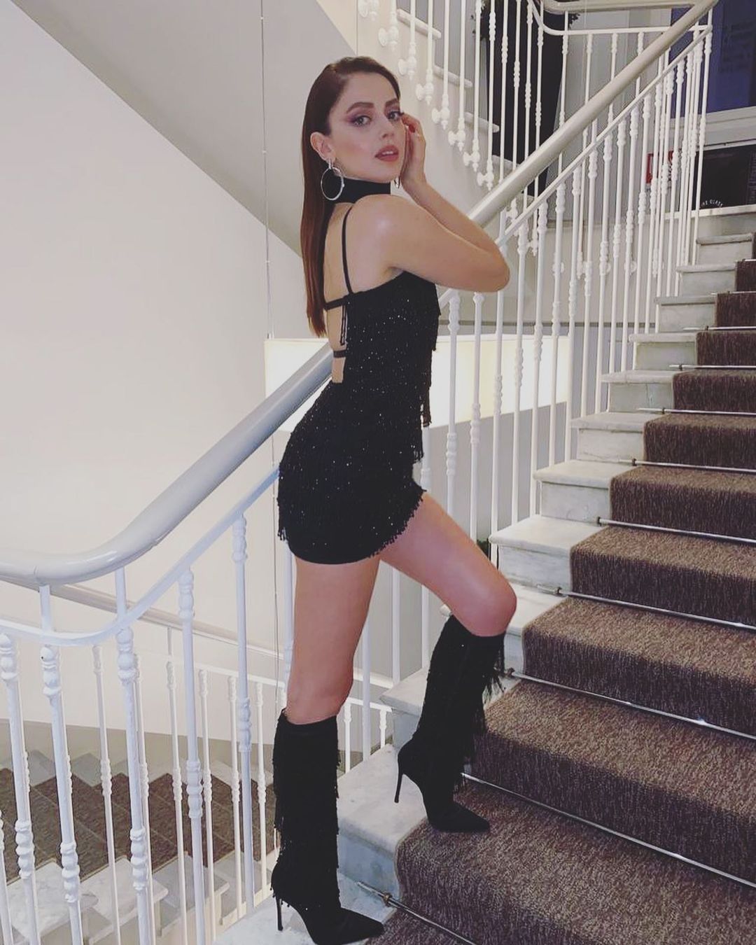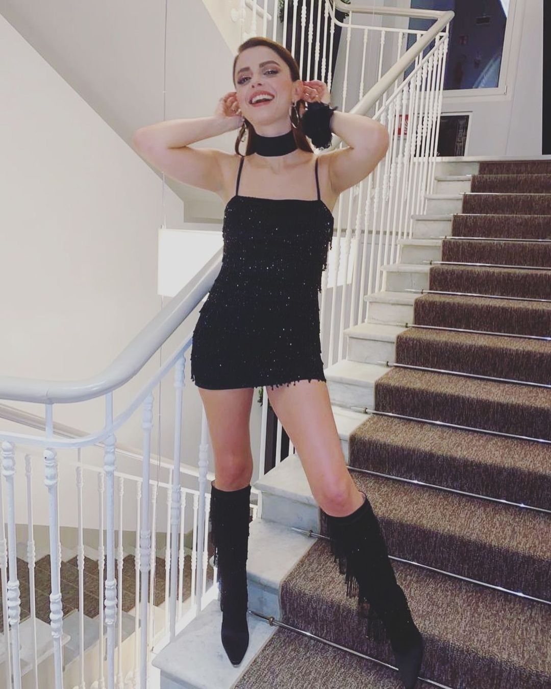 Look: Scintillanti frange charleston dappertutto, anche sugli stivali, maxi orecchini a cerchio, chocker voluminoso. Un po’ troppo tour di Madonna anni ’80 / letterina di Passaparola. Anche il make-up è glow, la valorizza, ma forse in questo look ci sono troppi bling bling.
