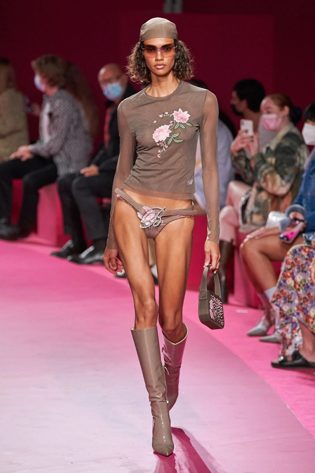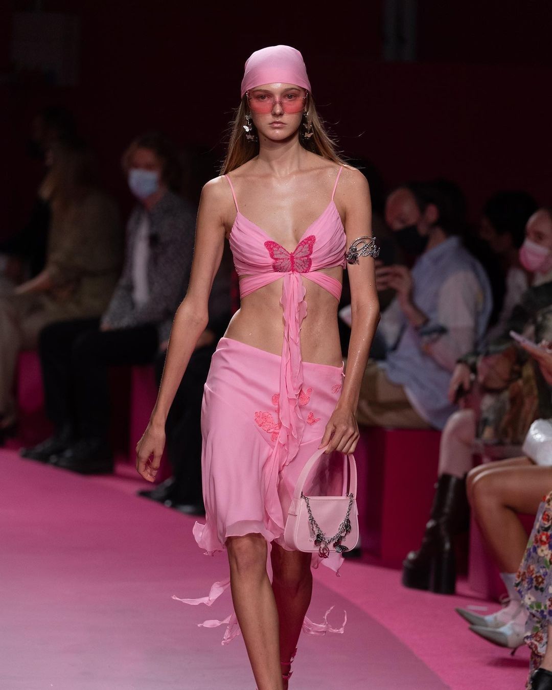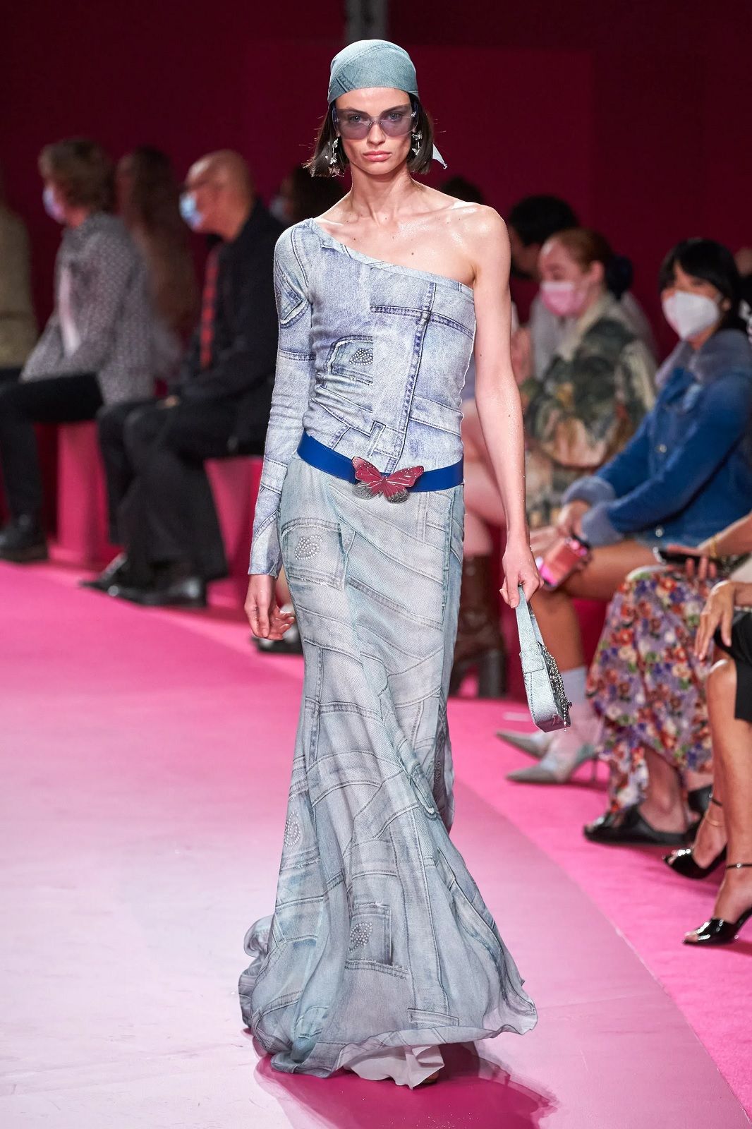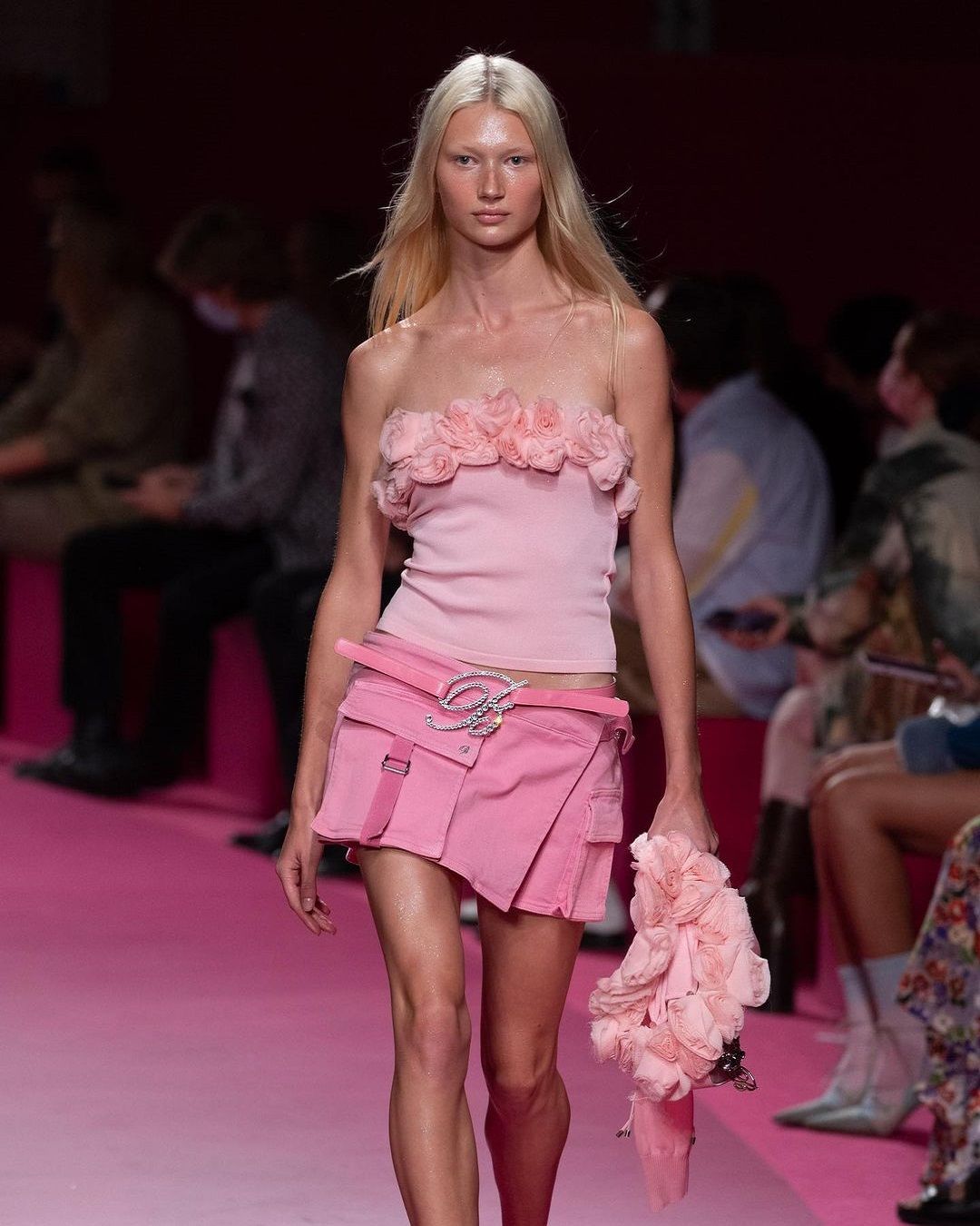 Nella collezione primavera-estate 2022, Blumarine rivisita i codici dell’estetica dei primi anni 2000, portando in passerella il glamour girlie di Britney Spears e Paris Hilton per la Gen Z. Tutto ad un tratto, Milano diventa la California all’alba del nuovo millennio: Mariah Carey arriva sul red carpet del concerto VH1 Divas Live con uno striminzito top a farfalla, Missy Elliot ritira il Grammy per Best rap solo performance in una tuta adidas total pink, alla tv Destiny’s Child si dimenano sulle note di Survivor in outfit mimetici coordinati e Alicia Keys occupa le cover dei maggior magazine con la bandana ed il thong glitterato che spunta dai jeans. Di questo viaggio indietro nel tempo Nicola Brognano riprende reference e mood, aggiungendo una buona dose di frivolezza, divertimento e, soprattutto, sexiness che, insieme allo styling di Lotta Volkova, rende le nuove creazioni del brand milanese irresistibili.