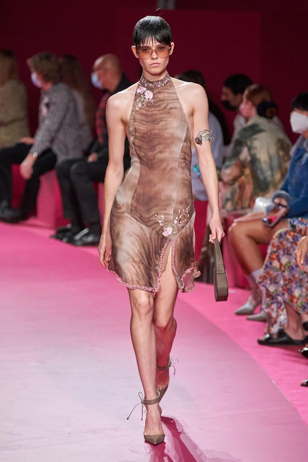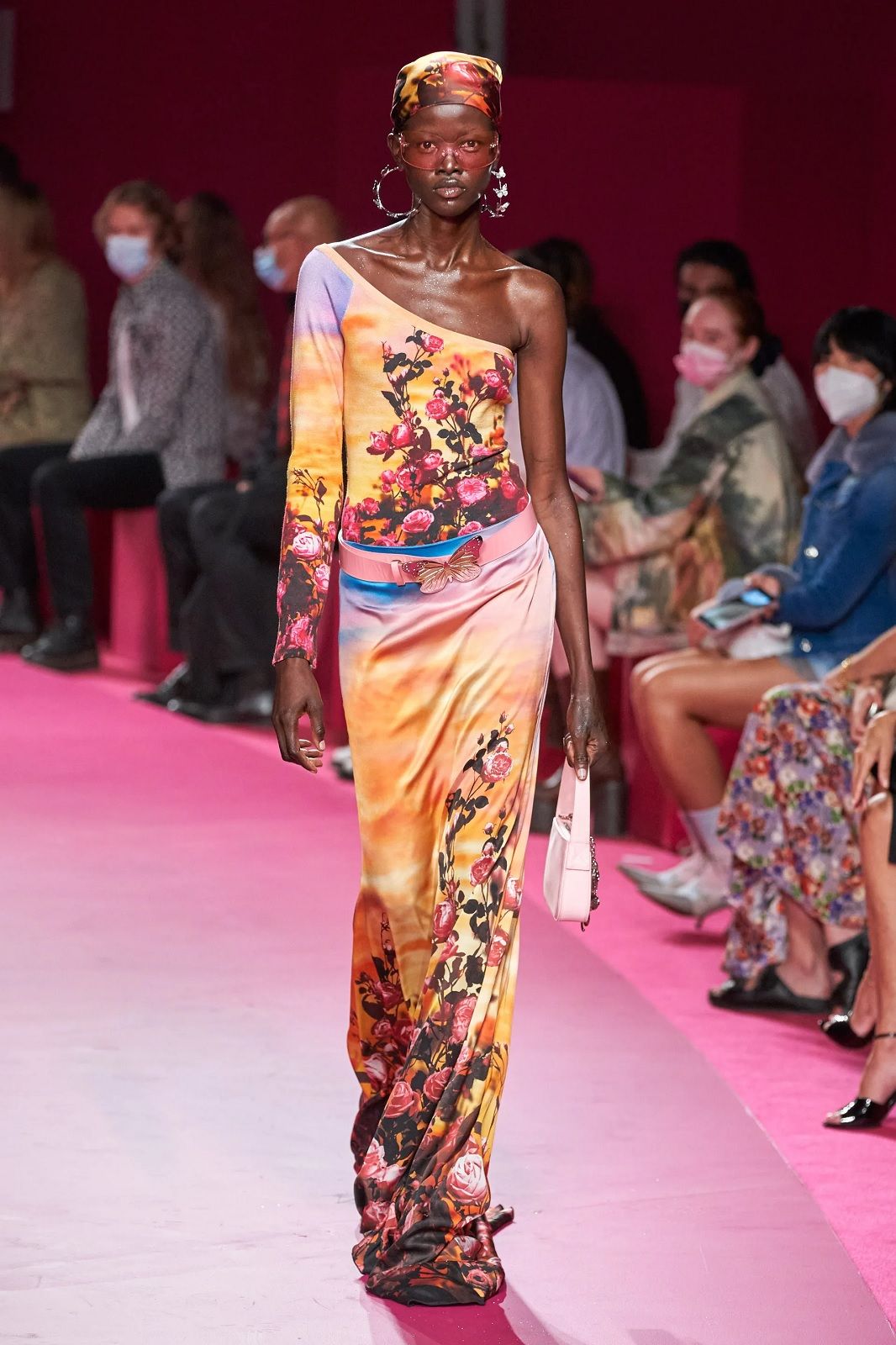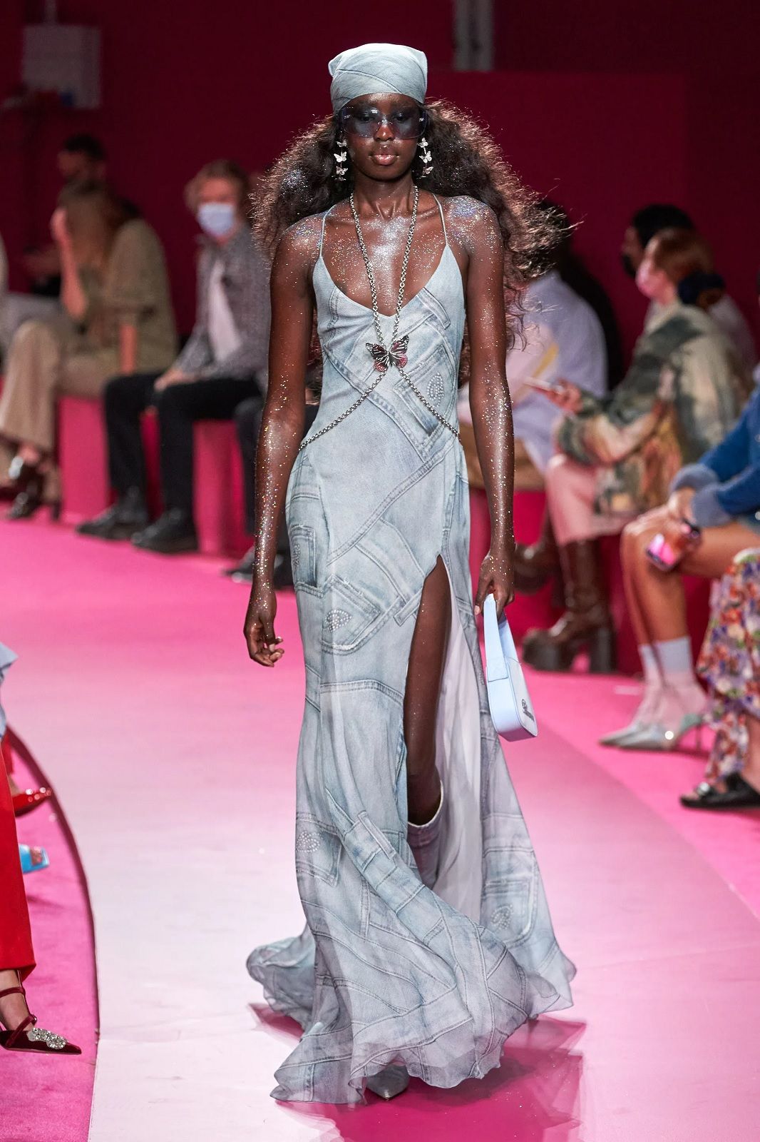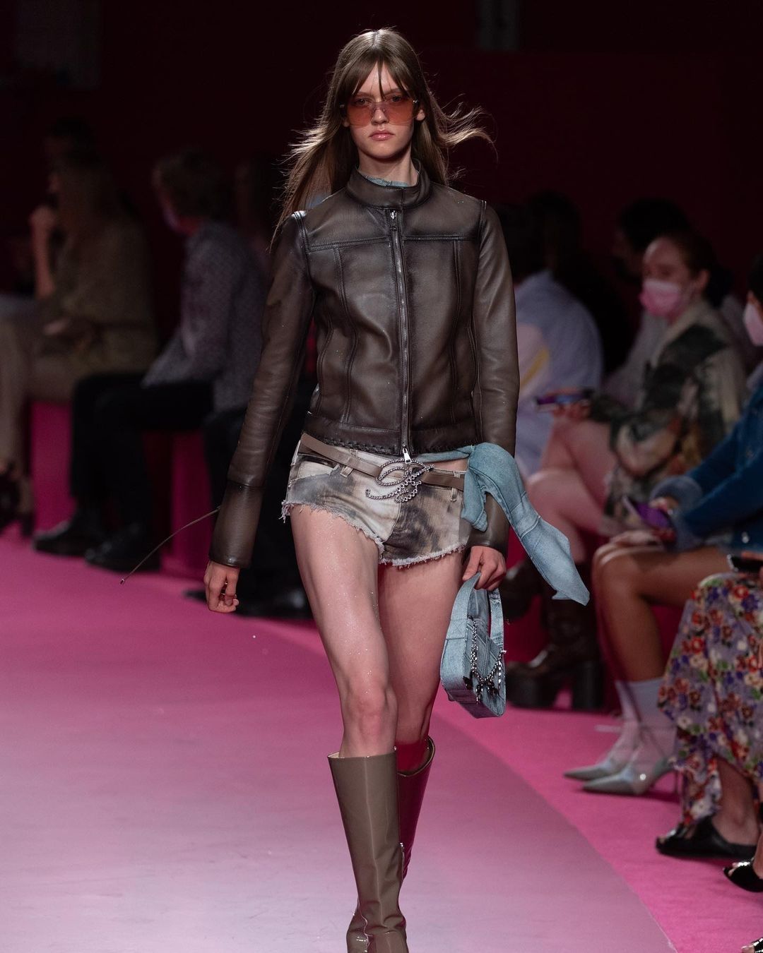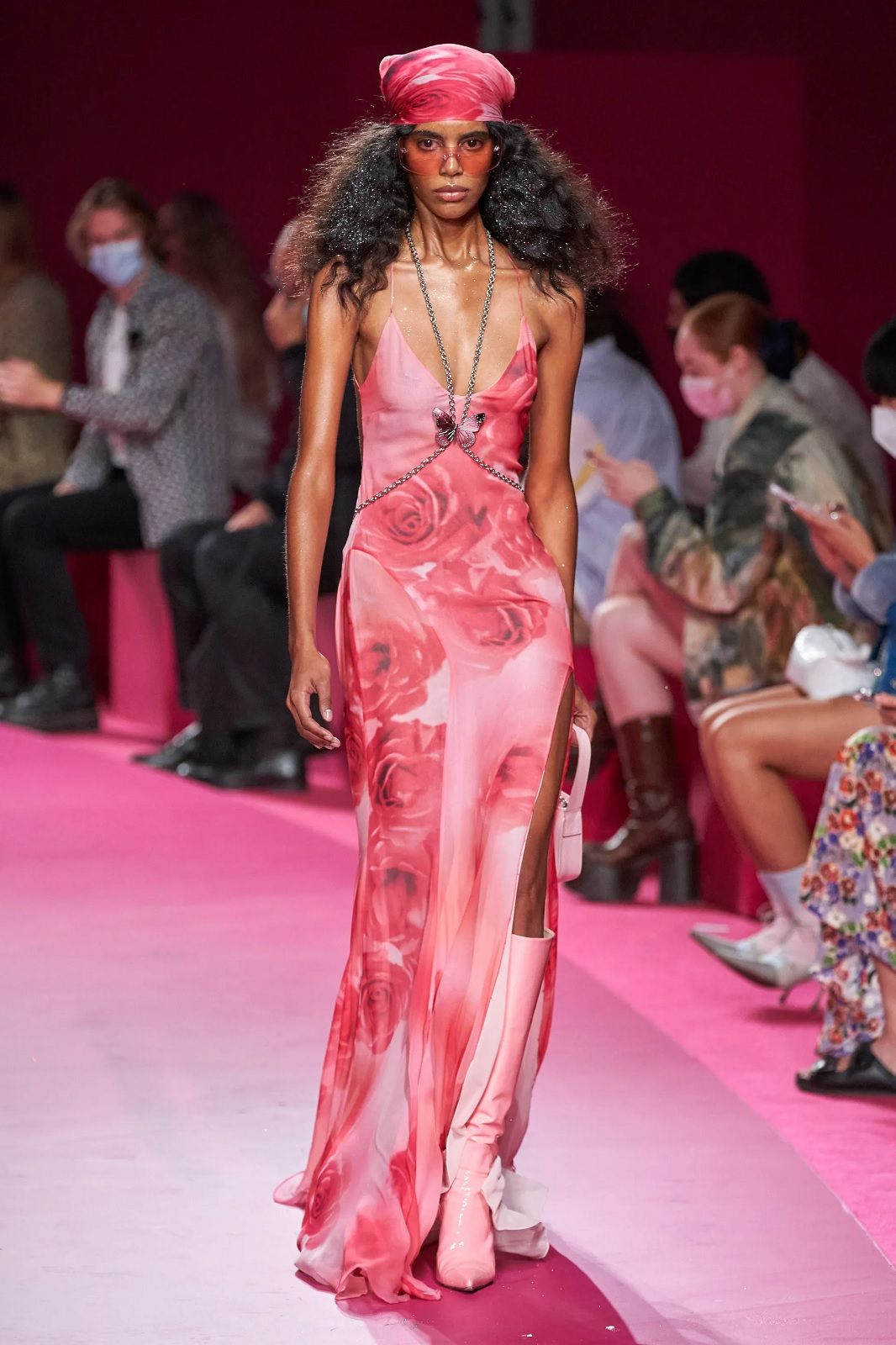 Nella collezione primavera-estate 2022, Blumarine rivisita i codici dell’estetica dei primi anni 2000, portando in passerella il glamour girlie di Britney Spears e Paris Hilton per la Gen Z. Tutto ad un tratto, Milano diventa la California all’alba del nuovo millennio: Mariah Carey arriva sul red carpet del concerto VH1 Divas Live con uno striminzito top a farfalla, Missy Elliot ritira il Grammy per Best rap solo performance in una tuta adidas total pink, alla tv Destiny’s Child si dimenano sulle note di Survivor in outfit mimetici coordinati e Alicia Keys occupa le cover dei maggior magazine con la bandana ed il thong glitterato che spunta dai jeans. Di questo viaggio indietro nel tempo Nicola Brognano riprende reference e mood, aggiungendo una buona dose di frivolezza, divertimento e, soprattutto, sexiness che, insieme allo styling di Lotta Volkova, rende le nuove creazioni del brand milanese irresistibili.