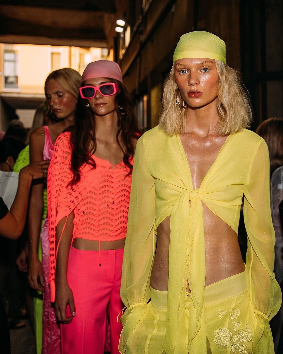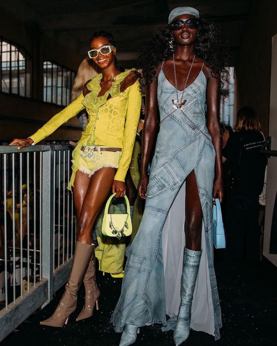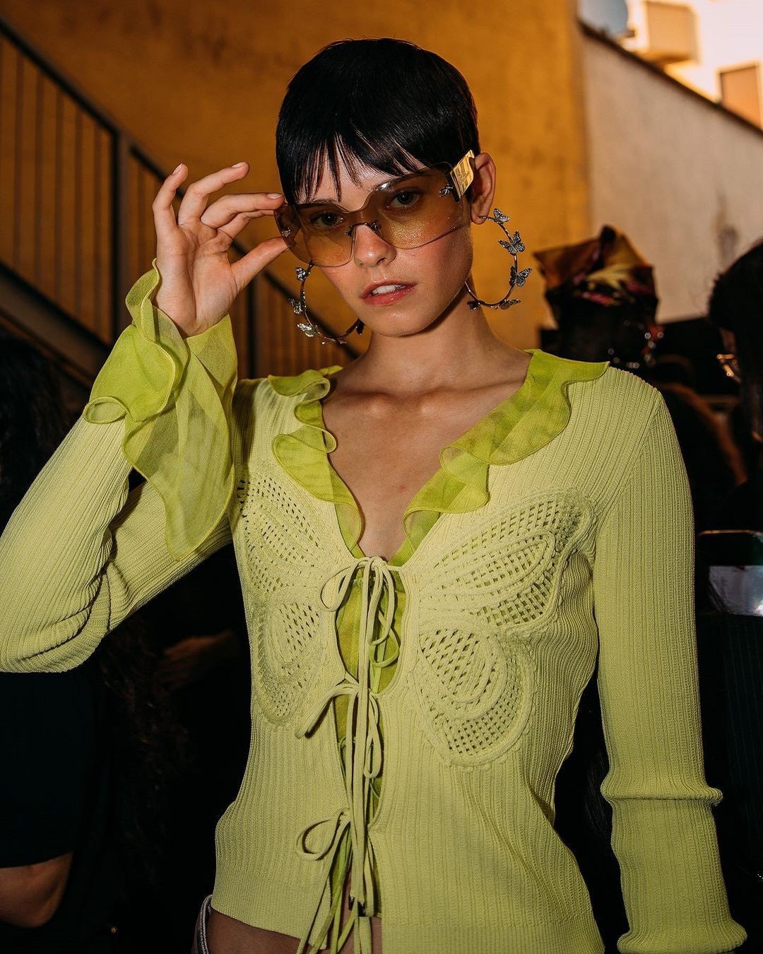 È fin troppo facile immaginare Bella Hadid, Dua Lipa o Olivia Rodrigo, già fan della Blumarine 2.0, sfoggiare in diverse occasioni le t-shirt velate, le minigonne, gli abiti lunghi e trasparenti, i micro bikini, i top a farfalla, i golfini bordati in visone rigenerato, i pantaloni in chiffon da abbinare a bluse eteree e piene di ruches, i micro shorts di jeans, i capi realizzati con patchwork di denim o i mini dress decorati con le rose.