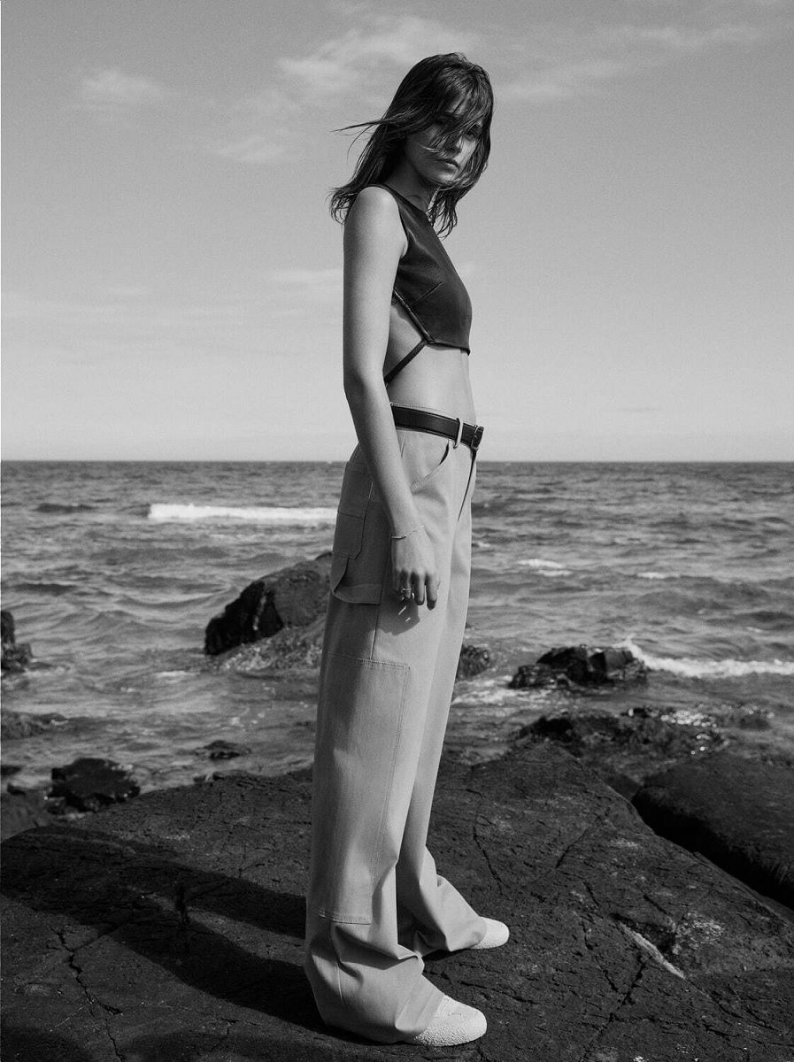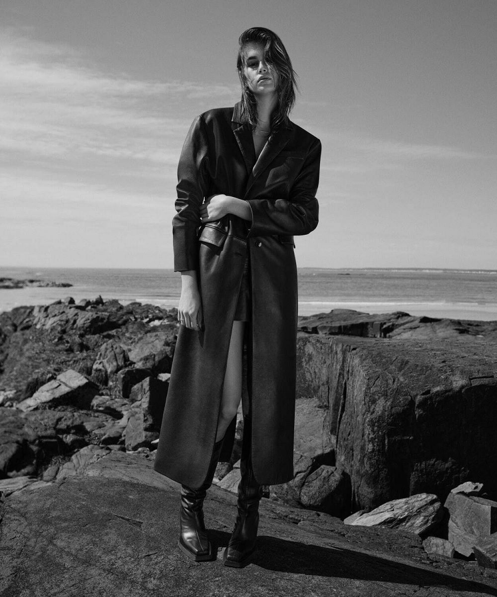 Partendo da questi presupposti la figlia di Cindy Crawford ha creato un sapiente insieme di abbigliamento ed accessori dalle silhouette minimali e dai toni neutri che vanno dal nero al bianco, dal grigio al blu navy fino al cammello del classico cappotto lungo o dei pantaloni workwear.