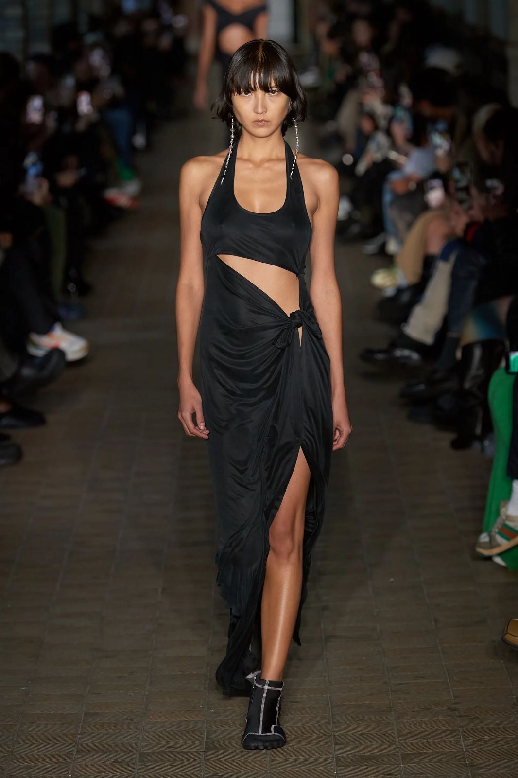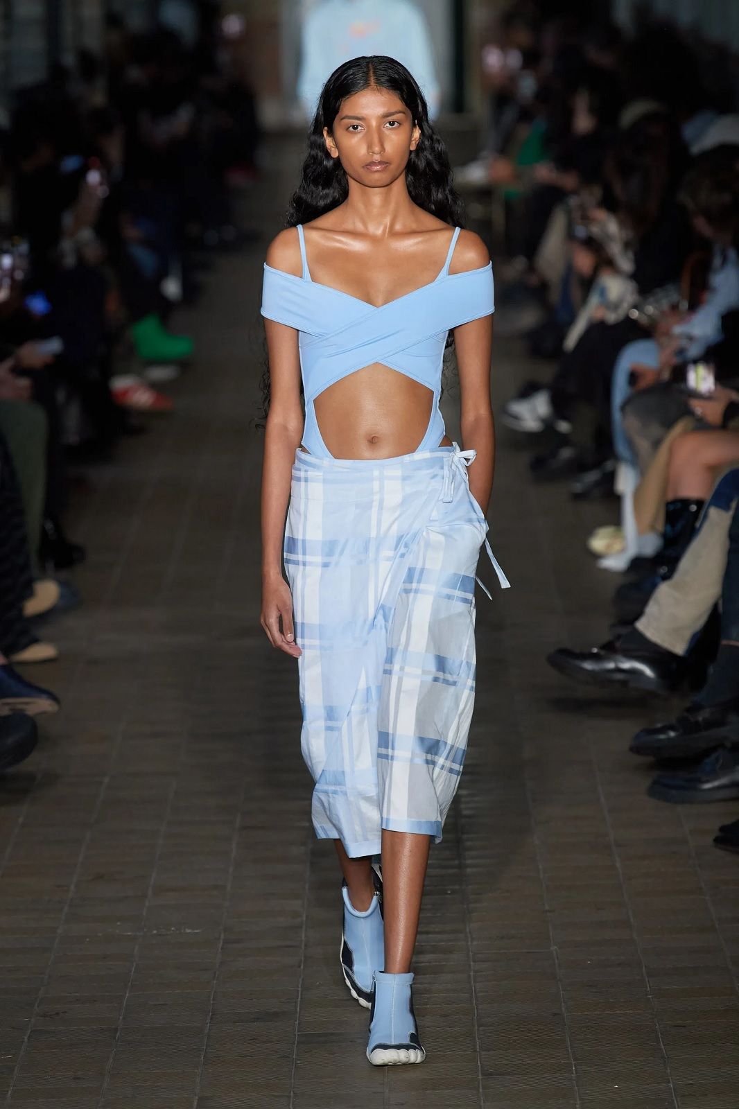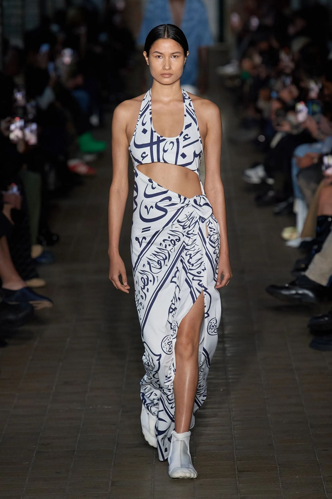 Così sui bottoni spuntano gli evil eyes, le gonne e gli abiti ricordano eleganti sarong da abbinare a micro top e camicie dalle silhouette morbide, le giacche sono mini dress che si indossano con maxi stivaloni i long dress sono see-through e hanno spacchi profondi, i capi in pelle conferiscono un twist sexy, mentre le pellicce finte e maxi danno un tocco di glamour alla combo shorts più camicia e cravatta. A rendere speciali la collezione ci sono le stampe sviluppate con l'artista indonesiano di Giava Muhammad "Rofi" Fatchurofi che si ispirano alle proprietà trasformative dell'acqua e due collaborazioni importanti, una con ASICS e una con Scholl Iconic con i suoi modelli in legno presentati in collaborazione con Gmbh con un'innovativa e tecnica tomaia in rete, riprendendo il filo del comfort iconico che ha distinto gli zoccoli già negli anni '70 e portandoli ad un livello estetico successivo. il brand tedesco hanno presentato una gamma di sandali con tomaia in rete tecnica.