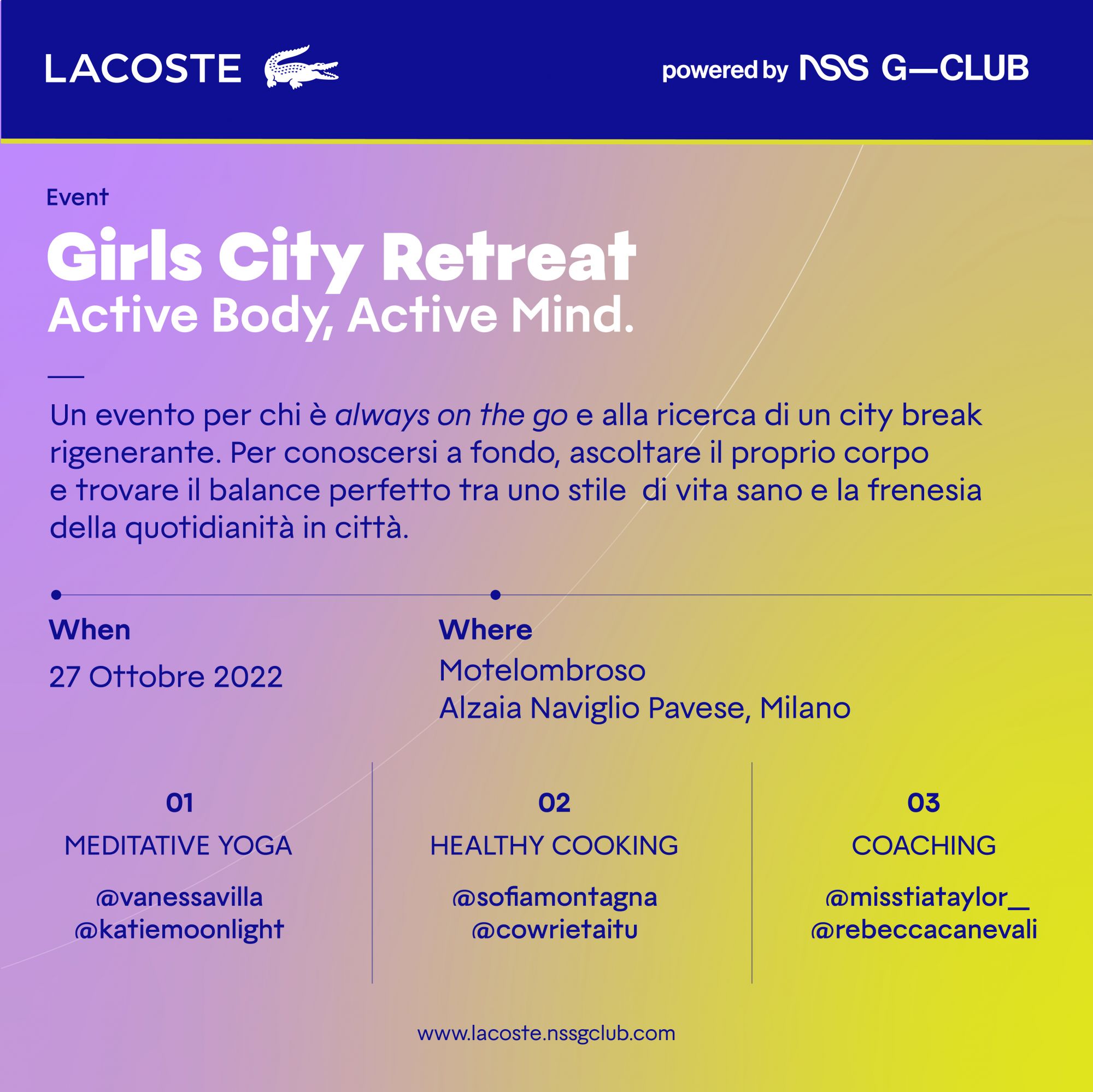 Per comunicare alla community italiana i valori di Lacoste Fashion Sport il brand ha voluto creare uno spazio dedicato all'universo femminile: il 27 ottobre si terrà l'evento Lacoste Girls City Retreat, dedicato all'universo femminile per chi è always on the go e alla ricerca di un city break rigenerante. L'evento sarà aperto al pubblico, previa registrazione che dovrà essere confermata via e-mail, dove i partecipanti avranno l'opportunità di scegliere una classe tra Healthy Cooking, Meditative Yoga e Coaching alla quale partecipare. Tutte le classi saranno guidate da ospiti speciali, powered by nss G-Club.