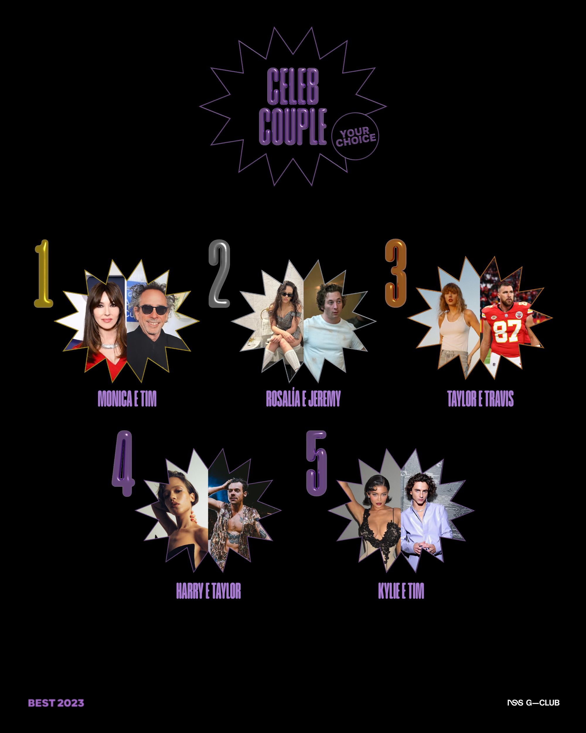 Nel corso dell’ultimo anno Cupido ha lanciato le sue frecce e ha fatto sbocciare nuovi amori: Rosalía e Jeremy Allen White, Harry Styles e Taylor Russell, Taylor Swift e Travis Kelce, Kylie Jenner e Timothée Chalamet, ma soprattutto Monica Bellucci e Tim Burton. Per la community di G-Club l’attrice e il regista formano la migliore celeb coppia del 2023, testimoniando che l’amore può bussare alla porta in ogni momento, ad ogni età e anche tra chi non ci saremmo mai immaginati. Il new couple alert è partito per la prima volta lo scorso febbraio quando Monica e Tim sono stati notati insieme a Madrid e, poco dopo, mentre si baciavano a Parigi. A confermare la liaison è stata la stessa Monica in un'intervista con Elle France in cui ha detto di aver trovato un'anima affine "con cui condividere un mondo da sogno" ed ha aggiunto "è la cosa più bella che mi sia mai successa". Noi siamo felici per lei e per entrambi.