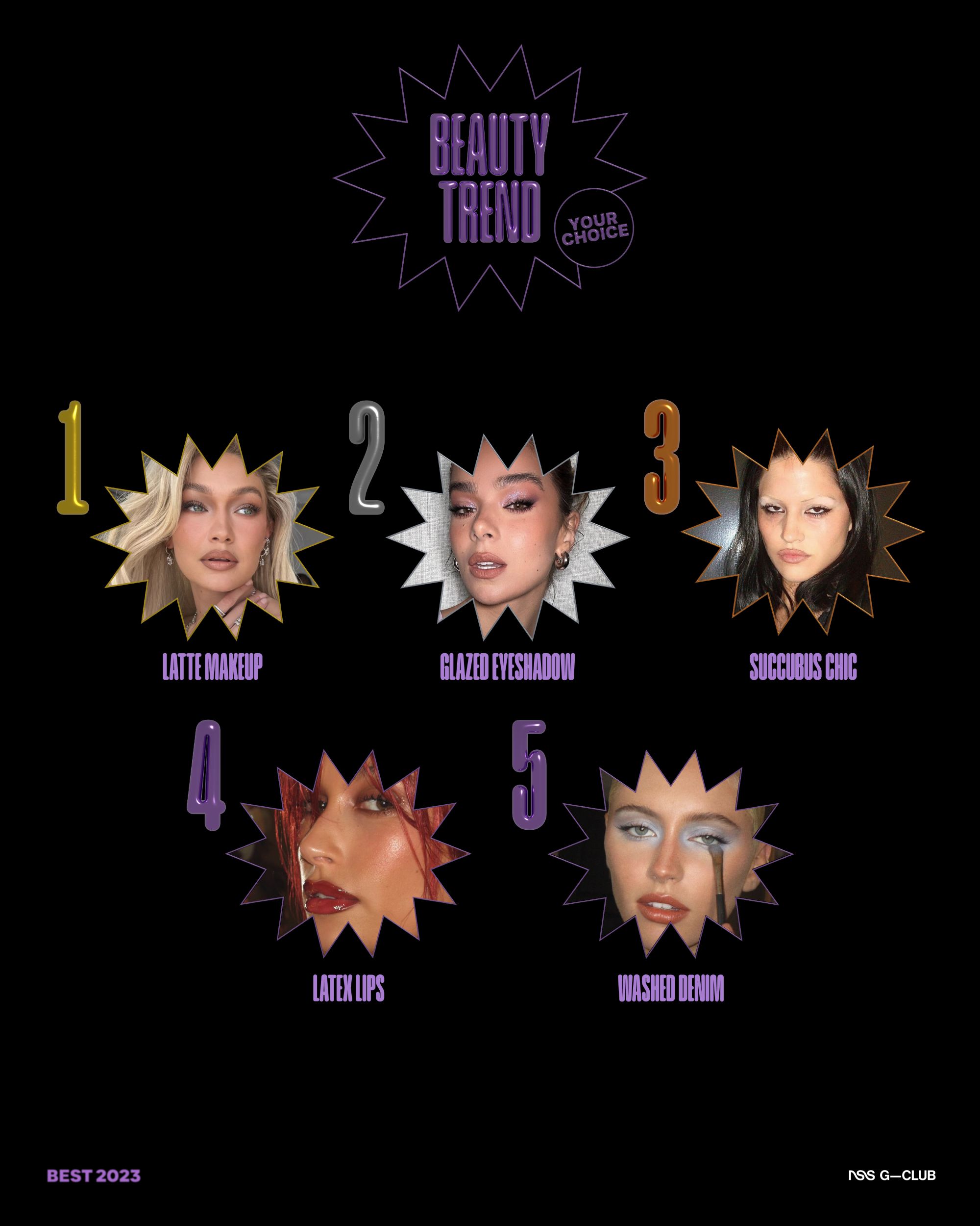 Il migliore beauty trend del 2023 secondo la community di G-Club è il Latte makeup con i suoi toni caramello che richiama i toni del café au lait. Questo smokey luminoso dai colori caldi che incanala perfettamente il mood estivo ha continuato ad accompagnarci anche nei mesi freddi, donando al nostro viso un aspetto sun kissed tutto l’anno. Gli altri trend che abbiamo amato? Al secondo posto della classifica c’è il Glazed Eyeshadow con il suo effetto ultra shine, al terzo il look gotico Succubus Chic, al quarto le Latex Lips e al quinto il Washed Denim makeup che conferma l’ossessione beauty per l’ombretto azzurro, ma in un colore blu indaco che riproduce l'effetto "vissuto" dei jeans che con il tempo e l'usura stingono.