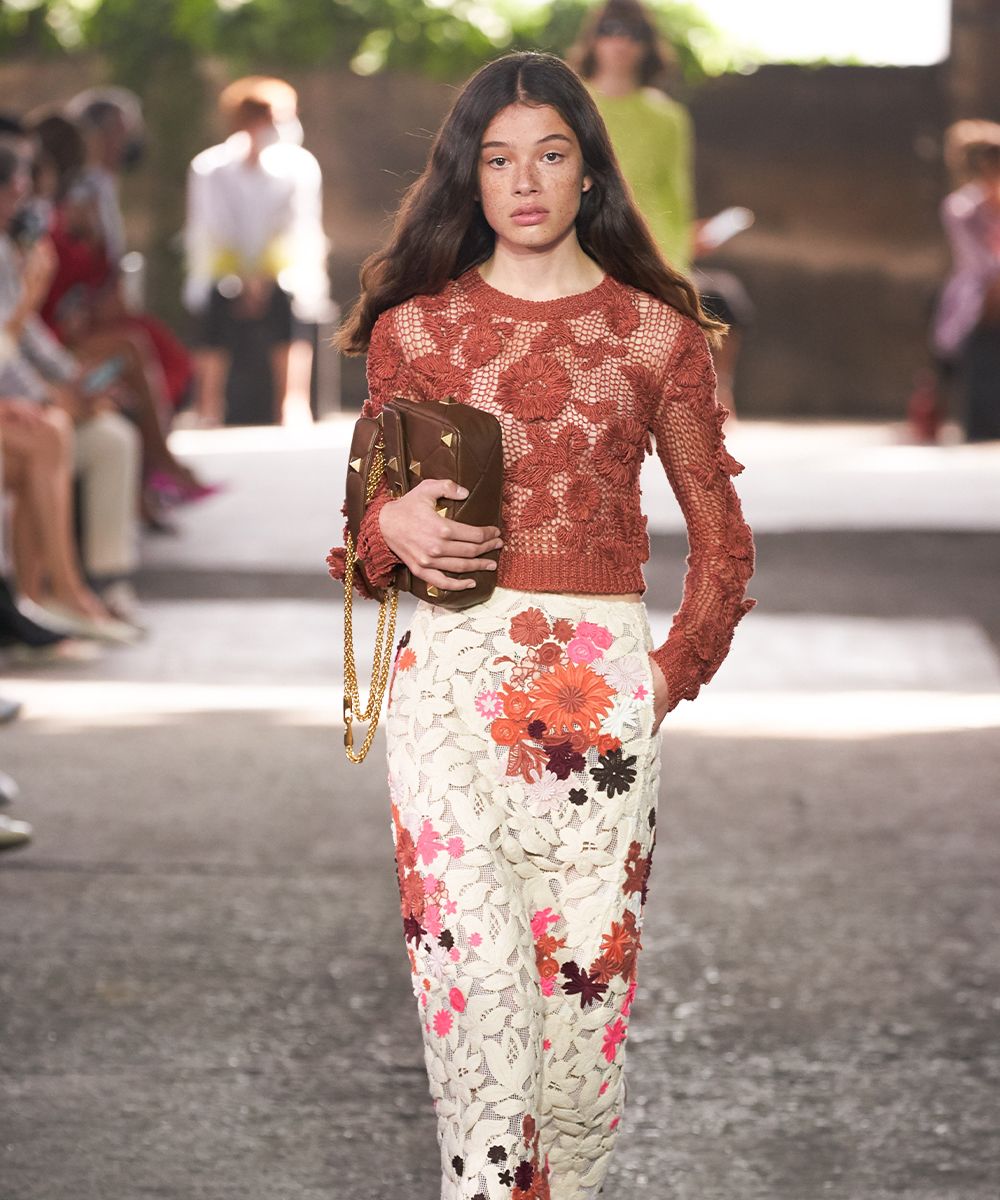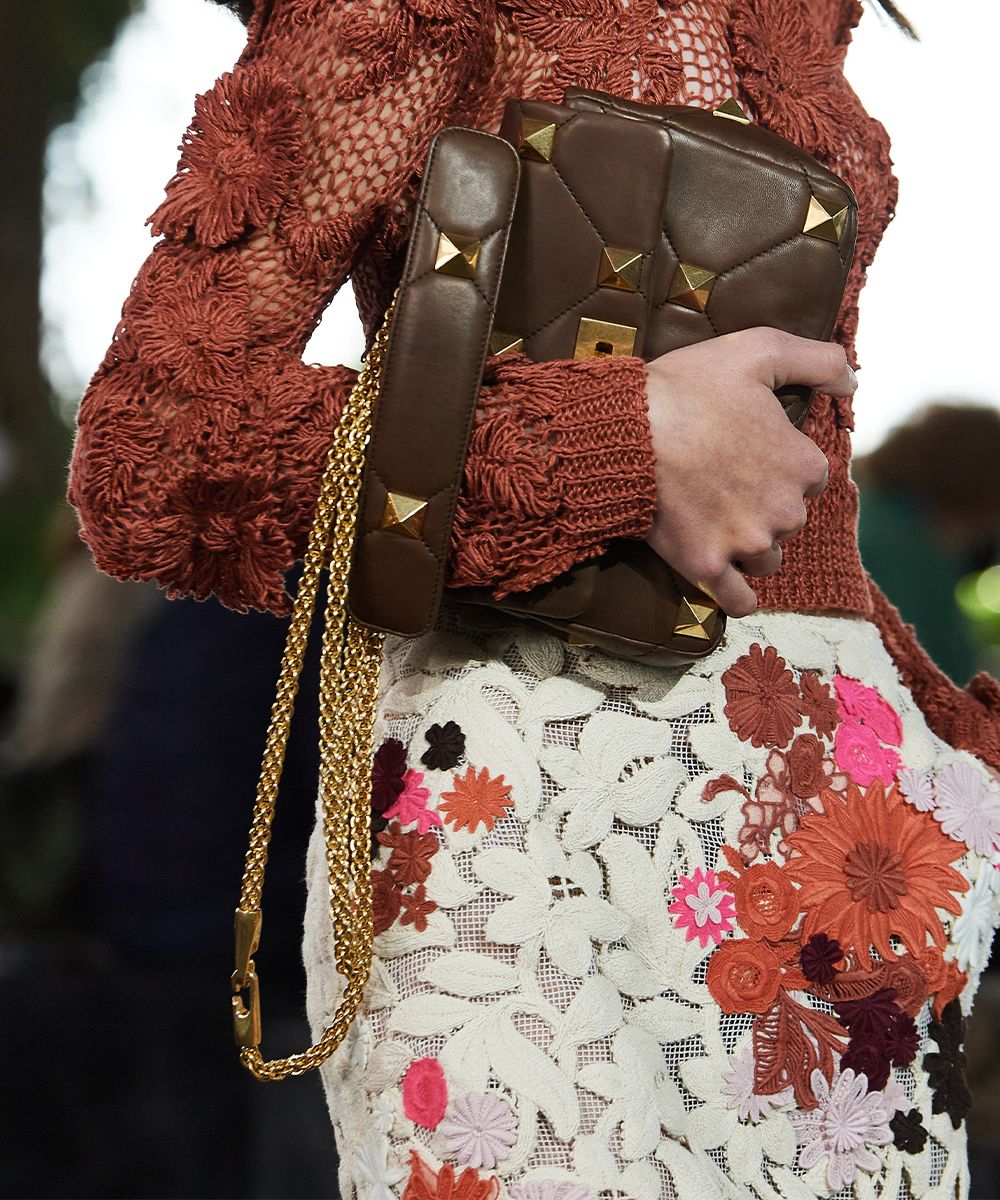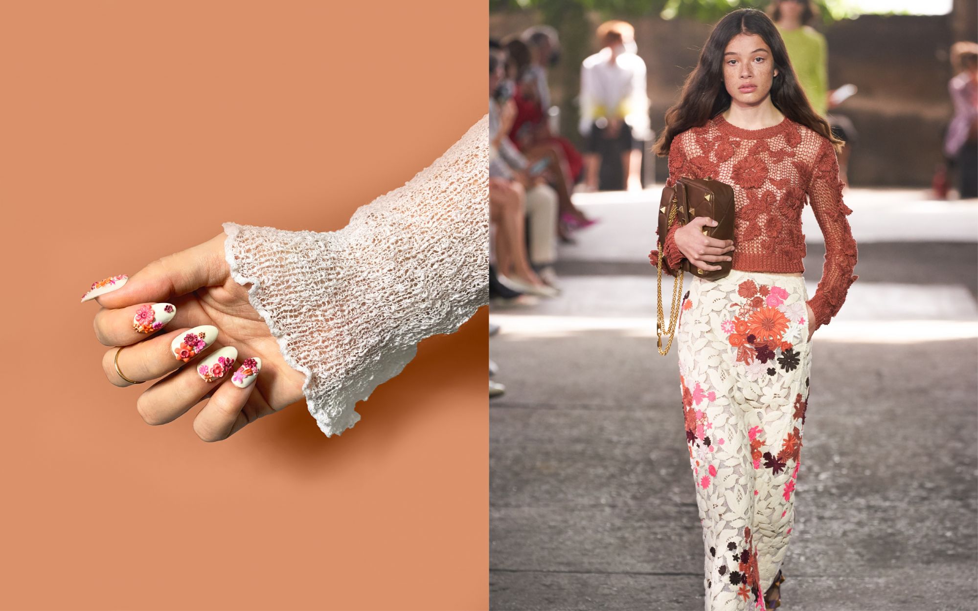 Per la sua collezione SS21, Valentino realizza una serie di look eterei: le bluse sono fatte di chiffon, gli abiti diventano fluidi come quelli di un dipinto Liberty e pizzi e crochet diventano macro come anche le borchie Rockstud. La stessa leggerezza si riflette nel motivo floreale della nail art, che somiglia ad un ricamo.