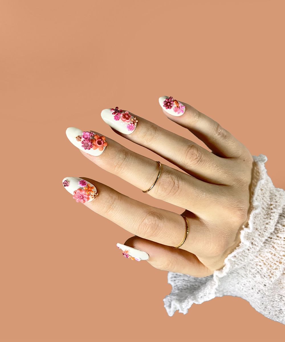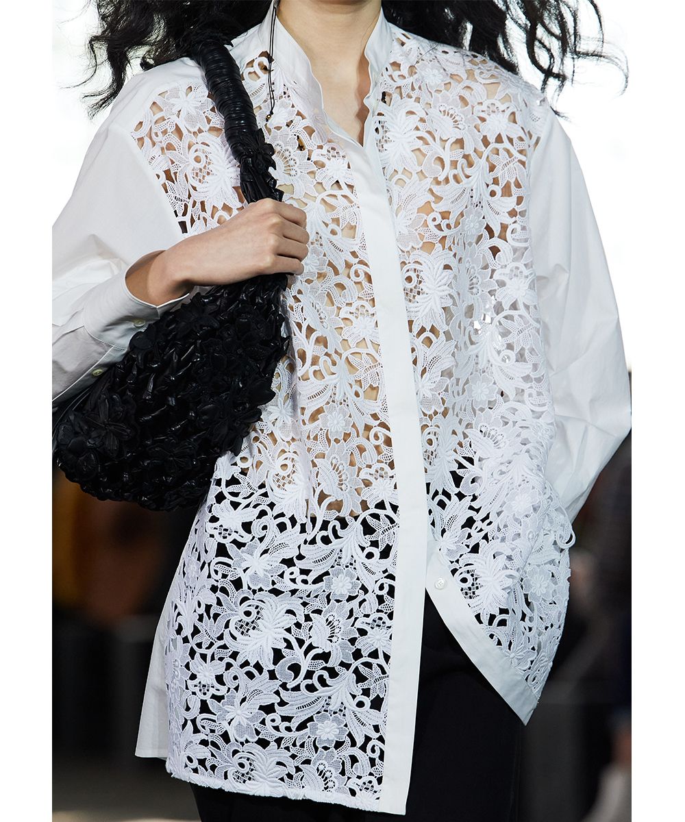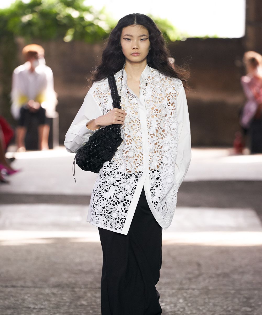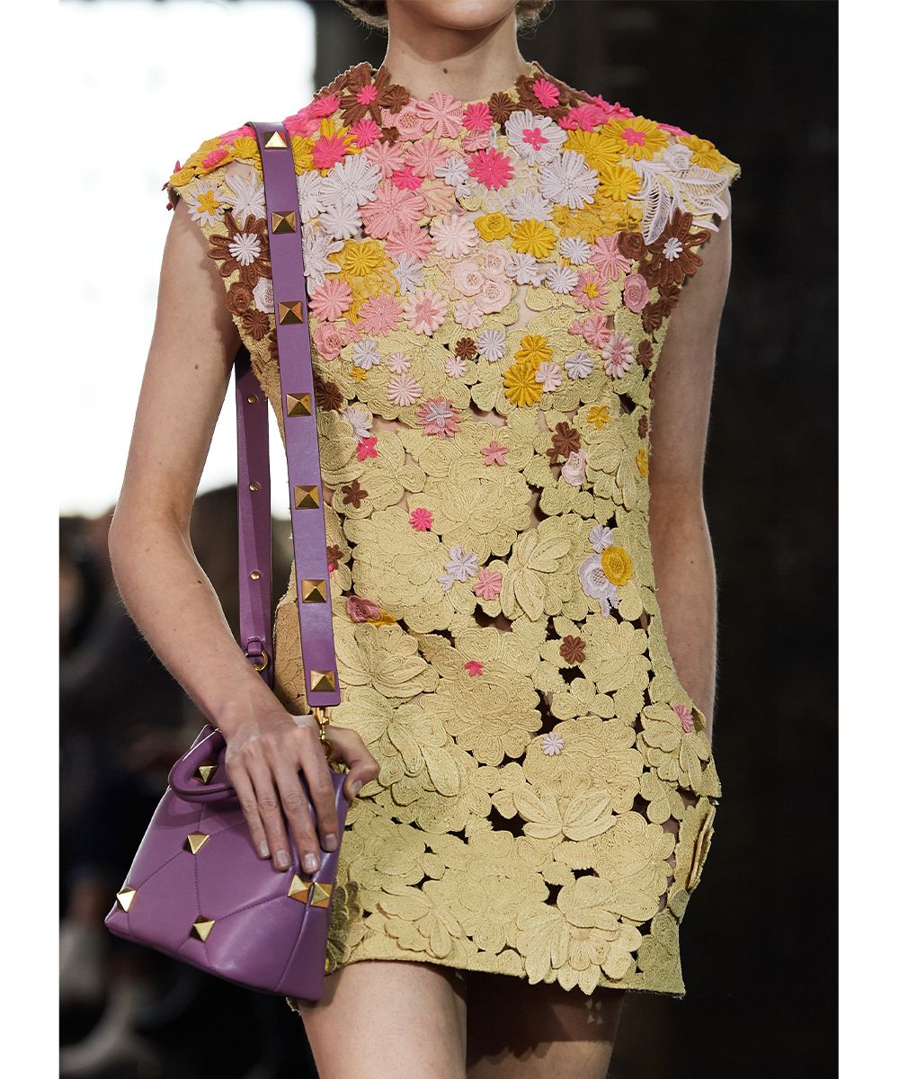 Per la sua collezione SS21, Valentino realizza una serie di look eterei: le bluse sono fatte di chiffon, gli abiti diventano fluidi come quelli di un dipinto Liberty e pizzi e crochet diventano macro come anche le borchie Rockstud. La stessa leggerezza si riflette nel motivo floreale della nail art, che somiglia ad un ricamo.