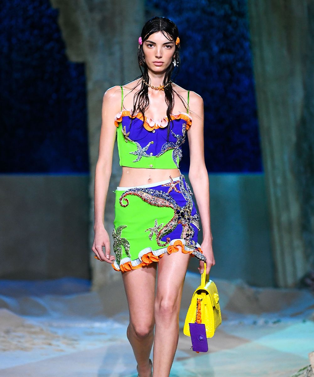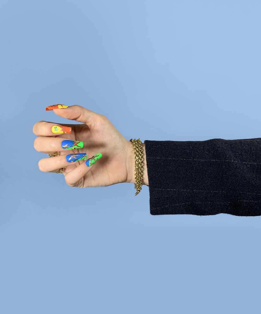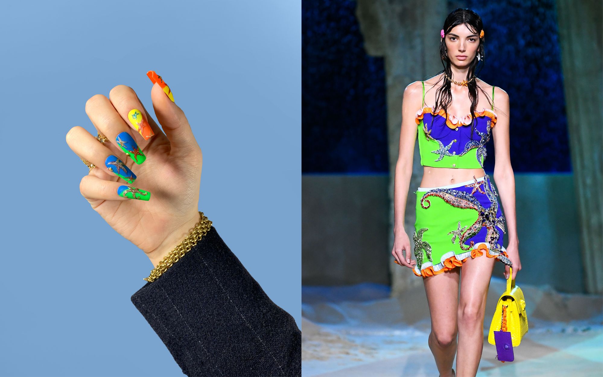 La collezione Versace SS21 ha fatto immergere gli spettatori (virtuali) in un immaginario mondo sottomarino chiamato Versacepolis, fatto di conchiglie, colori vibranti, stelle marine, glitter, riprese sui capi gessati e sui mini dress giocosi. La nail art, realizzata su unghie squadrate e extra long, riprende i colori e gli elementi marini della collezione.