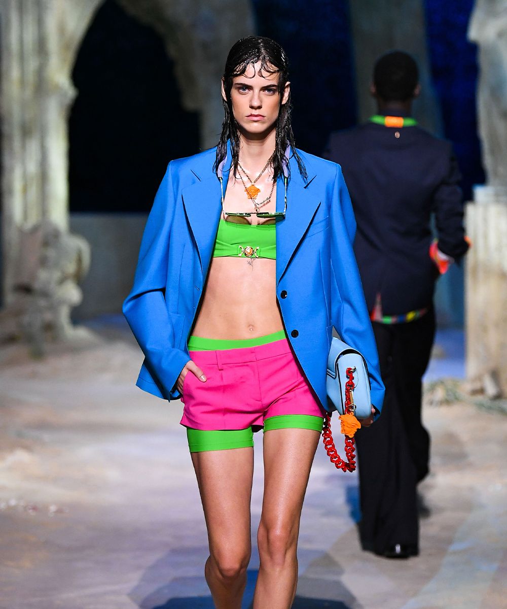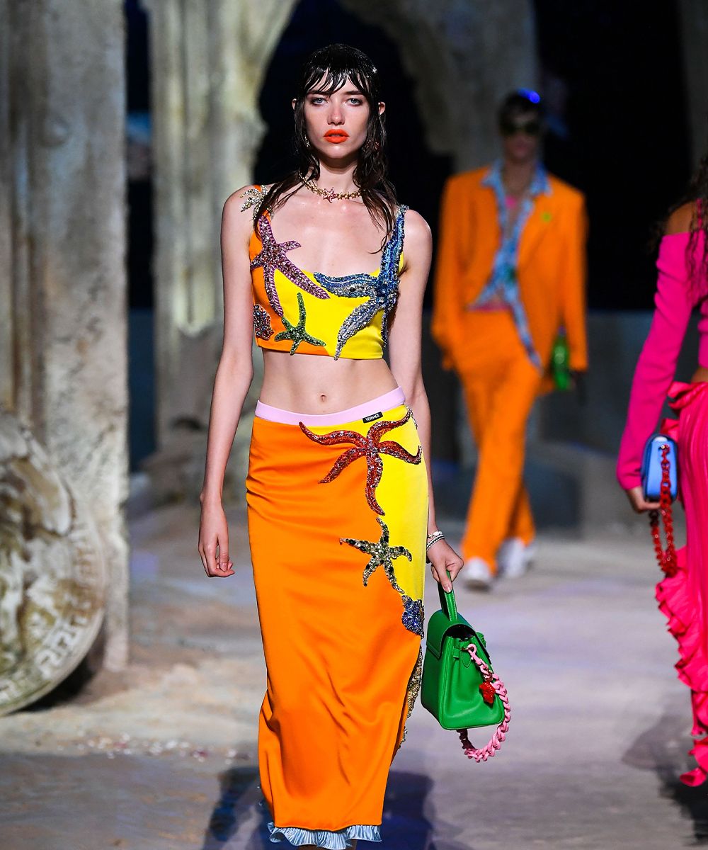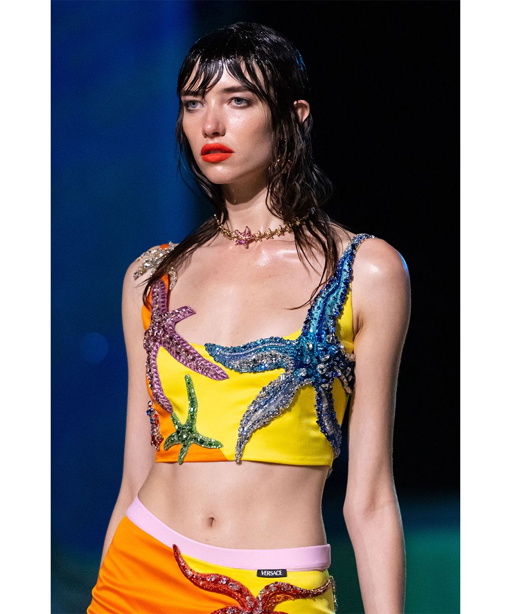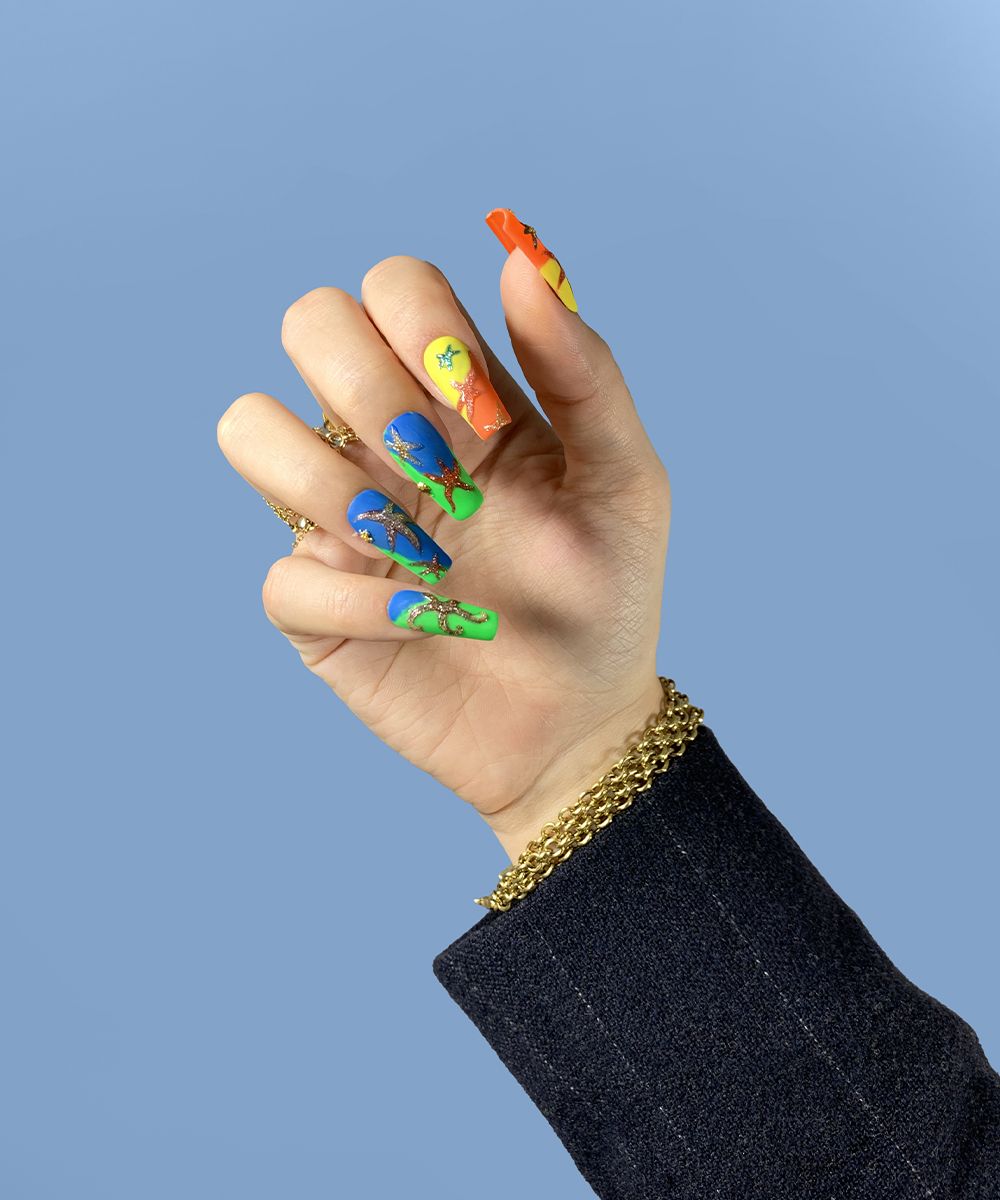 La collezione Versace SS21 ha fatto immergere gli spettatori (virtuali) in un immaginario mondo sottomarino chiamato Versacepolis, fatto di conchiglie, colori vibranti, stelle marine, glitter, riprese sui capi gessati e sui mini dress giocosi. La nail art, realizzata su unghie squadrate e extra long, riprende i colori e gli elementi marini della collezione.