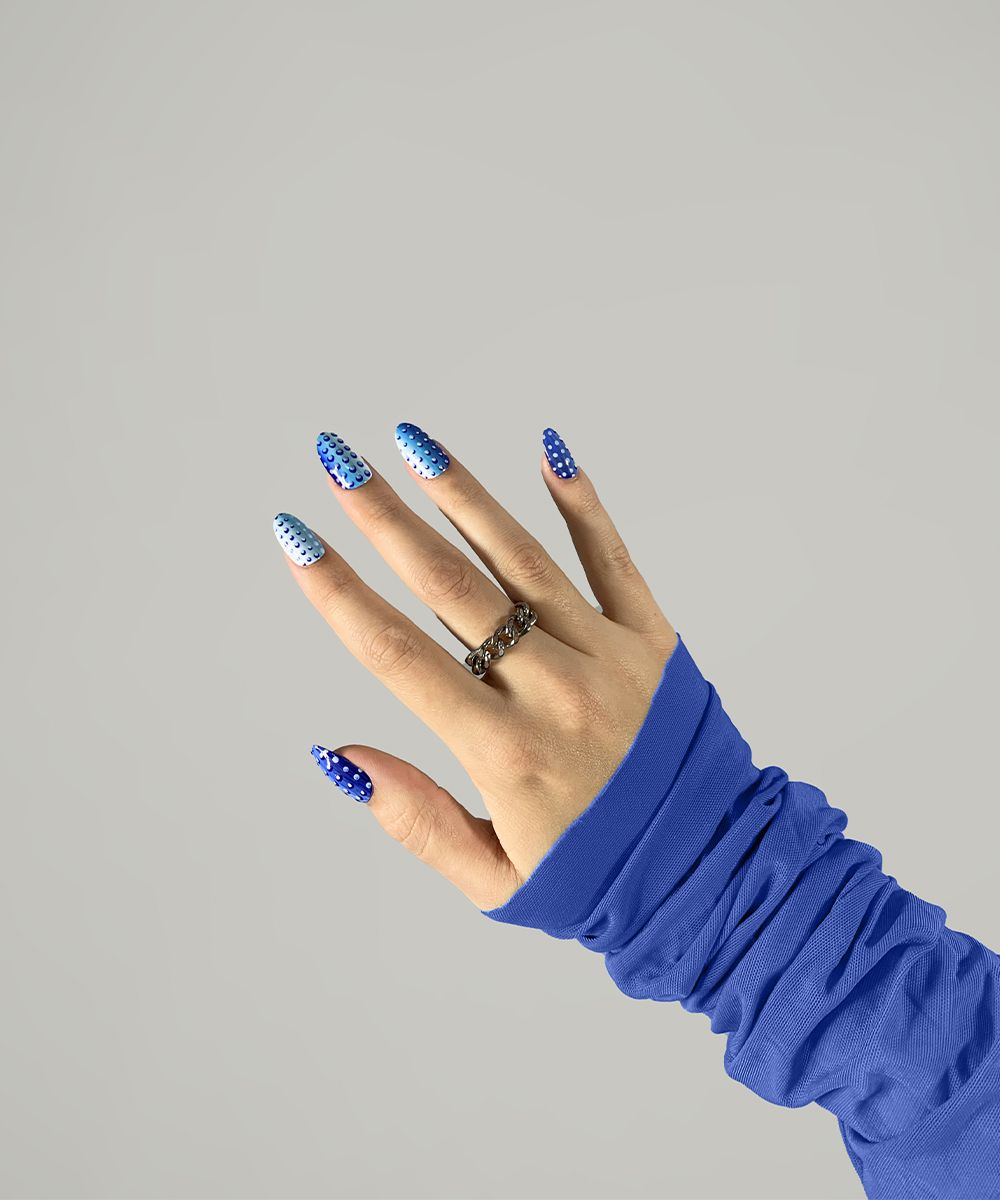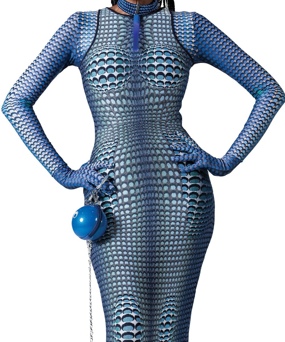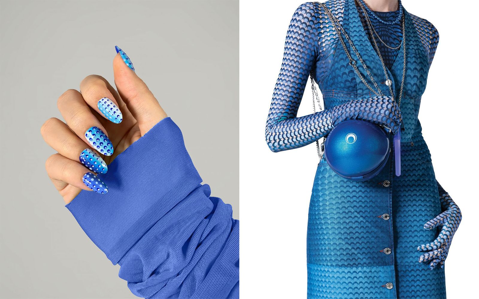 Marine Serre, nella sua collezione SS21 presentata attraverso un cortometraggio Amor Fati, veste la contemporaneità con un twist futuristico, fatto di una serie di pezzi funzionali realizzati in nylon biodegradabile, body second skin con la caratteristica luna crescente, declinati in una nuova palette che va dal blu elettrico al rosso ai più classici bianco, nero e marrone. L'inedito blu è anche protagonista della nail art ispirata alla collezione, decorato con il pattern-logo della luna all over.