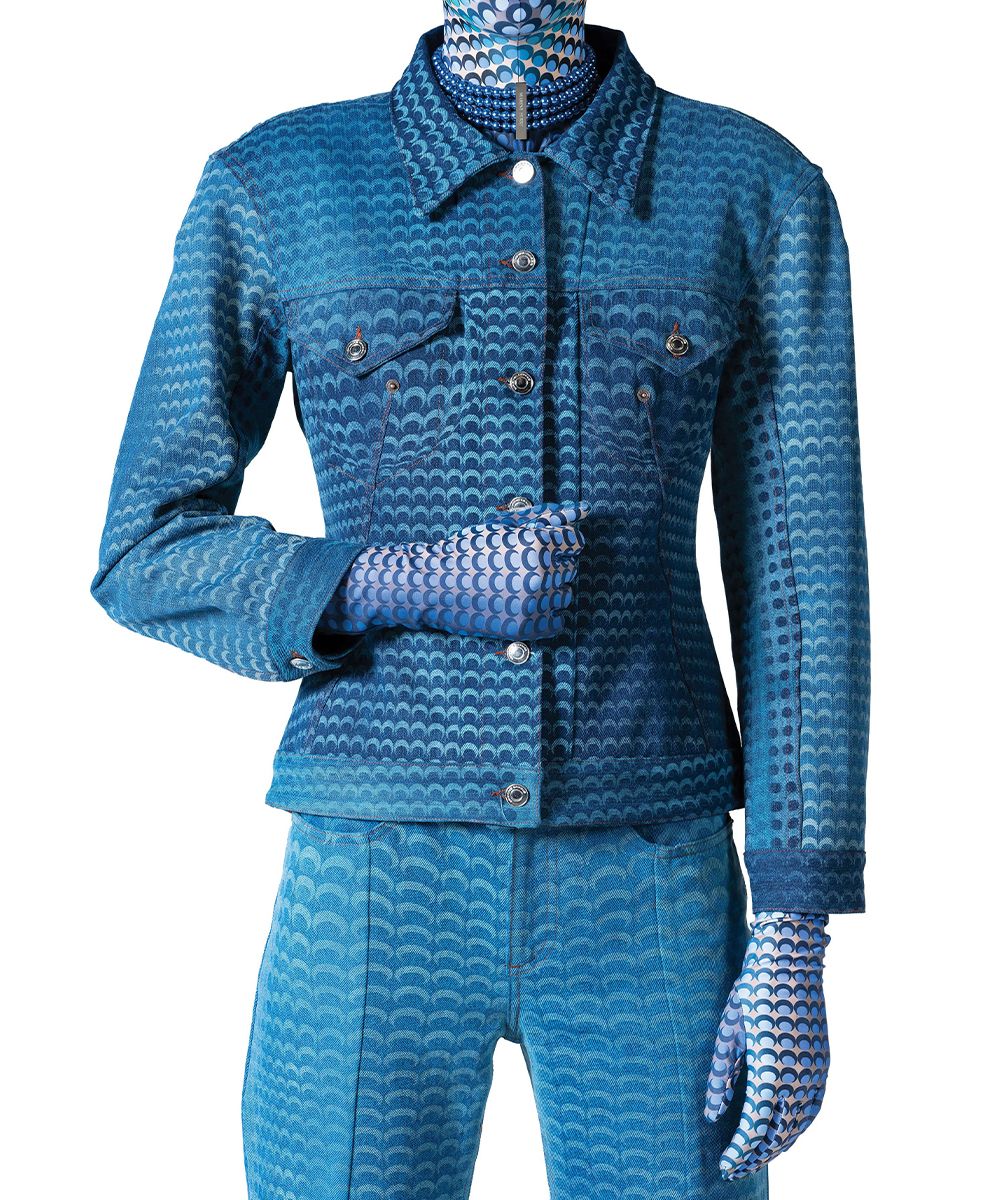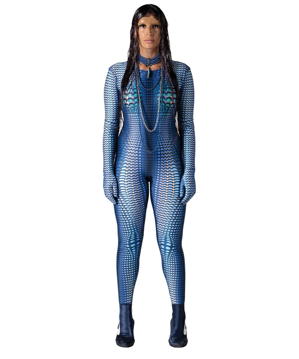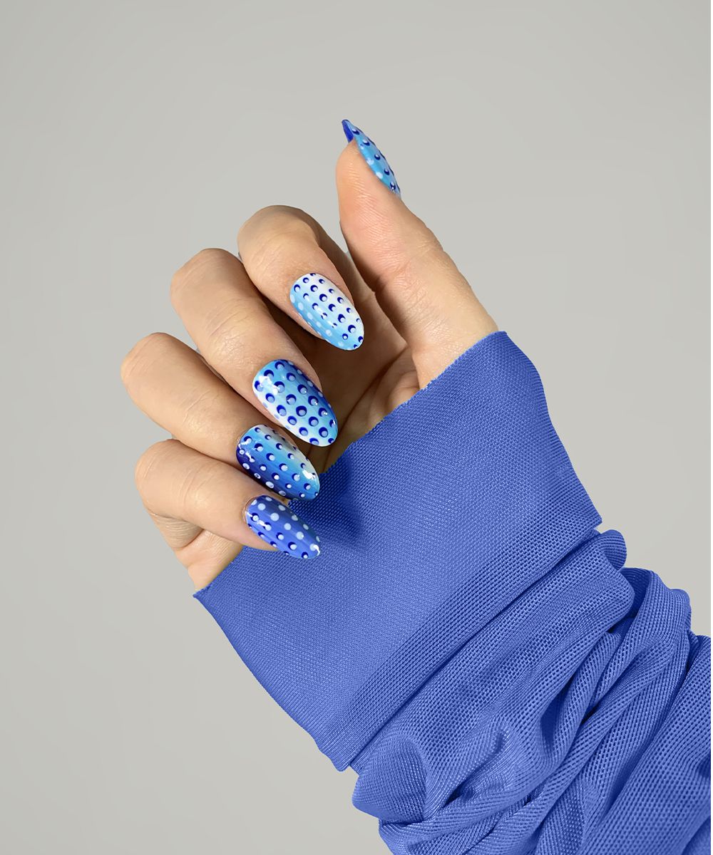 Marine Serre, nella sua collezione SS21 presentata attraverso un cortometraggio Amor Fati, veste la contemporaneità con un twist futuristico, fatto di una serie di pezzi funzionali realizzati in nylon biodegradabile, body second skin con la caratteristica luna crescente, declinati in una nuova palette che va dal blu elettrico al rosso ai più classici bianco, nero e marrone. L'inedito blu è anche protagonista della nail art ispirata alla collezione, decorato con il pattern-logo della luna all over.