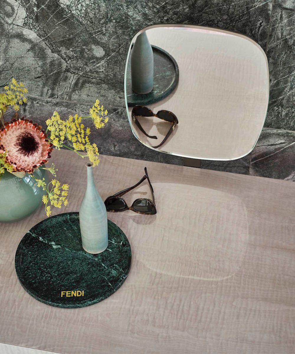 La rinomata tradizione ispirata alla selleria romana di Fendi ha poco meno di cento anni, e l’estensione lifestyle del marchio offre i prodotti in pelle più sofisticati, solitamente rifiniti a mano. La collezione 100% made in Italy è composta da materiali pregiati che decorano sontuosi divani in texture miste e tavoli in marmo in una tavolozza di colori neutri chic collaudata nel tempo, sui quali compare spesso il logo del brand.