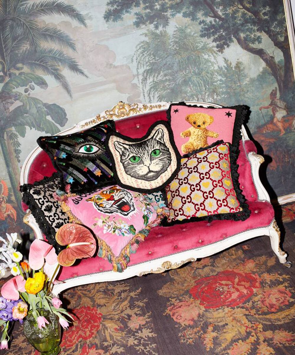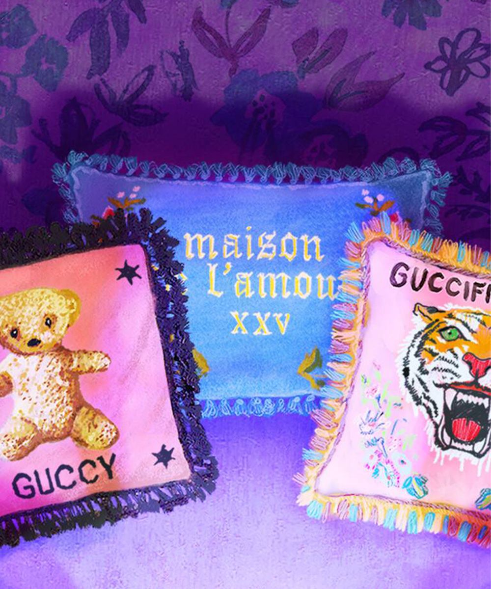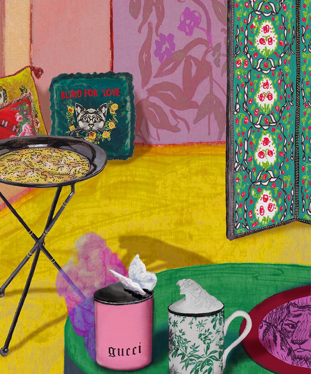 Il coloratissimo e sognante immaginario pop di Alessandro Michele per Gucci diventa un’alternativa per trasformare la propria zona living in un luogo di culto. Gucci Home è una collezione di arredamento e oggetti decorativi per interni che include candele profumate in vasetti di porcellana, sedie laccate, rivestite e ricamate, e pannelli specchiati decorati in legno e velluto. Il motivo floreale del brand, insieme al monogram e allo slogan “Guccification” regnano sovrani su cuscini ricamati con tigri e animali simbolici.