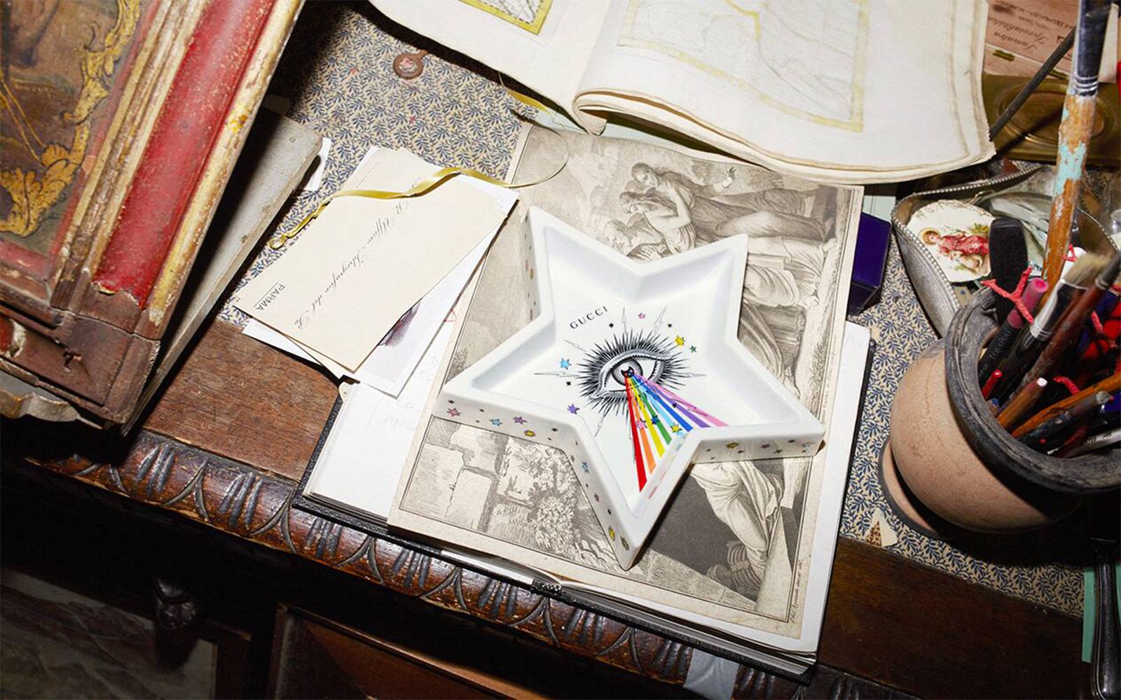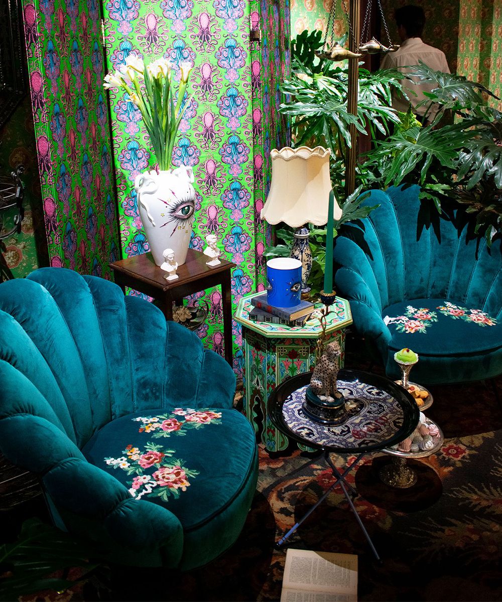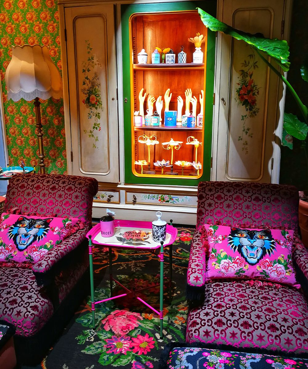 Il coloratissimo e sognante immaginario pop di Alessandro Michele per Gucci diventa un’alternativa per trasformare la propria zona living in un luogo di culto. Gucci Home è una collezione di arredamento e oggetti decorativi per interni che include candele profumate in vasetti di porcellana, sedie laccate, rivestite e ricamate, e pannelli specchiati decorati in legno e velluto. Il motivo floreale del brand, insieme al monogram e allo slogan “Guccification” regnano sovrani su cuscini ricamati con tigri e animali simbolici.