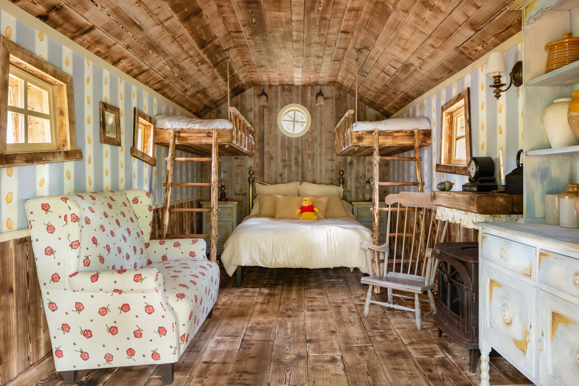 In collaborazione con Airbnb nasce così una struttura straordinaria che si ispira proprio ai racconti dello scrittore A.A. Milne, ambientati nel bosco dei Cento Acri. Si tratta di un alloggio indipendente che può ospitare quattro ospiti, grazie a un letto matrimoniale e a un soppalco con due lettini singoli. Pensatevi insomma con l'amica del cuore - ma in stile Winnie, Pimpi, Tigro e Ih-Oh per intenderci - ad un pigiama party alternativo e delizioso quanto un vasetto colmo di miele. La casa è interamente costruita con tronchi d'albero a vista, attorno all’ingresso che riporta incisa la scritta originale “Mr. Sanders” sulla porta. All'interno, la carta da parati è personalmente disegnata da Kim Raymond, e gli ospiti avranno a disposizione, nella credenza della cucina, scaffali colmi di barattoli di miele dorato.